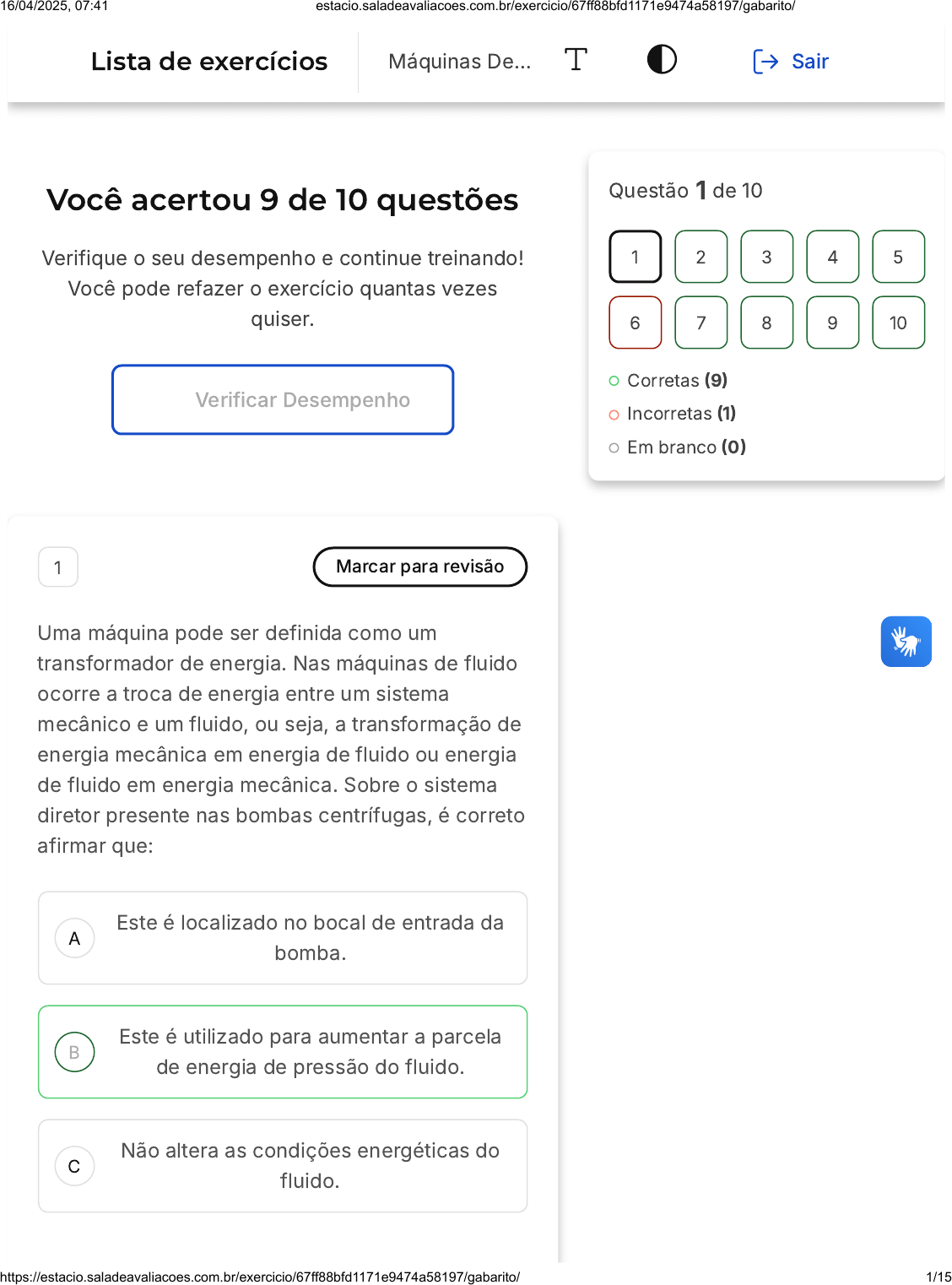 Você acertou 9 de 10 questões Verifique o seu desempenho e continue treinando! Você pode refazer o exercício quantas vezes quiser. Verificar Desempenho A B C 1 Marcar para revisão Uma máquina pode ser definida como um transformador de energia. Nas máquinas de fluido ocorre a troca de energia entre um sistema mecânico e um fluido, ou seja, a transformação de energia mecânica em energia de fluido ou energia de fluido em energia mecânica. Sobre o sistema diretor presente nas bombas centrífugas, é correto afirmar que: Este é localizado no bocal de entrada da bomba. Este é utilizado para aumentar a parcela de energia de pressão do fluido. Não altera as condições energéticas do fluido. Questão 1 de 10 Corretas (9) Incorretas (1) Em branco (0) 1 2 3 4 5 6 7 8 9 10 Lista de exercícios Máquinas De… Sair 16/04/2025, 07:41 estacio.saladeavaliacoes.com.br/exercicio/67ff88bfd1171e9474a58197/gabarito/ https://estacio.saladeavaliacoes.com.br/exercicio/67ff88bfd1171e9474a58197/gabarito/ 1/15 D E Este é utilizado para aumentar a parcela de energia de cinética do fluido. As bombas centrífugas não apresentam sistema diretor. Resposta correta Parabéns, você selecionou a alternativa correta. Confira o gabarito comentado! Gabarito Comentado A alternativa "Este é utilizado para aumentar a parcela de energia de pressão do fluido" está correta pois o sistema diretor das bombas centrífugas é responsável por transformar parte da energia cinética do fluido em energia de pressão. As demais alternativas estão erradas pois: O sistema diretor da bomba centrífuga é localizado após o rotor da bomba, seguindo até o bocal de saída. A não há aumento da energia cinética do fluido no sistema diretor, mas sim da energia de pressão. 2 Marcar para revisão Uma máquina pode ser definida como um transformador de energia. Nas máquinas de fluido ocorre a troca de energia entre um sistema mecânico e um fluido, ou seja, a transformação de energia mecânica em energia de fluido ou energia 16/04/2025, 07:41 estacio.saladeavaliacoes.com.br/exercicio/67ff88bfd1171e9474a58197/gabarito/ https://estacio.saladeavaliacoes.com.br/exercicio/67ff88bfd1171e9474a58197/gabarito/ 2/15 A B C D E de fluido em energia mecânica. Considere as seguintes afirmações sobre a voluta: I. O fim da voluta encontra o canal de saída da bomba centrífuga. II. A voluta tem geometria espiral que rodeia externamente o rotor da bomba centrífuga. III. A voluta tem como função amplificar a energia de pressão do fluido. Estão corretas, as afirmativas: II. I e III. II e III. I. I, II e III. Resposta correta Parabéns, você selecionou a alternativa correta. Confira o gabarito comentado! Gabarito Comentado Todas as afirmações estão corretas. A voluta compõe o sistema diretor para as bombas centrífugas. Este sistema é composto por uma geometria espiral posicionada no entorno do rotor da bomba que segue até seu bocal de 16/04/2025, 07:41 estacio.saladeavaliacoes.com.br/exercicio/67ff88bfd1171e9474a58197/gabarito/ https://estacio.saladeavaliacoes.com.br/exercicio/67ff88bfd1171e9474a58197/gabarito/ 3/15 A B C D E saída, amplificando a energia de pressão do fluido durante este trajeto. 3 Marcar para revisão Uma máquina pode ser definida como um transformador de energia. Nas máquinas de fluido ocorre a troca de energia entre um sistema mecânico e um fluido, ou seja, a transformação de energia mecânica em energia de fluido ou energia de fluido em energia mecânica. Sobre compressores alternativos, é correto afirmar que: A pressão possui uma alta variação entre seu canal de entrada e canal de saída. Não alteram o volume específico dos gases. Não alteram as condições de pressão dos gases. Alteram a pressão dos gases em um limite de 4.000kPa. São empregados em vazões acima de 10.000m³/h. 16/04/2025, 07:41 estacio.saladeavaliacoes.com.br/exercicio/67ff88bfd1171e9474a58197/gabarito/ https://estacio.saladeavaliacoes.com.br/exercicio/67ff88bfd1171e9474a58197/gabarito/ 4/15 Resposta correta Parabéns, você selecionou a alternativa correta. Confira o gabarito comentado! Gabarito Comentado A alternativa "A pressão possui uma alta variação entre seu canal de entrada e canal de saída." é a correta, pois os compressores alternativos são projetados para promover uma alta variação de energia de pressão ao fluido. As demais alternativas são incorretas pelas seguintes razões: os compressores alteram a massa específica dos fluidos de maneira significativa, o que não pode ser ignorado. Esses equipamentos apresentam uma grande variação de pressão entre seus canais de entrada e saída. A alteração de pressão dos fluidos pode atingir valores acima de 100.000kPa. Além disso, esses equipamentos são empregados para vazões de até 10.000m³/h, e não acima deste valor. 4 Marcar para revisão Uma máquina pode ser definida como um transformador de energia. Nas máquinas de fluido ocorre a troca de energia entre um sistema mecânico e um fluido, ou seja, a transformação de energia mecânica em energia de fluido ou energia de fluido em energia mecânica. Considere as seguintes afirmações sobre os distribuidores das turbinas: I. Estes são posicionados antes da chegada do fluido no rotor. 16/04/2025, 07:41 estacio.saladeavaliacoes.com.br/exercicio/67ff88bfd1171e9474a58197/gabarito/ https://estacio.saladeavaliacoes.com.br/exercicio/67ff88bfd1171e9474a58197/gabarito/ 5/15 A B C D E II. A Turbina Pelton não apresenta um distribuidor. III. A carcaça da Turbina Francis faz parte do sistema de distribuidores desta Turbina. Estão corretas, as afirmativas: I III I e III I e II II e III Resposta correta Parabéns, você selecionou a alternativa correta. Confira o gabarito comentado! Gabarito Comentado As afirmativas I e III estão corretas. A afirmativa I está correta porque os distribuidores são posicionados antes da chegada do fluido no rotor, para controlar a quantidade de fluido que chega ao