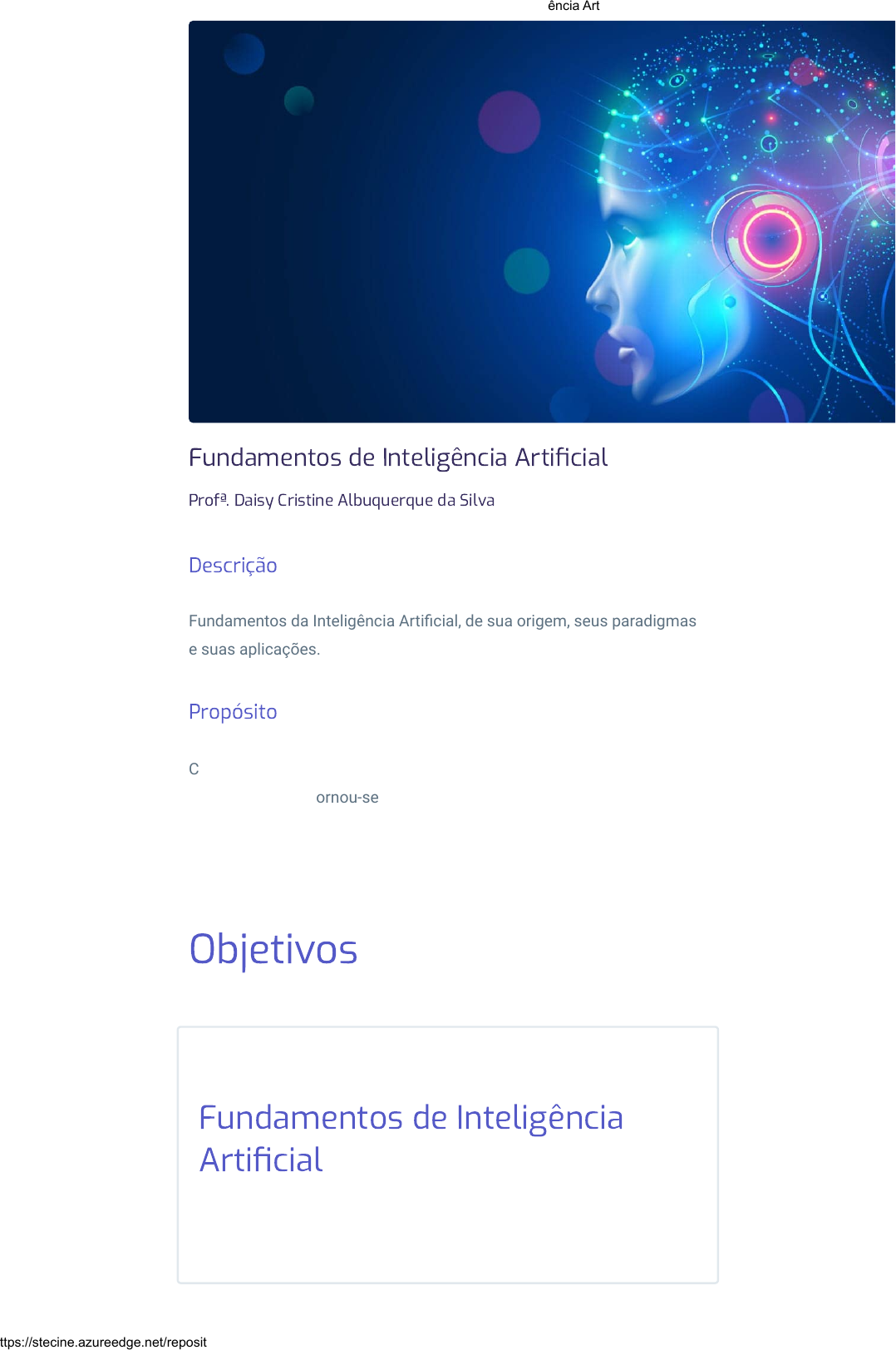Fundamentos de Inteligência Artificial Profª. Daisy Cristine Albuquerque da Silva Descrição Fundamentos da Inteligência Artificial, de sua origem, seus paradigmas e suas aplicações. Propósito Compreender o funcionamento da Inteligência Artificial, já tão inserida em nossa rotina, tornou-se essencial para os profissionais de Tecnologia da Informação (TI) na escolha do algoritmo mais adequado à solução do problema a ser tratado. Objetivos Módulo 1 Fundamentos de Inteligência Artificial Reconhecer os fundamentos de Inteligência Artificial. 4/9/25, 3:08 PM Fundamentos de Inteligência Artificial https://stecine.azureedge.net/repositorio/00212ti/04151/index.html?brand=estacio# 1/59 Módulo 2 Paradigmas da Inteligência Artificial Identificar os paradigmas da Inteligência Artificial. Módulo 3 Aplicações da Inteligência Artificial Distinguir as aplicações de Inteligência Artificial. A Inteligência Artificial é um termo sobre o qual sempre ouvimos falar, mas você sabe o que realmente significa? Para que você possa compreender, vamos estudar os fundamentos da Inteligência Artificial (IA). Para isso, inicialmente, conheceremos a história da Inteligência Artificial desde a sua criação, por volta dos anos 1950, até os dias de hoje. Ao percorrer sua linha do tempo, será possível conhecer também outras tecnologias que surgiram e tornaram factível a implementação dos algoritmos de Inteligência Artificial. Em seguida, entenderemos melhor o significado dos termos que são largamente empregados em IA. Compreenderemos que IA envolve uma solução, ou melhor, um conjunto de soluções que emprega várias tecnologias, como redes neurais artificiais, algoritmos de busca avançada, sistemas de aprendizado, entre outros que possuem o poder de simular capacidades humanas relacionadas com à inteligência, como, por exemplo, o raciocínio, a percepção de ambiente, além da habilidade de análise para a tomada de decisão. Introdução 4/9/25, 3:08 PM Fundamentos de Inteligência Artificial https://stecine.azureedge.net/repositorio/00212ti/04151/index.html?brand=estacio# 2/59 Desvendando a Inteligência Artificial Assista, no vídeo a seguir, a uma visão geral a respeito da Inteligência Artificial. A definição de IA está relacionada à capacidade de máquinas realizarem atividades de modo inteligente. E para realizar essas atividades, a IA utiliza métodos que se dividem em paradigmas que conheceremos desde o seu surgimento, abordando suas características, o seu emprego no meio acadêmico e na área de negócios. Por último, apresentaremos os campos em que a IA pode ser empregada. Por ser uma tecnologia que aprende sozinha, a IA utiliza o aprendizado de máquina para analisar grandes volumes de dados e, assim, possibilitar a ampliação de seus conhecimentos. Dessa modo, foi possível aplicá-la em várias áreas especialistas em atividades que anteriormente eram apenas realizadas por humanos. 4/9/25, 3:08 PM Fundamentos de Inteligência Artificial https://stecine.azureedge.net/repositorio/00212ti/04151/index.html?brand=estacio# 3/59 1 - Fundamentos de Inteligência Artificial Ao final deste módulo, você será capaz de reconhecer os fundamentos de Inteligência Artificial. Ligando os pontos Teste de Turing, saberíamos identificar se é máquina ou humano? Em meados dos anos 1950, Alan Turing, matemático, cientista da computação e criptógrafo inglês, também considerado o pai da computação, publicou o artigo Máquinas Computacionais e Inteligentes. No seu artigo, Turing fala da capacidade de as máquinas pensarem ou simularem a inteligência humana. O cientista criou um teste capaz de analisar se uma máquina é ou não inteligente ao se passar por um humano. O teste de Turing segue a mesma lógica do jogo da imitação. O jogo é composto por três pessoas: um intermediador, um homem e uma mulher. O intermediador tenta identificar quem é o homem e quem é a mulher por meio de perguntas. Toda a interação é realizada através do chat, isto é, deve ser feita de maneira escrita e mediante um computador. A configuração inicial corresponde a uma comunicação mediada por computador. No caso do teste de Turing, os três participantes são: dois humanos e uma máquina. Um dos humanos é o intermediador, que fica conversando com os outros dois sem saber quem é a máquina e quem é o humano. O intermediador faz perguntas simples e escritas que devem ser respondidas pela máquina e pelo humano também de forma simples 4/9/25, 3:08 PM Fundamentos de Inteligência Artificial https://stecine.azureedge.net/repositorio/00212ti/04151/index.html?brand=estacio# 4/59 e escrita. Se após cinco minutos de questionamento o intermediador não conseguir distinguir quem é a máquina e quem é o humano, a máquina passa no teste. Em 2014, 60 anos após a morte de Alan Turing, uma máquina criada pela equipe russa se passou por um pré-adolescente ucraniano de 13 anos, chamado Eugene Goostman. Os programadores russos Sergey Ulasen, Eugene Demchenko e Vaselov da área de Inteligência Artificial são os responsáveis por dar personalidade a Eugene. Assim, para passar pelo teste de Turing, Eugene foi colocado para dialogar durante cinco minutos com uma banca de jurados na Universidade de Reading, em Londres. Eugene foi capaz de demonstrar naturalidade e personalidade coerentes a de um jovem de 13 anos, enganando 33% do júri nesse tempo e passando no teste de Turing. Após a leitura do caso, é hora de aplicar seus conhecimentos! Vamos ligar esses pontos? Questão 1 A Inteligência Artificial é um ramo da ciência da computação que tem o intuito de fazer com que as máquinas se comportem de forma inteligente. No caso em tela, uma máquina se passa por humano durante a execução do teste de Turing. Quais são os elementos fundamentais para que a máquina se passe por humano? Parabéns! A alternativa D está correta. A Inteligência Artificial não possui o único objeti