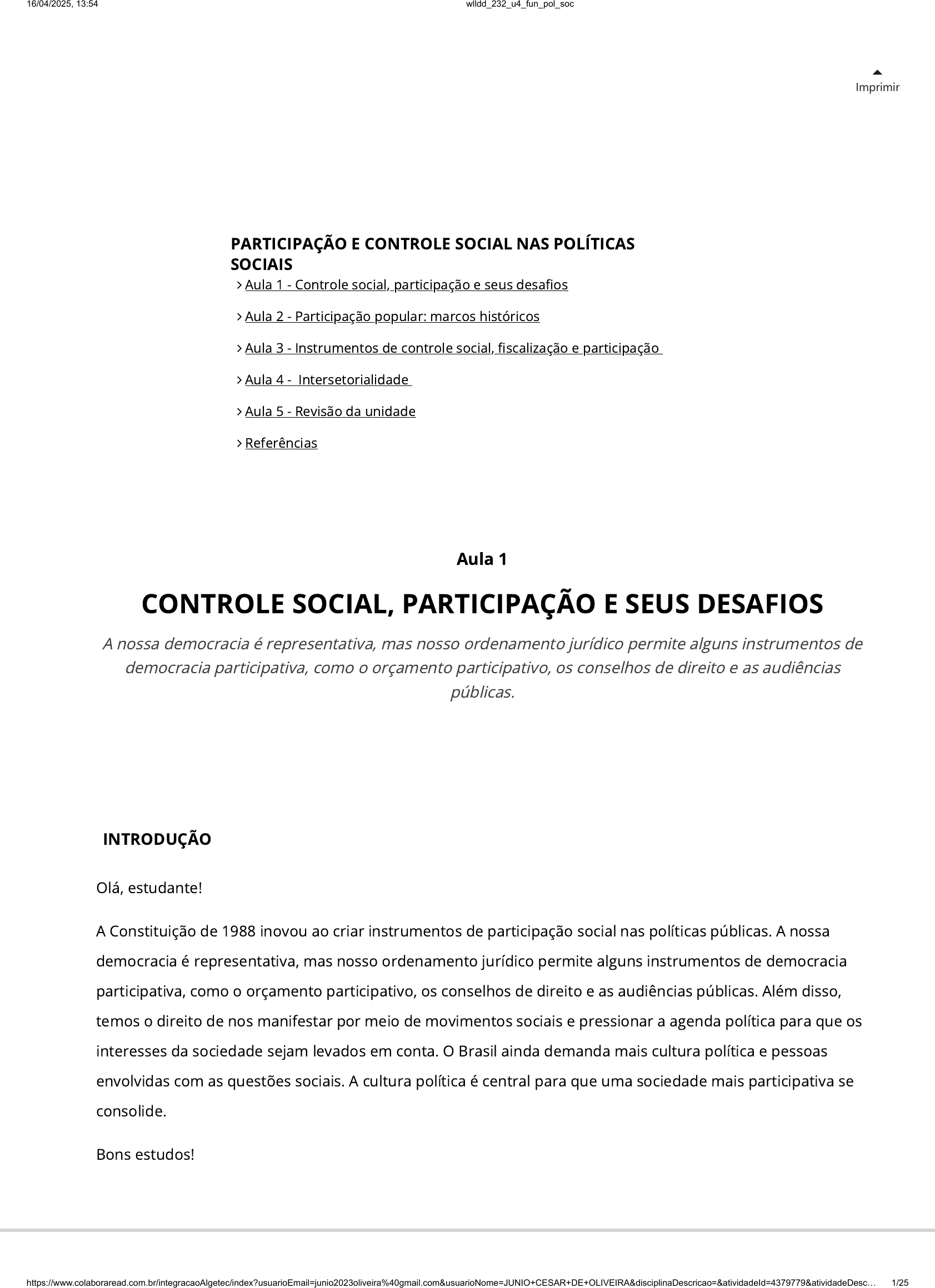 Imprimir INTRODUÇÃO Olá, estudante! A Constituição de 1988 inovou ao criar instrumentos de participação social nas políticas públicas. A nossa democracia é representativa, mas nosso ordenamento jurídico permite alguns instrumentos de democracia participativa, como o orçamento participativo, os conselhos de direito e as audiências públicas. Além disso, temos o direito de nos manifestar por meio de movimentos sociais e pressionar a agenda política para que os interesses da sociedade sejam levados em conta. O Brasil ainda demanda mais cultura política e pessoas envolvidas com as questões sociais. A cultura política é central para que uma sociedade mais participativa se consolide. Bons estudos! Aula 1 CONTROLE SOCIAL, PARTICIPAÇÃO E SEUS DESAFIOS A nossa democracia é representativa, mas nosso ordenamento jurídico permite alguns instrumentos de democracia participativa, como o orçamento participativo, os conselhos de direito e as audiências públicas. PARTICIPAÇÃO E CONTROLE SOCIAL NAS POLÍTICAS SOCIAIS Aula 1 - Controle social, participação e seus desafios Aula 2 - Participação popular: marcos históricos Aula 3 - Instrumentos de controle social, fiscalização e participação Aula 4 - Intersetorialidade Aula 5 - Revisão da unidade Referências 16/04/2025, 13:54 wlldd_232_u4_fun_pol_soc https://www.colaboraread.com.br/integracaoAlgetec/index?usuarioEmail=junio2023oliveira%40gmail.com&usuarioNome=JUNIO+CESAR+DE+OLIVEIRA&disciplinaDescricao=&atividadeId=4379779&atividadeDesc… 1/25 CONTROLE SOCIAL DE POLÍTICAS PÚBLICAS O controle social de políticas sociais é um mecanismo fundamental para garantir a participação da sociedade na formulação, implementação e avaliação das políticas públicas voltadas para a promoção do bem-estar social. Trata-se de um processo no qual os cidadãos, por meio de diferentes formas de organização e participação, exercem vigilância, monitoramento e influência sobre as políticas e ações do Estado. O controle social tem como objetivo principal assegurar a transparência, a efetividade e a adequação das políticas sociais, bem como combater a corrupção e o mau uso dos recursos públicos. Para isso, é essencial que a sociedade tenha acesso a informações relevantes sobre as políticas, programas e serviços sociais, além de participar ativamente na tomada de decisões e no acompanhamento de sua implementação. Esse processo de controle social pode ocorrer de diversas maneiras, incluindo a participação em conselhos, fóruns, audiências públicas, comissões, ou por meio da atuação de organizações da sociedade civil, como movimentos sociais, sindicatos, associações de moradores, conselhos de direitos, orçamentos participativos, entre outros. Essas instâncias proporcionam espaços de diálogo entre o Estado e a sociedade civil, permitindo que as demandas e necessidades dos cidadãos sejam levadas em consideração na elaboração das políticas públicas (GOMES; ORFÃO, 2021). O controle social também contribui para a democratização das relações de poder, promovendo a participação ativa dos cidadãos no processo decisório e na fiscalização das ações governamentais. Por meio desse processo, os cidadãos têm a oportunidade de se informar, debater, questionar e propor alternativas para melhorar as políticas sociais, garantindo que elas atendam efetivamente às demandas da população e promovam a justiça social (GOMES; ORFÃO, 2021). Além disso, o controle social fortalece a accountability, ou seja, a responsabilização dos agentes públicos perante a sociedade. Ao exercerem o controle sobre as políticas sociais, os cidadãos podem exigir transparência na gestão dos recursos, cobrar a prestação de contas dos gestores públicos e denunciar práticas indevidas ou irregularidades (GOMES; ORFÃO, 2021) Em resumo, o controle social de políticas sociais é um mecanismo de participação cidadã que visa a promover a transparência, a efetividade e a responsabilidade nas políticas públicas. Por meio desse processo, a sociedade civil desempenha um papel ativo na construção de uma sociedade mais justa e igualitária, contribuindo para a melhoria das condições de vida e para o fortalecimento da democracia. Uma das mais importantes formas de controle social no Brasil são os Conselhos de Direito, os quais são instâncias de participação e controle social com objetivo principal de formulação, acompanhamento e fiscalização das políticas públicas relacionadas a determinada área específica, com foco na defesa e promoção dos direitos. Esses conselhos são compostos por representantes da sociedade civil e do poder público, e atuam de forma consultiva, deliberativa e fiscalizadora. Os Conselhos de Direito podem abranger diferentes áreas, como direitos da criança e do adolescente, direitos humanos, igualdade racial, pessoa idosa, pessoa com deficiência, mulheres, LGBT+, entre outros. Cada conselho é responsável por discutir e propor diretrizes, normas e ações que garantam a efetivação dos 16/04/2025, 13:54 wlldd_232_u4_fun_pol_soc https://www.colaboraread.com.br/integracaoAlgetec/index?usuarioEmail=junio2023oliveira%40gmail.com&usuarioNome=JUNIO+CESAR+DE+OLIVEIRA&disciplinaDescricao=&atividadeId=4379779&atividadeDesc… 2/25 direitos estabelecidos na legislação. 16/04/2025, 13:54 wlldd_232_u4_fun_pol_soc https://www.colaboraread.com.br/integracaoAlgetec/index?usuarioEmail=junio2023oliveira%40gmail.com&usuarioNome=JUNIO+CESAR+DE+OLIVEIRA&disciplinaDescricao=&atividadeId=4379779&atividadeDesc… 3/25 MOVIMENTOS SOCIAIS Movimentos sociais são organizações coletivas formadas por grupos de indivíduos que se unem em torno de causas e objetivos comuns, visando a promover mudanças sociais, políticas, econômicas ou culturais. Esses movimentos surgem como resposta às demandas e insatisfações da sociedade em relação a questões específicas, como direitos humanos, 