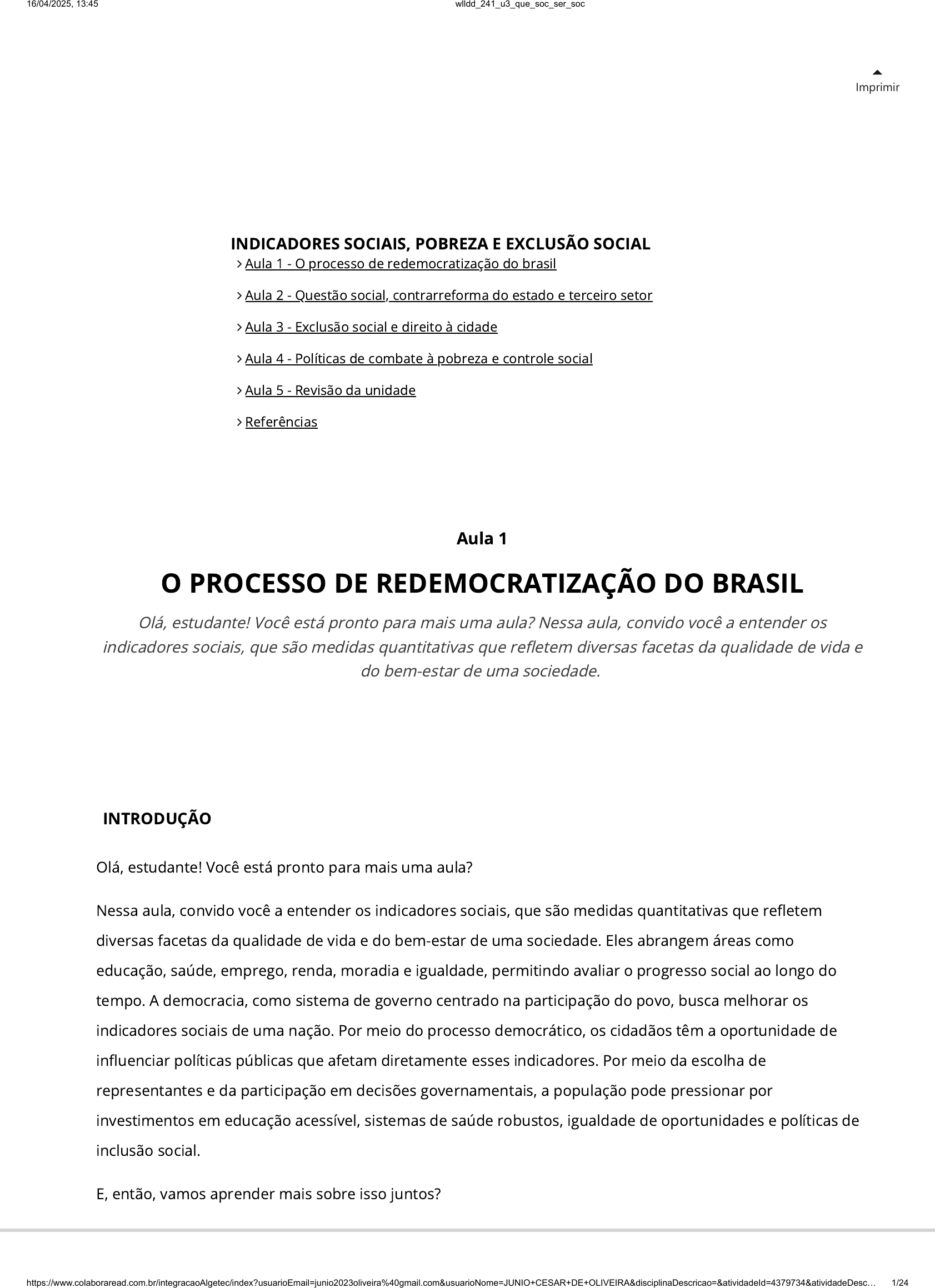 Imprimir INTRODUÇÃO Olá, estudante! Você está pronto para mais uma aula? Nessa aula, convido você a entender os indicadores sociais, que são medidas quantitativas que refletem diversas facetas da qualidade de vida e do bem-estar de uma sociedade. Eles abrangem áreas como educação, saúde, emprego, renda, moradia e igualdade, permitindo avaliar o progresso social ao longo do tempo. A democracia, como sistema de governo centrado na participação do povo, busca melhorar os indicadores sociais de uma nação. Por meio do processo democrático, os cidadãos têm a oportunidade de influenciar políticas públicas que afetam diretamente esses indicadores. Por meio da escolha de representantes e da participação em decisões governamentais, a população pode pressionar por investimentos em educação acessível, sistemas de saúde robustos, igualdade de oportunidades e políticas de inclusão social. E, então, vamos aprender mais sobre isso juntos? Aula 1 O PROCESSO DE REDEMOCRATIZAÇÃO DO BRASIL Olá, estudante! Você está pronto para mais uma aula? Nessa aula, convido você a entender os indicadores sociais, que são medidas quantitativas que refletem diversas facetas da qualidade de vida e do bem-estar de uma sociedade. INDICADORES SOCIAIS, POBREZA E EXCLUSÃO SOCIAL Aula 1 - O processo de redemocratização do brasil Aula 2 - Questão social, contrarreforma do estado e terceiro setor Aula 3 - Exclusão social e direito à cidade Aula 4 - Políticas de combate à pobreza e controle social Aula 5 - Revisão da unidade Referências 16/04/2025, 13:45 wlldd_241_u3_que_soc_ser_soc https://www.colaboraread.com.br/integracaoAlgetec/index?usuarioEmail=junio2023oliveira%40gmail.com&usuarioNome=JUNIO+CESAR+DE+OLIVEIRA&disciplinaDescricao=&atividadeId=4379734&atividadeDesc… 1/24 INDICADORES SOCIAIS E DEMOCRACIA Estudante, durante o período da ditadura militar, que se estendeu por cerca de duas décadas no Brasil, a ampliação da desigualdade social foi uma característica marcante. Esse regime autoritário não apenas restringiu as liberdades civis e políticas, mas também promoveu políticas econômicas que resultaram em um aumento da disparidade entre as classes sociais. Uma das consequências diretas dessa desigualdade foi o arrocho salarial imposto aos trabalhadores, o que teve um impacto profundo na classe operária e contribuiu para a luta pela democratização. Lara e Silva (2015) apontam que o arrocho salarial foi uma política econômica adotada pelo regime militar com o objetivo de controlar a inflação e estabilizar as finanças públicas. No entanto, essa medida teve efeitos prejudiciais sobre os trabalhadores e suas condições de vida. Os salários foram mantidos em níveis baixos, muitas vezes abaixo da inflação, o que resultou em perda de poder de compra e deterioração das condições de vida da classe trabalhadora. Esse cenário agravou a desigualdade social, pois os custos do ajuste econômico recaíram de forma desproporcional sobre os ombros dos mais vulneráveis. A ampliação da desigualdade social e o arrocho salarial não apenas geraram insatisfação, mas também impulsionaram a classe operária a se mobilizar e lutar por mudanças. O contexto de dificuldades econômicas, combinado com a repressão política, levou os trabalhadores a reconhecerem que seus direitos estavam sendo negligenciados e que a falta de participação nas decisões políticas estava agravando sua situação. Nesse contexto, a luta pela democratização tornou-se uma demanda central (LARA; SILVA, 2015). Os indicadores sociais desempenharam um papel crucial nesse cenário. Enquanto os indicadores de qualidade de vida, como renda, emprego, acesso à educação e saúde, pioravam devido ao arrocho salarial e à falta de investimentos públicos adequados, os indicadores de desigualdade social dispararam. A disparidade entre os estratos sociais tornou-se visível e tangível para a população, exacerbando a sensação de injustiça e incentivando ainda mais a mobilização em prol da democratização (LARA; SILVA, 2015). A democracia, vista como um sistema de governo que assegura a participação dos cidadãos nas decisões políticas e promove direitos e liberdades fundamentais, passou a ser percebida como a solução para reverter os impactos negativos do período ditatorial. A luta pela democratização não se limitava apenas à busca por eleições livres, mas também à melhoria dos indicadores sociais que haviam sido negligenciados. Os trabalhadores e a sociedade civil uniram forças para pressionar por políticas econômicas mais justas, investimentos em serviços públicos de qualidade e o respeito aos direitos trabalhistas (LARA; SILVA, 2015). Estudante, lembre-se que a ampliação da desigualdade social na ditadura militar, associada ao arrocho salarial imposto à classe operária, criou um ambiente propício para a mobilização e luta pela democratização. Os indicadores sociais desfavoráveis evidenciaram as consequências prejudiciais dessas políticas, impulsionando os trabalhadores a demandar mudanças estruturais que só poderiam ser alcançadas por meio de um sistema democrático. A história demonstra como a interseção entre desigualdade, indicadores sociais e participação política pode moldar o curso de um país em direção a um futuro mais equitativo e inclusivo. 16/04/2025, 13:45 wlldd_241_u3_que_soc_ser_soc https://www.colaboraread.com.br/integracaoAlgetec/index?usuarioEmail=junio2023oliveira%40gmail.com&usuarioNome=JUNIO+CESAR+DE+OLIVEIRA&disciplinaDescricao=&atividadeId=4379734&atividadeDesc… 2/24 INDICADORES SOCIAIS E DEMOCRACIA Estudante, indicadores sociais são medidas quantitativas que fornecem informações sobre diversas dimensões da vida das pessoas em uma sociedade. Eles refletem o nível de desenvolvimento, bem-estar e qualidade de vida de uma população. Esses indicadores podem abranger áreas como educação, saúde, renda, habitação, 