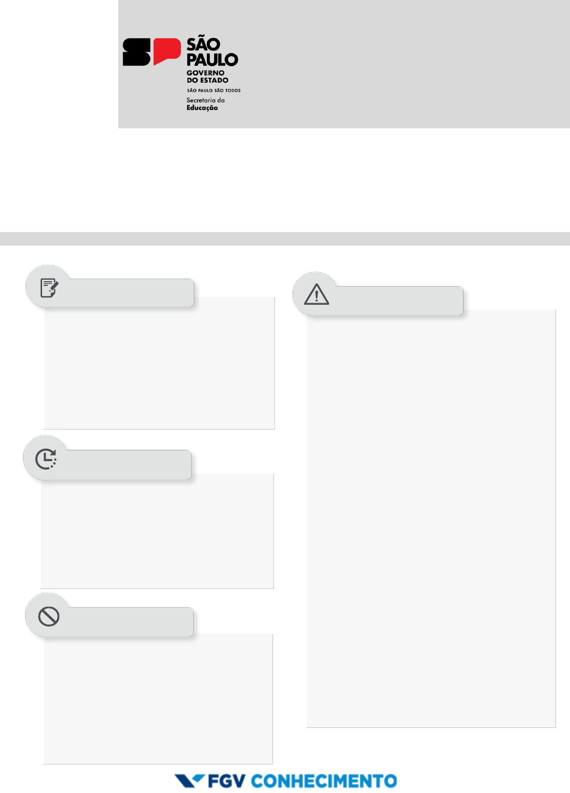 <p>SECRETARIA DE ESTADO DE</p><p>EDUCAÇÃO DE SÃO PAULO</p><p>COORDENADORIA DE GESTÃO DE RECURSOS HUMANOS</p><p>PROCESSO SELETIVO SIMPLIFICADO PARA CONTRATAÇÃO TEMPORÁRIA DE</p><p>DOCENTES PARA A EDUCAÇÃO PROFISSIONAL</p><p>MANHÃ</p><p>PROFESSOR DE ENSINO FUNDAMENTAL E MÉDIO (EDUCAÇÃO PROFISSIONAL)</p><p>PROVA 1 - GESTÃO E NEGÓCIOS</p><p>(CURSOS DE ADMINISTRAÇÃO LOGÍSTICA E VENDAS)</p><p>NÍVEL SUPERIOR TIPO 1 – BRANCA</p><p>Atenção: a frase a seguir deverá ser transcrita no espaço reservado do seu cartão de resposta, com sua caligrafia usual, considerando</p><p>as letras maiúsculas e minúsculas.</p><p>Viver e não ter a vergonha de ser feliz.</p><p>• Além deste caderno contendo 30 (trinta)</p><p>questões objetivas e 1 (uma) questão</p><p>dissertativa, você receberá do fiscal de prova o</p><p>cartão de respostas e a folha de textos definitivos;</p><p>• As questões objetivas têm 5 (cinco) opções de</p><p>resposta (A, B, C, D e E) e somente uma delas está</p><p>correta;</p><p>• A questão discursiva deverá ser respondida em até</p><p>20 (vinte) linhas.</p><p>•</p><p>• Verifique se seu caderno de questões está completo,</p><p>sem repetição de questões ou falhas. Caso contrário,</p><p>notifique imediatamente o fiscal da sala, para que</p><p>sejam tomadas as devidas providências;</p><p>• Confira seus dados pessoais, especialmente nome,</p><p>número de inscrição e documento de identidade e leia</p><p>atentamente as instruções para preencher o cartão de</p><p>respostas;</p><p>• Para o preenchimento do cartão de respostas, use</p><p>somente caneta esferográfica, fabricada em material</p><p>transparente, com tinta preta ou azul;</p><p>• Assine seu nome apenas no(s) espaço(s) reservado(s)</p><p>no cartão de respostas;</p><p>• Confira seu cargo, cor e tipo do caderno de questões.</p><p>Caso tenha recebido caderno de cargo ou cor ou tipo</p><p>diferente do impresso em seu cartão de respostas, o</p><p>fiscal deve ser obrigatoriamente informado para o</p><p>devido registro na ata da sala;</p><p>• Reserve tempo suficiente para o preenchimento do seu</p><p>cartão de respostas. O preenchimento é de sua</p><p>responsabilidade e não será permitida a troca do</p><p>cartão de respostas em caso de erro cometido</p><p>pelo candidato;</p><p>• Para fins de avaliação, serão levadas em consideração</p><p>apenas as marcações realizadas no cartão de</p><p>respostas;</p><p>• A FGV coletará as impressões digitais dos candidatos</p><p>na lista de presença;</p><p>• Os candidatos serão submetidos ao sistema de</p><p>detecção de metais quando do ingresso e da saída de</p><p>sanitários durante a realização das provas.</p><p>• Boa sorte!</p><p>• Você dispõe de 3 (três) horas para a realização</p><p>da prova, já incluído o tempo para a marcação do</p><p>cartão de respostas;</p><p>• 2 (duas) horas após o início da prova, é possível</p><p>retirar-se da sala, sem levar o caderno de questões;</p><p>• A partir dos 30 minutos anteriores ao término da</p><p>prova é possível retirar-se da sala levando o</p><p>caderno de questões.</p><p>• Qualquer tipo de comunicação entre os candidatos</p><p>durante a aplicação da prova;</p><p>• Anotar informações relativas às respostas em</p><p>qualquer outro meio que não seja o caderno de</p><p>questões;</p><p>• Levantar da cadeira sem autorização do fiscal de</p><p>sala;</p><p>• Usar o sanitário ao término da prova, após deixar</p><p>a sala.</p><p>SUA PROVA</p><p>TEMPO</p><p>NÃO SERÁ PERMITIDO</p><p>INFORMAÇÕES GERAIS</p><p>PSS SEDUC-SP FGV CONHECIMENTO</p><p>PROVA 1 - GESTÃO E NEGÓCIOS (CURSOS DE ADMINISTRAÇÃO LOGÍSTICA E VENDAS) TIPO BRANCA – PÁGINA 2</p><p>Conteúdo Geral</p><p>Conhecimentos Didáticos-Pedagógicos</p><p>1</p><p>A Resolução CNE/CP Nº 1 de 2021, que estabelece as Diretrizes</p><p>Curriculares Gerais para a Educação Profissional e Tecnológica,</p><p>determina as formas como os cursos técnicos de nível médio</p><p>devem ser desenvolvidos. A forma de desenvolvimento voltada</p><p>exclusivamente aos indivíduos que já concluíram o Ensino Médio é</p><p>denominada</p><p>(A) concomitante intercomplementar.</p><p>(B) concomitante.</p><p>(C) integrada.</p><p>(D) subsequente.</p><p>(E) subsequente intercomplementar.</p><p>2</p><p>A Lei nº 8.069, de 1990, que dispõe sobre o Estatuto da Criança e</p><p>do Adolescente, determina em seu capítulo V, Art. 63, os princípios</p><p>para a formação técnico-profissional, relacionados a seguir:</p><p>I. garantia de acesso e frequência obrigatória ao ensino regular;</p><p>II. atividade compatível com o desenvolvimento do adolescente;</p><p>III. horário complementar obrigatório para o exercício de</p><p>atividades remuneradas.</p><p>Estão corretamente expressos os princípios contidos</p><p>(A) nos itens I, II e III.</p><p>(B) nos itens I e II.</p><p>(C) nos itens II e III.</p><p>(D) nos itens I e III.</p><p>(E) apenas no item II.</p><p>3</p><p>De acordo com a BNCC (Base Nacional Comum Curricular) do</p><p>Ensino Médio, a organização dessa etapa da Educação Básica por</p><p>áreas de conhecimento tem por finalidade ____________ dois ou</p><p>mais componentes do currículo, para melhor compreender e</p><p>____________ uma realidade complexa. Tal organização deve</p><p>contribuir para a integração dos conhecimentos, entendida como</p><p>condição para a ____________ de sentidos aos conceitos e</p><p>conteúdos estudados nas escolas.</p><p>Os termos que, em sequência, completam corretamente essas</p><p>lacunas são:</p><p>(A) organizar, aceitar, definição.</p><p>(B) integrar, aceitar, ressignificação.</p><p>(C) integrar, transformar, atribuição.</p><p>(D) organizar, transformar, atribuição.</p><p>(E) adaptar, reverter, ressignificação.</p><p>4</p><p>A carga horária total do Ensino Médio, conforme disposto na Lei</p><p>nº 9394/96, após a