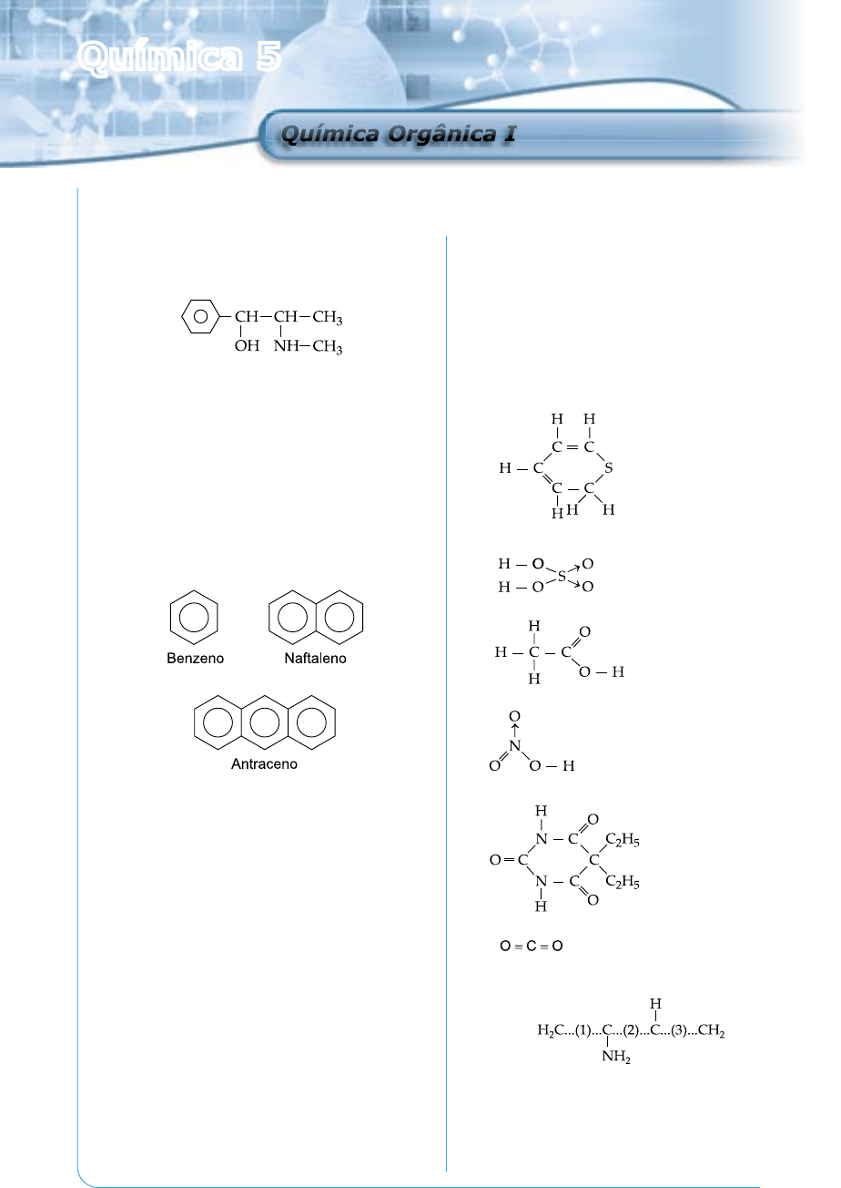 45 PV 2 D -0 6 -Q U I- 5 4 Química 5 Química Orgânica IQuímica Orgânica I Capítulo 1 0 1. PUCCamp -SP Na Copa do Mundo, uma das substâncias responsá- veis pela eliminação de Maradona foi a efedrina Qual a fórmula molecular dessa substância? a) C10H12NO d) C10H10NO b) C10H20NO e) C9H10NO c) C10H15NO 0 2. UERJ O Ministério da Saúde adverte: fumar pode causar câncer de pulmão. Um dos responsáveis por esse mal causado pelo cigarro é o alcatrão, que corresponde a uma mistura de substâncias aromáticas, entre elas o benzeno, naftaleno e antraceno. As fórmulas moleculares dos três hidrocarbonetos citados são, respectivamente: a) C6H12, C12H12, C18H20 b) C6H12, C12H10, C18H18 c) C6H6, C10H10, C14H14 d) C6H6, C10H8, C14H10 0 3. UFPR A respeito dos compostos orgânicos, é correto afi rmar que: ( ) os compostos orgânicos podem ser sintetizados pelos organismos vivos, daí a qualifi cação de orgânicos. ( ) os compostos orgânicos são compostos de car- bono, embora algumas substâncias que contêm esse elemento sejam estudadas também entre os compostos inorgânicos (CO2, HCN etc.). ( ) a existência de um grande número de compostos de carbono está relacionada com a capacidade do átomo de carbono de formar cadeias, associada à sua tetracovalência. ( ) nos compostos de carbono, o tipo de ligação mais freqüente é a covalente. ( ) os compostos orgânicos são regidos por leis e princípios próprios não aplicáveis aos compostos inorgânicos. 04. UFSC Assinale, abaixo, o(s) composto(s) tipicamente orgânico(s). 01. 02. 04. 08. 16. 32. 05. UFC-CE Na estrutura , as ligações representadas pelos algarismos são, respectivamente: a) simples, dupla, simples. b) dupla, simples, dupla. c) simples, tripla, dupla. d) dupla, tripla, simples. 46 06. UESPI Complete as ligações simples, duplas e triplas que estão faltando nas seguintes estruturas: I. II. III. No total, teremos: a) 17 ligações simples, 4 duplas e 3 triplas. b) 19 ligações simples, 3 duplas e 3 triplas. c) 20 ligações simples, 4 duplas e 2 triplas. d) 18 ligações simples, 5 duplas e 2 triplas. e) 22 ligações simples, 3 duplas e 2 triplas. 07. PUC-RJ Uma forma de verificar se um composto apresenta dupla-ligação carbono-carbono (C=C) é reagi-lo com soluções diluídas de permanganato de potássio (uma solução violeta), pois essas causam o seu descoramen- to. Assim, das possibilidades abaixo, assinale aquela que contém apenas compostos que vão descorar uma solução diluída de permanganato de potássio. a) CH3CH2CH3 e CH3CH2CH2OH b) CH3CHCH2 e CH3CH2CH2OH c) CH3CHCH2 e CH3COCH3 d) CH3CH2CH3 e CH3COCH3 e) CH3CHCH2 e CH2CHCH2OH 08. Mackenzie-SP O número de átomos de hidrogênio que completam as ligações em uma molécula da substância metil-1,3- butadieno é: a) 12 d) 08 b) 05 e) 06 c) 07 09. Mackenzie-SP O inseticida dicloro-difenil-tricloroetano (DDT), cuja fórmula estrutural é: apresenta: a) três carbonos terciários. b) somente carbonos secundários. c) um carbono quaternário. d) somente carbonos primários. e) somente um carbono terciário. 10. No eugenol, composto de odor agradável de fórmula: e utilizado como anti-séptico bucal, o número de áto- mos de carbono secundário é: a) 02 d) 03 b) 07 e) 08 c) 10 11. Fuvest-SP A vitamina K3 pode ser representada pela fórmula a seguir. Quantos átomos de carbono e quantos de hidrogênio existem em uma molécula desse composto? a) 1 e 3 d) 11 e 8 b) 3 e 3 e) 11 e 10 c) 9 e 8 12. FGV-SP O composto de fórmula: apresenta quantos carbonos primários, secundários, terciários e quaternários, respectivamente? a) 5, 5, 2 e 1 d) 6, 4, 1 e 2 b) 5, 4, 3 e 1 e) 7, 3, 1 e 2 c) 7, 4, 1 e 1 13. UERJ A testosterona, um dos principais hormônios sexuais masculinos, possui fórmula estrutural plana: Determine: a) o número de átomos de carbono, classificados como terciários, de sua molécula; b) sua fórmula molecular. 47 PV 2 D -0 6 -Q U I- 5 4 14. UFGF-RJ A fenolftaleína pode ser obtida a partir da reação entre o anidrido ftálico e o fenol, segundo a equação: O número de átomos de carbono terciário presentes na molécula da fenolftaleína é igual a: a) 1 d) 4 b) 2 e) 5 c) 3 15. Determine as fórmulas estruturais e moleculares de uma substância que não apresenta anéis na sua es- trutura e é formada por hidrogênios, cinco carbonos primários, um carbono quaternário e um carbono terciário. 16. UFRGS-RS Na molécula representada abaixo: a menor distância interatômica ocorre entre os carbo- nos de números: a) 1 e 2 d) 4 e 5 b) 2 e 3 e) 5 e 6 c) 3 e 4 17. Quantos átomos de carbono secundário há no com- posto? a) 1 d) 4 b) 2 e) 5 c) 3 18. Uniube-MG O ácido úrico é o produto final da excreção da degrada- ção de purinas. As doenças gota, leucemia, policetemia e hepatite resultam numa excreção aumentada desta molécula representada pela fórmula estrutural: A fórmula molecular do ácido úrico é: a) C5H4N4O3 d) C4H6N2O2 b) C5H4N3O6 e) C4H5N4O3 c) C5H3N3O3 19. Uneb-BA O eugenol, um composto orgânico extraído do cravo-da- índia, pode ser representado pela fórmula estrutural: Com base nessa informação, pode-se concluir que a fórmula molecular do eugenol é: a) C10H11O d) C10H12O b) C10H11O3 e) C10H12O2 c) C10H11O2 20. O estradiol é o mais importante dos hormônios conheci- dos como estrógenos. Os estrógenos são responsáveis pelo desenvolvimento de características sexuais femini- nas e exercem um papel importante na estimulação da ovulação. Sua estrutura pode ser representada por: Com base na estrutura do estradiol, indique sua fór- mula molecular. 21. UFSM-RS O odor de muitos vegetais, como o de menta, louro, cedro e pinho, e a cor de outros, como a de cenouras, tomates e pimentões, são causados por uma grande classe de compostos naturais denominados terpenos. Observe o esquema a seguir. Marque a alternativa que apresenta, corretamente, 48 o número de elétrons π correspondente a cada ter- peno. a) 4 