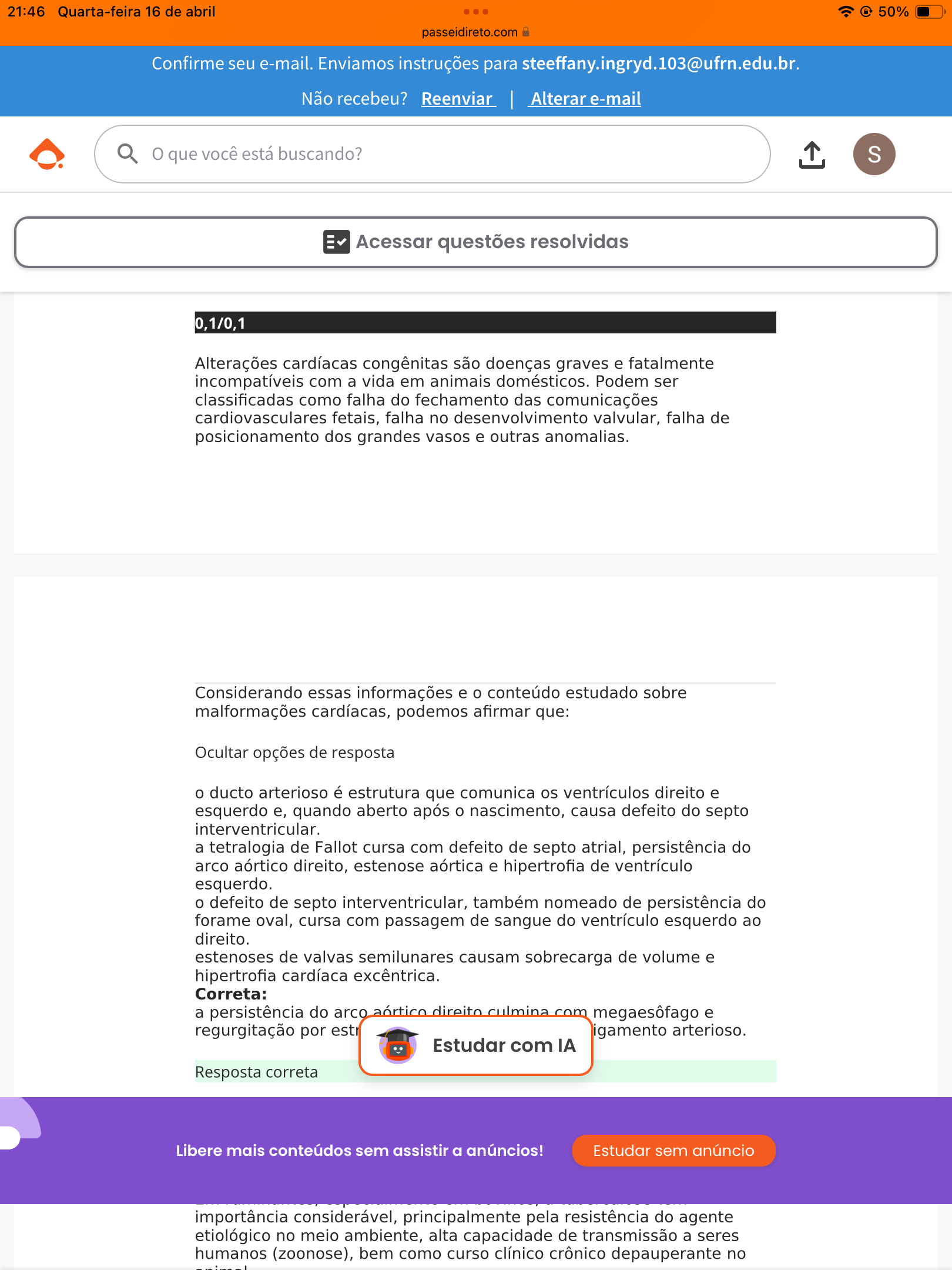 21:46 Quarta-feira 16 de abril 50% passeidireto.com Confirme seu e-mail. Enviamos instruções para steeffany.ingryd.103@ufrn.edu.br Não recebeu? Reenviar Alterar e-mail que você está buscando? S E Acessar questões resolvidas 0,1/0,1 Alterações cardíacas congênitas são doenças graves e fatalmente incompatíveis com a vida em animais domésticos. Podem ser classificadas como falha do fechamento das comunicações cardiovasculares fetais, falha no desenvolvimento valvular, falha de posicionamento dos grandes vasos e outras anomalias. Considerando essas informações e o conteúdo estudado sobre malformações cardíacas, podemos afirmar que: Ocultar opções de resposta o ducto arterioso é estrutura que comunica os ventrículos direito e esquerdo e, quando aberto após o nascimento, causa defeito do septo interventricular. a tetralogia de Fallot cursa com defeito de septo atrial, persistência do arco aórtico direito, estenose aórtica e hipertrofia de ventrículo esquerdo. o defeito de septo interventricular, também nomeado de persistência do forame oval, cursa com passagem de sangue do ventrículo esquerdo ao direito. estenoses de valvas semilunares causam sobrecarga de volume e hipertrofia cardíaca excêntrica. Correta: a persistência do arco aórtico direito culmina megaesôfago e regurgitação por estr arterioso. Estudar com IA Resposta correta Libere mais conteúdos sem assistir a anúncios! Estudar sem anúncio importância considerável, principalmente pela resistência do agente etiológico no meio ambiente, alta capacidade de transmissão a seres humanos (zoonose), bem como curso clínico crônico depauperante no