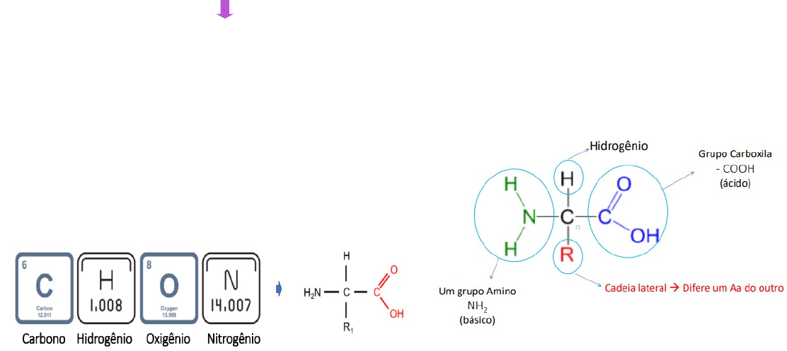 Aminoácidos e Proteínas Proteínas Moléculas mais abundantes e com maior diversidade de funções nos organismos vivos. EX: hormônios (insulina), proteínas contráteis (actina e miosina), proteinas estruturais (colágeno, elastina), proteinas de transporte (albumina)…. Diversidade em atuação. Caracterísitica Estrutural Polímeros de AMINOÁCIDOS Aminoácidos (Aa) Unidades fundamentais das proteínas. • Alfabeto no qual a linguagem da estrutura da proteina é lida. Moléculas orgânicas (ácidos orgânicos), formadas principalmente por átomos de: ~300 aminoácidos já foram descritos, PORÉM, apenas 20 aminoácidos são encontrados em proteínas. Aminoácidos NÃO ESSENCIAIS 11 Sintetizados pelo organismo e vão suprir as necessidades celulares. Aminoácidos ESSENCIAIS 9 Não são sintetizados precisam estar presente na dieta. OBS: apenas 9 Aa não dependem da alimentação. *Arginina, cisteína e tirosina são Aa (NÃO ESSENCIAIS), porém devem ser ingeridos na dieta. Fontes alimentares de Aa Alimentos de origem animal possuem proteínas de alto valor biológico. *Importantes fontes de aminoácidos essenciais MITO Todas proteínas só são adquiridas com alimentos de origem animal. Banana → Triptofano Estrutura Básica dos Aminoácidos • Todos aminoácidos tem pelo menos um carbono assimétrico (átomo de carbono ligado a qutro grupos diferentes entre si). • Em pH fisiológico (7,4): ◦ Carboxila encontra-se dissocidado ◦ Amido pronatado: - NH3 + Cadeia Lateral (R) dos Aminoácidos Variam em estrutura, tamanho e carga elétrica Classificado de acordo com as propriedades: j Aminoácidos Apolares • Distribuição homogênea de elétrons; • Incapazes de realizar ligações; • Menos solúveis. Aminoácidos Polares • Distribuição desigual de elétrons; • Participam de ligações; • São mais solúveis; • Ácidos e bases. Aminoácidos denominados “D” ou “L” • à esquerda são L- aminoácidos; • à direita dão D- aminoácidos. Propriedades ácidobásicas dos Aminoácidos Aminoácidos existem em pH fisiológico como íons dipolares → compostos químicos eletricamente neutros → possuem cargas opostas em diferentes átomos. • Carboxila = Íon carboxilado, - COO- • Amino = Íon amonia, -NH3 + Solução aquosa, dependendo do pH da solução, vai existir um equilíbrio entre íon dipolar e as formas aniônica- e catiônica+ do Aa. Aminoácidos Formando Peptídeos Peptídeos: pequenas cadeias de Aa unidos EX: Hormônios, neurotransmissores, adoçantes... Peptídeos O número de Aa que compõe os peptídeos, determina o prefixo do peptídeo. Peptídeo com 2 aminoácidos = dipeptídeo... Peptídeos que apresentam mais de dez resíduos de aminoácidos utilizamos os termos oligopeptídeos ou polipeptídios. Oligepeptídeos • Cadeia pequenas de aminoácidos; • Número máximo de 20 aminoácidos. Polipeptídeos • Empregado para peptídeos com mais de 20 aminoácidos; • Sinônimo de proteína. Grupo carboxila de um aminoácido reage com um grupo amino de outro aminoácido, liberando H2O e produzindo uma ligação covalente denominada LIGAÇÃO PEPTÍDICA. Aminoácidos Formando Proteínas Aminoácidos se ligam de modo covalente (ligações peptídicas) em uma sequência linear. 20 aminoácidos são combinados diferentemente, produzindo proteínas com propriedades e funções diferentes Síntese Proteica Acontece a partir da tradução: mRNA carrega código genético → direciona a sintese de proteina especifica 3 bases nitrogenadas (códon) → indica Aa a ser direcionada na formação da cadeia polipeptídica. Ribossomos são os responsáveis Proteínas São macromoléculas biológicas mais abundantes. Presentes em toda célula, a partir da tradução do RNA Diversidade de funções. Organização Estrutural da Proteínas Estrutura Primária • Sequência linear de Aa que compõe a proteína; • Determinada genéticamente. Estrutura Secundária • Apresenta-se “torcida”, dobrada sobre si, adquirindo várias conformações • Resultado da estrutura primária : depende do número e distribuição dos Aa ao longo da cadeia. Estrutura Terciária • Cadeia polipeptídica se curva e dobra em três dimensões; • Maior estabilidade e menor volume • Diversos tipos de interações quimicas Estrutura Quartenária • Associação de cadeias peptídicas; • Interações não covalentes entre as cadeias peptídicas e outros compostos de origem não proteíca. Ex: hemoglobina Hélice alfa > helicoidal Hélice beta > zigzag Proteína Globular: esferas irregulares, + solúvel, funções diversas. Ex: Hemoglobina Proteína fibrosa: formato cilindrico, - solúvel, funções estruturais. Ex: Colágeno e Queratina Grupo Protético Componente de natureza não proteica de proteínas conjugadas. Proteínas conjugadas podem ser classificadas em: • Cromoproteína: confere cor; • Glicoproteina: é um glicídeo; • Lipoproteína: é um lipídeo; • Nucleoproteína: é um ácido nucleico. Classificação Quanto a composição: Proteínas simples : por hidrólise (Aa) Proteínas Conjugadas: por hidrolisse (Aa + composto orgânico ou inorgânico) Quanto ao número de Cadeias: Proteínas Monoméricas: apenas uma cadeia polipeptídica. Proteínas Oligoméricas: mais de uma cadeia polipeptídica. Quanto a forma: Proteínas Fibrosas: organizam-se em forma de fibras ou lâminas, insolúveis. Proteínas Globulares: formadas por cadeias polipeptídicas que se dobram, solúveis. By: Hanna Desnaturação Proteica Exposição de proteínas a pH extremo ou temperaturas elevadas: Causa modificações físicas na conformação tridimensional e na função fisiológica das proteínas – DESNATURAÇÃO Causa a perda da configuração espacial da proteína modifica completamente sua função. Ocorre por alterações nas estruturas secundária e terciária da cadeia.