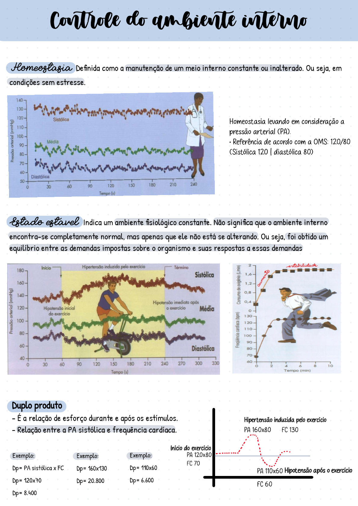 Controle do ambiente interno Definida como a manutenção de um meio interno constante ou inalterado. Ou seja, em condições sem estresse. 140 130 120 Sistólica Homeostasia levando em consideração a 110 pressão arterial (PA) 100 Média 90 Referência de acordo com a OMS: 120/80 80 (Sistólica 120 diastólica 80) 70 60 Diastólica 50 0 30 60 90 120 150 180 210 240 Tempo (s) Estado estavel Indica um ambiente fisiológico constante. Não significa que o ambiente interno encontra-se completamente normal, mas apenas que ele não está se alterando. Ou seja, foi obtido um equilíbrio entre as demandas impostas sobre o or e suas respostas a essas demandas Início Hipertensão induzida pelo exercício 2 Término 180 Sistólica 1,6 160 1,2 de 0,8 140 Hipotensão imediata após 0.4 120 Hipotensão inicial exercício Média do exercício 130 100 120 110 80 100 90 60 Diastólica 80 70 40 0 30 60 90 120 150 180 210 240 270 300 330 60 2 4 6 8 10 Tempo (s) Tempo (min) Duplo produto - É a relação de esforço durante e após os estímulos. Hipertensão induzida pelo exercício - Relação entre a PA sistólica e frequência PA 160x80 FC 130 Início do exercício Exemplo: Exemplo: Exemplo: PA 120x80 FC 70 Dp PA sistólica X FC Dp= 160x130 PA 110x60 Hipotensão após exercício Dp 120x70 Dp 20.800 FC 60 8.400da pressão arterial no exercício resistido e aerobico Como a pressão arterial aumenta e diminui dependendo da intensidade do exercício? A pressão arterial aumenta durante o exercício porque o coração bombeia mais sangue para os músculos, elevando a pressão sistólica. Em atividades aeróbicas, a pressão diastólica se mantém enquanto em exercícios de anaeróbicos, ambas podem subir devido à contração muscular que comprime os vasos sanguíneos. Após o treino, ocorre uma queda temporária da pressão arterial, chamada de hipotensão pós-exercício, devido à dilatação dos vasos. Com o tempo, a prática regular melhora a eficiência cardiovascular e reduz a pressão arterial em repouso. Existe a possibilidade de definir o sistema energético Sistólica PA mmHg através dos resultados da PA durante um treinamento 200 Diastólica ( resistido ou TR) Exemplo: Início do exercício: 120x80 Diastólica Após: 160x100 ) Houve mudança na sistólica e na diastólica. Significa que 50 foi um exercício resistido, em uma via angeróbia. Exemplo: Início do exercício: 120x80 I Após: 160x80 Houve mudança apenas na sistólica. Caracterizando uma atividade geróbica do ambiente interno or ganismo atua para manter um ambiente interno relativamente constante apesar de fatores estressantes, como o exercício o calor, o frio ou o jejum. Isso é resultado de muitos complexos sistemas de controle. Componentes gerais de um sistema de controle biológico: 1. Receptor 2. Centro de integração 3. Efetor sinal que inicia a operação de um sistema de controle é um estímulo (ex: alguma alteração detectável no ambiente, como a temperatura, a pressão arterial e etc). estímulo excita um receptor (componente capaz de detectar uma alteração da variável em questão), o qual envia uma mensagem ao centro de intregação. centro de integração avalia a força do estímulo e envia uma mensagem adequada a um componente conhecido como efetor, envolvido na correção do distúrbio, respondendo de modo que as alterações do ambiente interno voltem ao normal. o retorno do ambiente interno normal acarreta uma diminuição no estímulo original que disparou o sistema de controle. Esse tipo de feedback é denominado feedback negativo.Esquema dos componentes gerais de um sistema de controle (2) receptor avisa Centro de integração (3) Sinaliza ao centro de efetor para integração sobre corrigir o distúrbio + + o distúrbio Receptor Efetor (1) o estímulo excita (4) efetor corrige receptor + o distúrbio e remove o estímulo Estímulo negativa feedback negative A maioria dos sistemas do corpo opera por meio do feedback negativo, que tem essa denominação pelo fato de a resposta do sistema de controle ser negativa (oposta) ao estímulo. Exemplo: CO2 e O2 (Regulação da concentração de CO2 no líquido extracelular pelo sistema respiratório) de sistema controle ganho de sistema controle de retroalimentação negativa é definido como a relação entre a quantidade de correção necessária para manter a homeostasia e a quantidade de anormalidade existente após a correção pelo sistema. ganho pode ser imaginado como a "capacidade" do sistema de controle. - Um sistema controle com um grande ganho é mais potente consequentemente, mais capaz de corrigir alterações da homeostasia do que um sistema com ganho pequeno. Exemplos de controle homeostático Regulação da pressão arterial (4) Diminui a pressão arterial Sistema dos baroreceptores, exemplo de feedback negativo. (3) o cérebro sinaliza Os baroreceptores são receptores sensíveis à pressão (1) A ação do coração ao coração para que provoca um ele se contraia mais lentamente e com aumento da pressão arterial. sanguínea nos menos força vasos sanguíneos "Pelos" que identificam a quantidade Baroreceptores necessária de sangue e enviam essa informação para 0 (2) Os barorreceptores na artéria carótida informam ao cérebro que a pressão arterial aumentouSão estruturas existentes dentro dos vasos sanguíneos. Sua função na regulação arterial: detectar variações na pressão arterial e enviar ao cérebro, que ajusta a resposta do sistema nervoso para manter a pressão dentro dos níveis normais. Quando a PA aumenta além dos níveis normais: Em contraste: Os barorreceptores são estimulados e impulsos Uma redução da PA diminui o número de impulsos nervosos são transmitidos ao centro de transmitidos dos barorreceptores para o cérebro, controle cardiovascular, que diminui o número fazendo com que o centro de controle de impulsos trabsmitidos ao coração, reduzindo cariovascular aumente o número impulsos para o a quantidade 