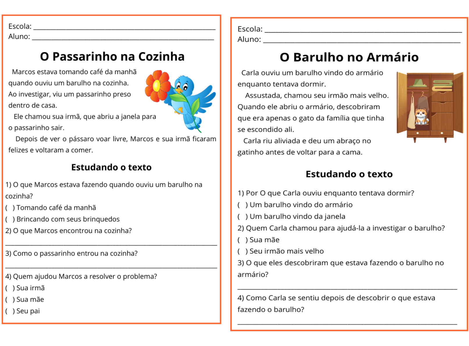 Escola: Escola: Aluno: Aluno: o Passarinho na Cozinha o Barulho no Armário Marcos estava tomando café da manhã Carla ouviu um barulho vindo do armário quando ouviu um barulho na cozinha. enquanto tentava dormir. Ao investigar, viu um passarinho preso Assustada, chamou seu irmão mais velho. dentro de casa. Quando ele abriu o armário, descobriram Ele chamou sua irmã, que abriu a janela para que era apenas o gato da família que tinha o passarinho sair. se escondido ali. Depois de ver o pássaro voar livre, Marcos e sua irmã ficaram Carla riu aliviada e deu um abraço no felizes e voltaram a comer. gatinho antes de voltar para a cama. Estudando o texto Estudando o texto 1) que Marcos estava fazendo quando ouviu um barulho na cozinha? 1) Por que Carla ouviu enquanto tentava dormir? ( ) Tomando café da manhã ( ) Um barulho vindo do armário ( ) Brincando com seus brinquedos ( ) Um barulho vindo da janela 2) O que Marcos encontrou na cozinha? 2) Quem Carla chamou para ajudá-la a investigar o barulho? ( ) Sua mãe 3) Como o passarinho entrou na cozinha? ( ) Seu irmão mais velho 3) O que eles descobriram que estava fazendo o barulho no 4) Quem ajudou Marcos a resolver o problema? armário? Sua ( ) Sua mãe 4) Como Carla se sentiu depois de descobrir o que estava ( ) Seu pai fazendo o barulho?Escola: Escola: Aluno: Aluno: A Estrela Cadente o Som na Árvore Lúcia estava olhando pela janela quando Sofia estava brincando no jardim quando ouviu viu uma luz brilhante cair do céu. um som estranho vindo da árvore. Ela correu para contar para sua mãe, Com medo, correu para chamar sua mãe. pensando que era uma estrela cadente mágica. Juntas, elas foram ver o que era e descobriram Sua mãe explicou que era apenas uma estrela que era um esquilinho guardando nozes para o cadente, algo bonito de se ver, mas que não causava nenhum inverno. perigo. Sofia sorriu, aliviada, e passou o resto da Lúcia ficou encantada e fez um pedido antes de dormir. tarde observando o esquilo. Essas historinhas também são perfeitas para atividades de Estudando o texto interpretação, ajudando as crianças a desenvolverem sua 1) que Lúcia viu cair do céu? compreensão de leitura e estimulando a criatividade. Estudando o texto 2) Como Lúcia reagiu quando viu a estrela cadente? 1) que Sofia ouviu enquanto brincava no jardim? 3) que a mãe de Lúcia explicou sobre a estrela cadente? Um som estranho na árvore ( Que era mágica e realizava desejos Um barulho vindo do céu ) Que era bonita de se ver, mas não causava perigo 2) Como Sofia reagiu ao ouvir o som na árvore? 4) que Lúcia fez depois de sua mãe explicar sobre a estrela ( ) Correu para chamar sua mãe cadente? Continuou brincando como se nada tivesse acontecido ( ) Fez um pedido antes de dormir ( ) Saju para ver a estrela de perto 3) Como Sofia se sentiu depois de ver o esquilo? ( ) Voltou para brincarEscola: Aluno: Escola: Aluno: A coruja na janela o Cachorro e a Bola Pedro estava quase dormindo quando João estava jogando bola no quintal quando ouviu um barulho na janela. a bola sumiu atrás do arbusto. Ele olhou e viu uma coruja de olhos Ele ouviu um rosnado e ficou brilhantes o observando. Com medo, Pedro com medo. Chamou sua mãe, que chamou sua irmã, que correu para ver o que foi verificar e descobriu que era apenas estava acontecendo. o cachorro do vizinho brincando com a bola. Não se preocupe, Pedro, é só uma corujinha procurando João riu e voltou a jogar, feliz por ter comida - disse ela. Pedro sorriu e voltou a dormir, sem mais encontrado um novo amigo. medo. Estudando o texto Estudando o texto 1)O que João estava fazendo no quintal? 1) Por que Pedro ficou com medo quando viu a coruja na janela? ( ) Brincando com seu cachorro ( ) Jogando bola 2) que a de Pedro fez para tranquilizá-lo? 2) que aconteceu com a bola de João? ( ) Ela sumiu atrás do arbusto 3) Por que a coruja estava na janela do quarto de Pedro? ( ) Ela estourou 4) Como Pedro se sentiu depois que sua irmã explicou sobre a 3) Por que João ficou com medo? coruja? 4) Quem estava atrás do arbusto? 5) que você faria se estivesse no lugar de Pedro e visse uma coruja na sua janela? 5) que João fez depois de descobrir o que estava atrás do arbusto?Escola: Escola: Aluno: Aluno: o Sapo na Poça A Sombra Misteriosa Bia estava pulando nas poças de água Ana estava deitada em sua cama depois da chuva quando viu algo se mexer quando uma sombra estranha na água. apareceu na parede. Assustada, ela parou de brincar Ela ficou paralisada de medo e e chamou seu pai. Ele veio correndo e riu chamou seu pai. Ele entrou no quarto ao ver que era apenas um sapinho tomando banho. e acendeu a luz, revelando que a sombra era Bia perdeu o medo e começou a pular junto com o sapo, rindo apenas o seu casaco pendurado na cadeira. e se divertindo. Eles riram juntos e Ana, agora tranquila, voltou a dormir. Estudando o texto Estudando o texto 1) que Bia estava fazendo no quintal? 1) O que Ana viu na parede que a deixou assustada? 2) que Bia viu se mexer na água? 2) O que Ana fez quando viu a sombra? Um peixe ( ) Um sapo 3) que a sombra realmente era? ( ) Uma pedra 3) Como Bia reagiu quando viu algo se mexer na poça? 4) que o pai de Ana fez quando entrou no quarto? 4) que o pai de Bia fez quando viu o que estava na poça? 5) Como Ana se sentiu depois de descobrir o que era a sombra? 6) que Ana fez depois que descobriu a verdade sobre a 5) que Bia fez depois que descobriu que era apenas um sapo? sombra?Escola: Escola: Aluno: Aluno: o desafio do quebra-cabeça o desafio da bicicleta Luísa ganhou um quebra-cabeça de 500 peças Rafael ganhou uma bicicleta nova de presente. no seu aniversário. No começo, ele teve dificuldades em aprender a No começo, ela achou muito difícil montar, andar, caindo várias vezes. Porém, com paciência e mas sua irmã mais velha a ajudou. Com determinação, ele não desistiu. paciência e trabalho em equipe, as duas Depois de algumas semanas, Rafael já conseguia 