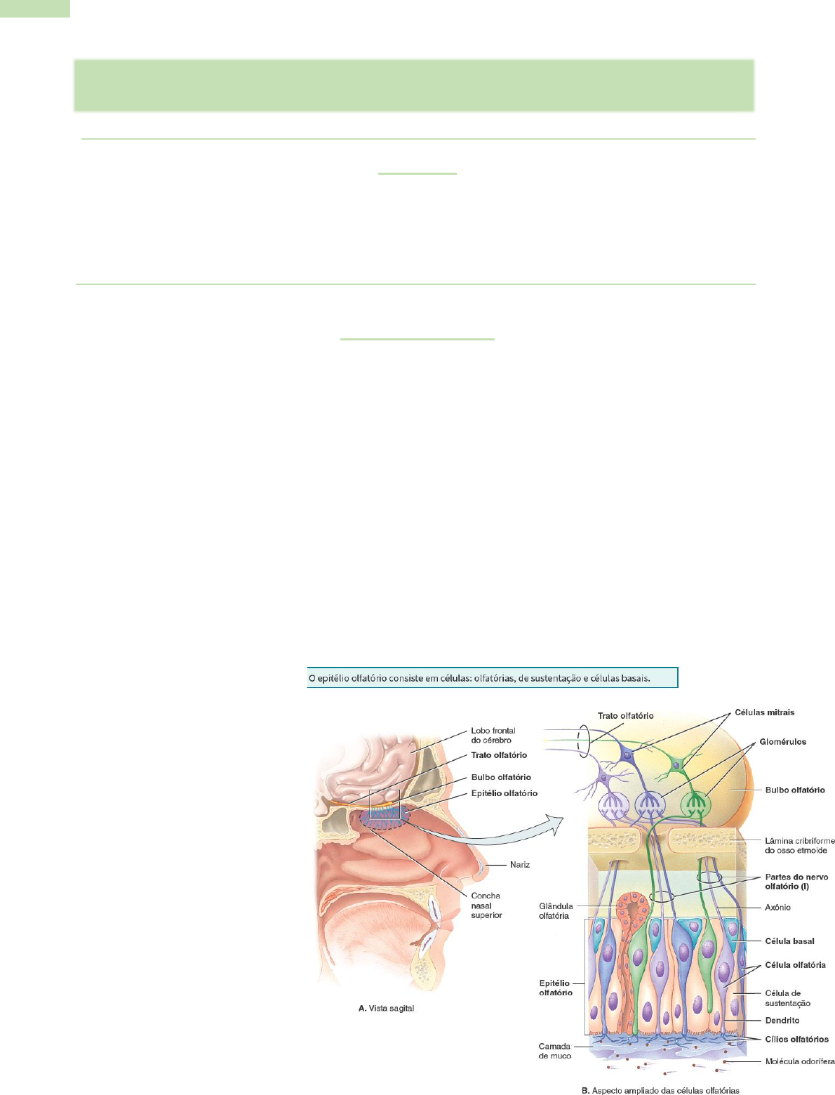 1 UNIDEP- Camila Paese 2º Período 11/03/2024 Objetivos 1. Compreender a morfofisiologia do Sistema Olfatório e Gustativo; 2. Entender a morfofisiologia do Sistema Auditivo; 3. Compreender a embriologia da orelha; 4. Entender os fatores que levam as más formações da orelha; Sistema Olfatório Anatomia dos receptores olfatórios: Os receptores para o sentido do olfato, ou olfação, estão localizados no epitélio olfatório do nariz. Com uma área total de 5 cm, o epitélio olfatório ocupa a parte superior da cavidade nasal, cobrindo a superfície inferior da lâmina cribriforme e se estendendo ao longo da concha nasal superior. O epitélio olfatório consiste em três tipos de células: olfatórias, de sustentação e células basais. ↠ Células olfatórias são os neurônios de primeira ordem da via olfatória. Cada célula olfatória é um neurônio bipolar com um dendrito exposto, em forma de botão, e um axônio que se projeta através da lâmina cribriforme e termina no bulbo olfatório. ↠ Estendendo-se do dendrito de uma célula olfatória estão vários cílios olfatórios não móveis, que são os locais da transdução olfatória, isto é, locais onde ocorre a conversão da energia do estímulo em um potencial graduado em um receptor sensitivo. ↠ Dentro das membranas plasmáticas dos cílios olfatórios estão proteínas receptoras olfatórias as quais detectam substâncias químicas inaladas. As substâncias químicas que se ligam e estimulam as células olfatórias nos cílios olfatórios são denominadas de odoríferas. As células olfatórias respondem ao estímulo químico de uma molécula odorífera produzindo um potencial receptor, que, por sua vez, dá origem à resposta olfatória. APG 9 – Audição, Sistema olfativo e gustativo 2 UNIDEP- Camila Paese 2º Período 11/03/2024 ↠ Células de sustentação são células epiteliais colunares da membrana mucosa que reveste o nariz. Elas fornecem suporte físico, nutrição e isolamento elétrico para as células olfatórias e ajudam a desintoxicar as substâncias químicas que entram em contato com o epitélio olfatório. ↠ As células basais são células-tronco localizadas entre as bases das células de sustentação; elas sofrem continuamente a divisão celular para produzir novas células olfatórias, que vivem cerca de 2 meses apenas, antes de serem substituídas. Esse processo é notável, considerando que as células olfatórias são neurônios e, como você já aprendeu, os neurônios maduros geralmente não são substituídos. ↠ Dentro do tecido conjuntivo, que suporta o epitélio olfatório, estão as glândulas olfatórias ou glândulas de Bowman, as quais produzem o muco que é transportado para a superfície do epitélio por meio de ductos. A secreção umedece a superfície do epitélio olfatório e dissolve os odores para que ocorra a transdução. As glândulas olfatórias do epitélio nasal são inervadas por neurônios parassimpáticos dos ramos do nervo facial (VII), que podem ser estimulados por determinadas substâncias químicas. Os impulsos nesses nervos, por sua vez, estimulam as glândulas lacrimais dos olhos e as glândulas mucosas nasais. O resultado são lágrimas e coriza após a inalação de substâncias como pimenta ou vapores de amônia doméstica. 3 UNIDEP- Camila Paese 2º Período 11/03/2024 Fisiologia do olfato: As células olfatórias reagem às moléculas odoríferas da mesma maneira que a maioria dos receptores sensitivos reage a seus estímulos específicos: um potencial receptor (despolarização) desenvolve-se e desencadeia um ou mais impulsos nervosos. Esse processo, denominado transdução olfatória, ocorre da seguinte maneira: a ligação de um odorífero a uma proteína do neurônio sensitivo olfatório em um cílio olfatório estimula uma proteína de membrana denominada proteína G, que vai ativar a enzima adenilato ciclase para produzir uma substância chamada adenosina monofosfato cíclica (cAMP), um tipo de segundo mensageiro. A cAMP abre um canal catiônico que permite a entrada de Na+ e Ca2+ no citosol, o que causa a formação de um potencial receptor despolarizante na membrana da célula olfatória. Se a despolarização atinge o limiar, é gerado um impulso nervoso ao longo do axônio da célula olfatória. O nariz humano contém cerca de 10 milhões de receptores olfatórios, divididos em cerca de 400 tipos funcionais diferentes. Cada tipo de célula olfatória pode reagir a apenas um grupo seleto de moléculas odoríferas. No entanto, há apenas um tipo de receptor em qualquer célula olfatória. Portanto, 400 tipos diferentes de células olfatórias estão presentes no epitélio olfatório. Limiares de odor e adaptação: O olfato, como todos os sentidos especiais, tem um limiar baixo. Bastam algumas moléculas no ar para que sejam percebidas como um odor. A adaptação (diminuição da sensibilidade) aos odores ocorre rapidamente. As células olfatórias adaptam-se em cerca de 50% no primeiro segundo, ou logo depois da estimulação, mas se adaptam muito lentamente depois disso. Ainda assim, a completa insensibilidade a determinados odores fortes ocorre aproximadamente um minuto após a exposição. Aparentemente, a sensibilidade reduzida também envolve um processo de adaptação no SNC. 4 UNIDEP- Camila Paese 2º Período 11/03/2024 Via olfatória: A via olfatória é a rota percorrida pela informação olfatória desde sua origem, nas células olfatórias, até a parte do cérebro onde ocorre a percepção consciente do olfato. • Em cada lado do nariz, cerca de 40 feixes de axônios de células olfatórias formam os nervos olfatórios (I) direito e esquerdo. • Os nervos olfatórios passam através dos forames da lâmina cribriforme do osso etmoide e se estendem para porções do cérebro conhecidas como bulbos olfatórios, que contêm arranjos semelhantes a bolas denominados glomérulos. • Dentro de cada glomérulo, os axônios das cé