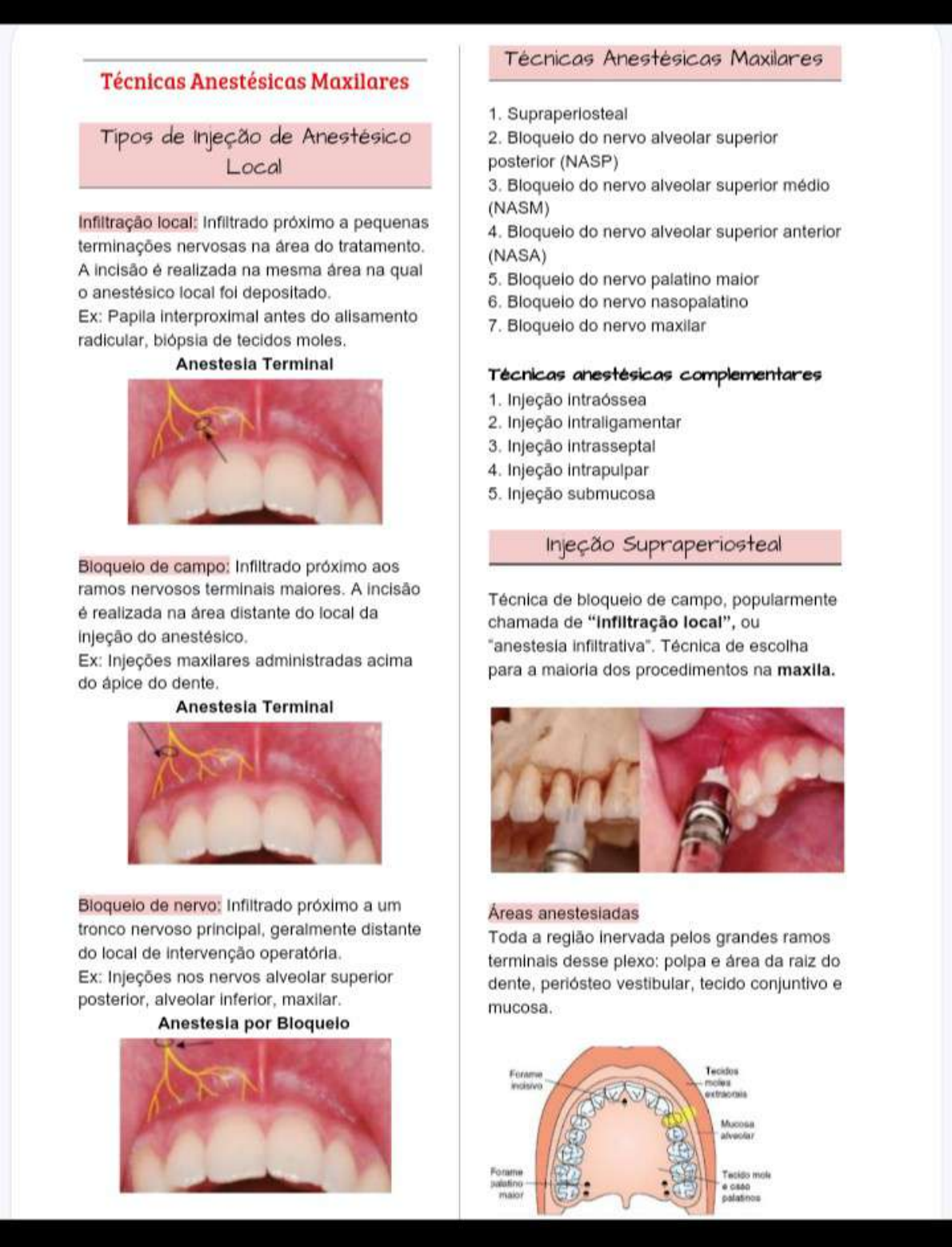 Técnicas Maxilares Técnicas Anestésicas Maxilares 1. Tipos de de Anestésico 2. Bloquelo do nervo alveolar superior Local posterior (NASP) 3. Bloquelo do nervo alveolar superior médio (NASM) local: Infiltrado próximo a pequenas 4. Bloquelo do nervo alveolar superior anterior terminações nervosas na área do (NASA) A incisão realizada na mesma área na qual 5. Bloquelo do nervo palatino maior o anestésico local depositado. 6. Bloquelo do nervo nasopalatino Ex: Papila interproximal antes do 7. Bloquelo do nervo maxilar radicular, biópsia de tecidos moles Anestesia Terminal Técnicas complementares 1. 2. Injeção 3. 4. intrapulpar 5. submucosa Supraperiosteal de campo: Infiltrado próximo aos ramos nervosos terminais maiores. A Técnica de de campo, popularmente é realizada na área distante do local da chamada de "Infiltração local", ou injeção do "anestesia Técnica de escolha Ex: maxilares administradas acima para a maioria dos procedimentos na maxila. do ápice do dente. Anestesia Terminal de nervo: próximo a um Áreas anestesiadas tronco nervoso principal, geralmente distante Toda a região pelos grandes ramos do local de operatória. terminais desse plexo: polpa e área da raiz do Ex: nos nervos alveolar superior dente, periósteo vestibular, tecido conjuntivo e posterior, alveolar inferior, Anestesia por Bloquelo Tecidos Mucosa palatinosTécnica Bloqueio do Nervo Alveolar 1. É recomendada agulha curta de calibre 27 (BR calibre 30). Superior Posterior 2. Área de acima do ápice do dente a ser superior 3. Área-alvo: apical do dente a ser anestesiado. superior posterior 4. Segurar a seringa paralela ao longo eixo do dente e introduzir a agulha na altura da prega mucovestibular sobre o 5. Avançar a agulha até que o bisel esteja na região apical do dente ou acima desta. 6. Aspirar, 7. Caso a aspiração seja negativa, injetar aproximadamente 0,6 ml (um terço de um tubete) (Não deixe os tecidos inflarem como um balão.) Indicações Áreas anestesiadas Anestesia pulpar dos dentes Polpas do terceiro, segundo e primeiro superiores, quando o tratamento é molares superiores (todo o dente = limitado a um ou dois dentes. raiz do primeiro Anestesia dos tecidos moles para molar superior não anestesiada = procedimentos cirúrgicos em área 28%). circunscrita. Tecido periodontal vestibular e osso sobrejacente a estes dentes. Contraindicações Infecção ou inflamação na área de Forame Osso denso recobrindo os ápices Tecido mole incisivo Mucosa Vantagens Alta taxa de sucesso (>95%). Forame Tecido mole Injeção tecnicamente palatino Em geral é totalmente Desvantagens Técnica Não recomendada para grandes áreas 1. Uma agulha curta de calibre 27 é devido à necessidade de múltiplas recomendada (BR calibre introduções da agulha e de 2. Área de introdução: altura da prega administração de volumes totals mucovestibular acima do segundo molar maiores do anestésico 3. Assumir a posição correta, de frente para o paciente. NASP esquerdo em posição 10h e NASP direito em posição 4. Retrair a mucosa jugal do paciente (para melhorar a visibilidade).5. Introduzir a agulha na altura alta da prega Taxa de sucesso elevada (> 95%) mucovestibular sobre o segundo molar Número mínimo de é de necessário a. Uma em 6. Avançar a agulha lentamente para cima, comparação com a opção de três para dentro e para trás em um só 7. No adulto de tamanho normal, a Minimiza o volume total de solução penetração deve in até uma profundidade de anestésica local administrada. 16 mm. 8. Aspirar 2x. Girar agulha. Desvantagens 9. Lentamente, depositar 0,9 a 1,8 ml de Risco de hematoma, que geralmente é solução de difuso. Técnica até certo ponto arbitrária: não há pontos de referência ósseos durante a É necessária uma segunda para o tratamento do primeiro molar (raiz Bloqueio do Nervo Alveolar Superior Médio Polpas do primeiro e segundo pré-molares superiores, raiz mesiovestibular do primeiro molar superior. Tecidos vestibulares e osso sobre estes mesmos dentes. Indicações Tratamento de dois ou mais molares Forame Tecido superiores. Quando a injeção supraperiosteal está Mucosa contraindicada (p. ex., na presença de infecção ou aguda) Quando a foi Forame Tocido e maior palatinos Contraindicações Quando o risco de hemorragia é muito Técnica grande (como no caso no 1. Uma agulha curta ou longa de calibre 27 é qual é recomendada a ou do 2. Área de introdução: altura da prega mucovestibular acima do segundo pré-molar Vantagens quando o bloquelo do 3. Assumir a posição correta, de frente para o nervo ASP é executado corretamente, paciente. NASM direito em posição 10h e em geral o paciente não sente dor. NASM esquerdo em posição 8 ou 9h.4. Distender o lábio superior do paciente para Bloqueio do Nervo Alveolar tensionar os tecidos e obter visibilidade. Superior Anterior 5. Introduzir a agulha na altura da prega mucovestibular acima do segundo pré-molar. 6. Penetrar a mucosa e avançar a agulha nervo alveolar nervo alveolar superior anterior superior médio lentamente até que sua extremidade esteja localizada acima do ápice do segundo 7. Aspirar. 8. Depositar lentamente 0,9 a 1,2 ml (de metade a dois terços do tubete) da solução. ramos nervoso alveolar superior e gengival nervo alveolar superior posterior NASA - Técnica do forame infra-orbitário Áreas anestesiadas Polpas do incisivo central superior até o canino superior do lado da Em cerca de 72% dos pacientes, as polpas dos pré-molares superiores e a raiz mesiovestibular do primeiro Periodonto vestibular (labial) e osso destes mesmos dentes. Pálpebra inferior, lateral do nariz, lábio superior. Indicações Quando o bloqueio do nervo Forame incisivo Tecido infraorbitário não produzir anestesia extraoral pulpar distal ao canino superior. Procedimentos dentários envolvendo apenas os pré-molares superiores. Mucosa Forame Tecido mole Contraindicações palatino maior Infecção ou 