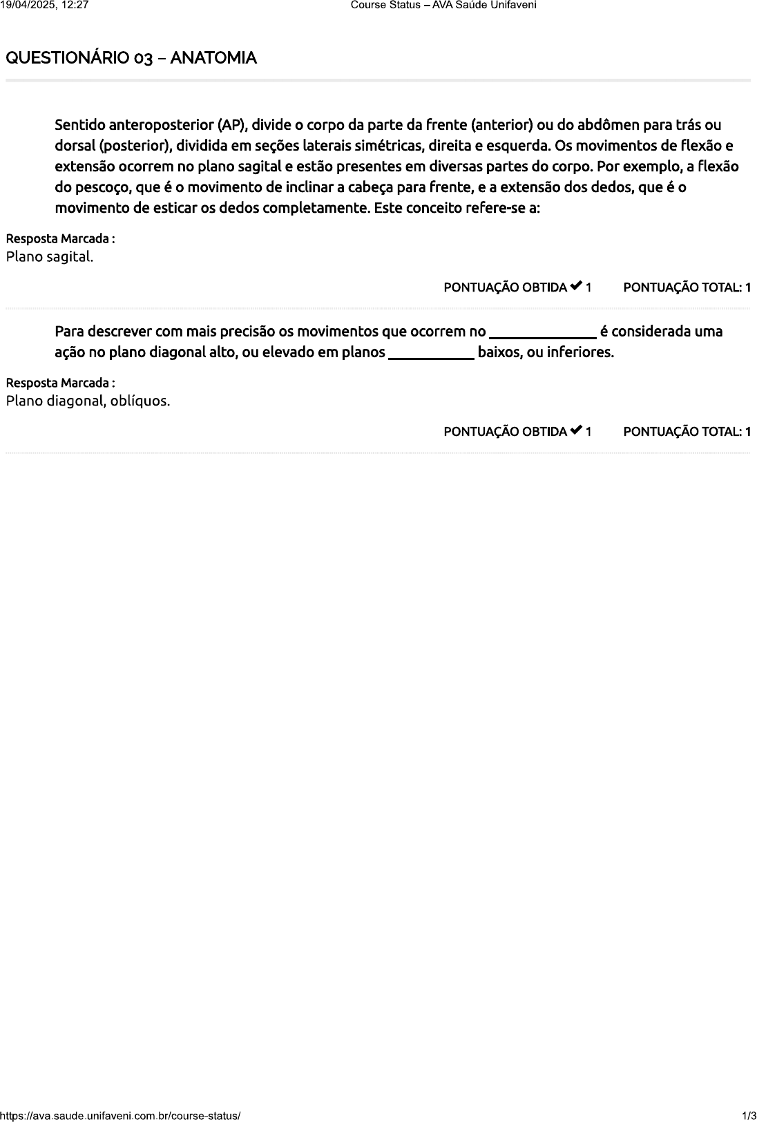 19/04/2025, 12:27 Course Status - AVA Saúde Unifaveni QUESTIONÁRIO 03 - ANATOMIA Sentido anteroposterior (AP), divide o corpo da parte da frente (anterior) ou do abdômen para trás ou dorsal (posterior), dividida em seções laterais simétricas, direita e esquerda. Os movimentos de flexão e extensão ocorrem no plano sagital e estão presentes em diversas partes do corpo. Por exemplo, a flexão do pescoço, que é o movimento de inclinar a cabeça para frente, e a extensão dos dedos, que é o movimento de esticar os dedos completamente. Este conceito refere-se a: Resposta Marcada : Plano sagital. PONTUAÇÃO OBTIDA 1 PONTUAÇÃO TOTAL: 1 Para descrever com mais precisão os movimentos que ocorrem no é considerada uma ação no plano diagonal alto, ou elevado em planos baixos, ou inferiores. Resposta Marcada : Plano diagonal, oblíquos. PONTUAÇÃO OBTIDA 1 PONTUAÇÃO TOTAL: 1 https://ava.saude.unifaveni.com.br/course-status/ 1/319/04/2025, 12:27 Course Status AVA Saúde Unifaveni Através das delimitações de termos e exemplos de linguagem, podemos ver que existem diferentes tipos de fala divididos de acordo com o tipo de "materialização" da mensagem e o podem ser classificados da seguinte forma: (1) Eixo frontal. (2) Eixo vertical. (3) Eixo diagonal. (4) Eixo sagital. ( ) Se move em um ângulo de 90.°, ou perpendicular ao plano diagonal. Quando a articulação glenoumeral executar abdução diagonal para adução diagonal, como ocorre em lances de arremesso acima do nível da cabeça, seu eixo é perpendicular ao plano, mediante a cabeça do úmero. () É nomeado segundo o plano de ação frontal. Os movimentos são executados lateralmente. Por exemplo, o eixo mediolateral é definido na flexão e extensão do cotovelo, que ocorre no plano sagital, ou flexão do cotovelo quando o antebraço gira em torno de um eixo anterior, que passar de uma extremidade lateral a outra. o também é chamado de eixo bilateral ( ) Projetado do cume da cabeça, forma um ângulo de podendo também ser perpendicular ao plano de ação transverso. No movimento do "Não", quando a cabeça "vira" da esquerda para a direita, tanto o crânio e as vértebras cervicais giram em torno de um eixo descendente e verticalizado pela coluna vertebral. ( ) Ocorre no plano frontal, coronal ou lateral, girando em torno do eixo sagital, na mesma direção do plano de ação sagital. Trata-se de um movimento da parte anterior ou ventral em sentido posterior, ou dorsal, formando um ângulo de perpendicular ao plano anterior do movimento. Resposta Marcada 3, PONTUAÇÃO OBTIDA 1 PONTUAÇÃO TOTAL: 1 Nos cotovelos, a flexão mostra a proximidade das partes posteriores do braço e antebraço; nos quadris, a flexão demonstra que as coxas estão se movendo no sentido posterior ao tronco. Nesta situação, o joelho é considerada uma exceção, pois a flexão ocorre quando se aproximadas as superfícies anteriores das coxas e das pernas. A flexão do punho pode ser chamada de flexão da plantar e flexão do tornozelo pode ser chamada de flexão palmar. De acordo com a sentença acima: Resposta Marcada ERRADO PONTUAÇÃO OBTIDA 1 PONTUAÇÃO TOTAL: 1 https://ava.saude.unifaveni.com.br/course-status/ 2/319/04/2025, 12:27 Course Status - AVA Saúde Unifaveni De acordo com as sentenças relacione-as em V para verdadeiras F para falsas. ( ) o movimento de hiperextensão indica que acontece uma contração além do sítio anatômico. Movimentos do ombro, quadril, punho, pescoço e tronco podem estar hipoestendidos. ( ) o movimento de abdução indica que um segmento ou parte do organismo se afastando da linha mediana do corpo, como os braços se movendo para o sentido lateral. Ombros e quadris realizam movimentos de adução, mas distinguem na amplitude sendo maior e menor, respectivamente. ( ) Nos pés e nas mãos, são considerados uma adução quando ocorre um retorno da abdução. Movimentos de desvio radial e deslocamento ulnar se inserem a abdução e adução do pulso. Mobilidade lateral da mão iniciada pela posição anatômica em direção ao polegar é denominado desvio radial. ( ) o movimento de elevação retrata o deslocamento superior da cintura ou cíngulo do membro inferior, enquanto o movimento de depressão relata o deslocamento superior do cíngulo ou cintura do membro inferior. Resposta Marcada : F, V, V e F. PONTUAÇÃO OBTIDA 1 PONTUAÇÃO TOTAL 1 Total de Pontos 5 3/3