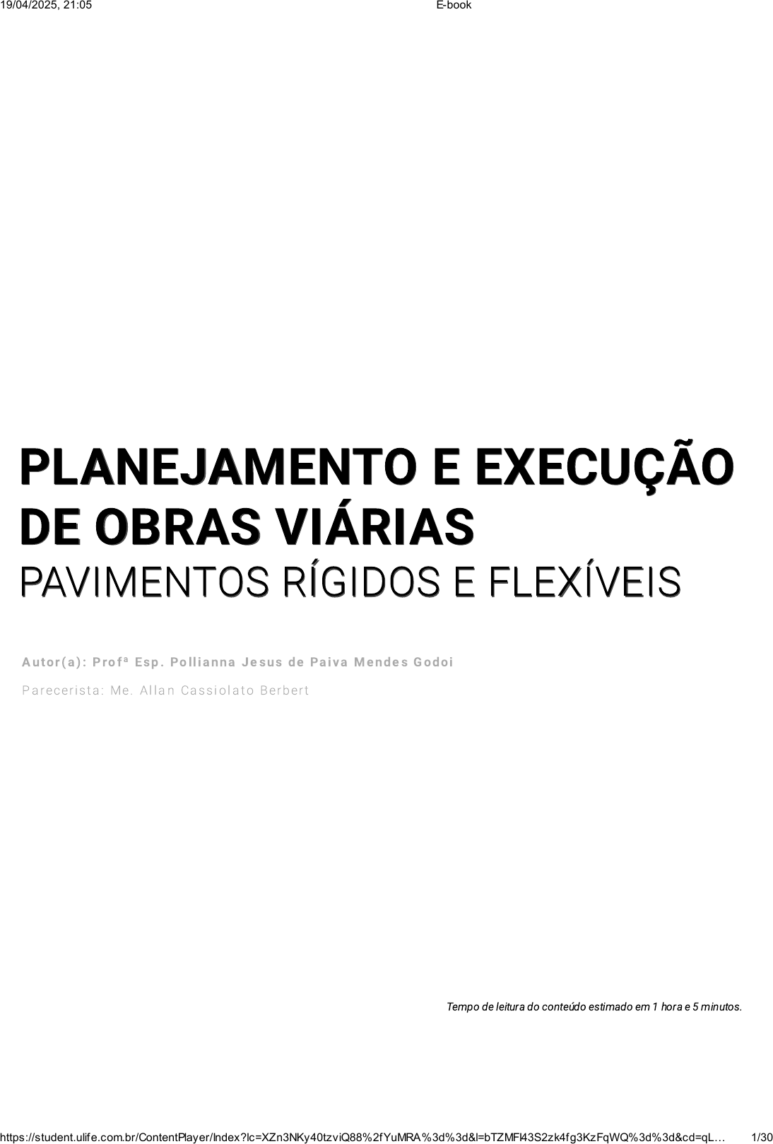 PLANEJAMENTO E EXECUÇÃOPLANEJAMENTO E EXECUÇÃO DE OBRAS VIÁRIASDE OBRAS VIÁRIAS PAVIMENTOS RÍGIDOS E FLEXÍVEISPAVIMENTOS RÍGIDOS E FLEXÍVEIS A u tor ( a ) : Pr of ª E sp . Po l l ia n n a J e su s d e Pa iva M e n d e s G od oi P a recer i s ta : M e. A l l a n Ca ss i o l a to B erb ert Tempo de leitura do conteúdo estimado em 1 hora e 5 minutos. 19/04/2025, 21:05 E-book https://student.ulife.com.br/ContentPlayer/Index?lc=XZn3NKy40tzviQ88%2fYuMRA%3d%3d&l=bTZMFI43S2zk4fg3KzFqWQ%3d%3d&cd=qL… 1/30 Introdução Olá, caro(a) estudante, como vai? Vamos começar nossa aula? Você sabia que os pavimentos viários são classificados em dois tipos? E que existem diferenças de custos, execução e composição de materiais entre eles? Sim, existem pavimentos flexíveis e rígidos , ambos muito utilizados no Brasil e por todo o mundo; são pavimentos executados para suportarem cargas de tráfego e promoverem segurança aos usuários que os utilizam. Você sabia também que os dois tipos de pavimentos são executados em camadas ? Quais seriam? Neste material, você aprenderá sobre a diferença entre os pavimentos flexíveis e rígidos, compreenderá a composição das estruturas dos pavimentos e verá sobre cada uma de suas camadas ( revestimento, base e sub-base ) e suas finalidades. Espero que você goste, pois é um assunto interessante e essencial para a execução das rodovias, fazendo parte de obras executadas na construção civil. Bons estudos para você! Caro(a) estudante(a), você sabe o que é pavimento ? O pavimento é um tipo de estrutura colocada sobre a superfície do solo após a realização de serviços de terraplenagem, tendo a função de receber as cargas de tráfego e as distribuir no subleito, além de fornecer melhores condições de segurança e qualidade aos usuários da rodovia. É importante saber que os pavimentos são formados por camadas intercaladas com diferentes tipos de materiais. Balbo (2007) define pavimento como uma estrutura que não possui longo Estrutura dos Pavimentos 19/04/2025, 21:05 E-book https://student.ulife.com.br/ContentPlayer/Index?lc=XZn3NKy40tzviQ88%2fYuMRA%3d%3d&l=bTZMFI43S2zk4fg3KzFqWQ%3d%3d&cd=qL… 2/30 tempo de duração, constituída de camadas sobrepostas compostas de diferentes tipos de materiais compactados e colocadas a partir da camada de subleito do corpo estradal. O pavimento visa atender ao tráfego, sendo um tipo de estrutura que precisa de manutenção periodicamente, para que sejam realizadas as devidas correções em locais da estrada que tenham adquirido patologias e para conservar a estrada em perfeitas condições de segurança. As camadas dos pavimentos receberão esforços quando houver tráfego de veículos sobre elas, algo que elas deverão suportar. Balbo (2007) também diz que a estrutura do pavimento é executada para que receba e transmita esforços e tente amenizar pressões atuantes em camadas inferiores, tendo as camadas inferiores menor resistência. As camadas do pavimento , em sua maioria, são compostas de: revestimento; base; sub-base; reforço do subleito; e subleito. O revestimento é a última camada do pavimento, por onde passam os veículos, e serve para melhorar a segurança e facilitar o rolamento dos pneus; além disso, essa camada é feita para resistir a esforços atuantes sobre ela. A base (camada entre o subleito e o revestimento ) é executada conforme especificação de projeto e serve para acomodar o material colocado na etapa de revestimento. Portanto, o revestimento também atua como uma camada impermeável sobre a base impedindo que, pela ação da água, ela se expanda. O subleito é a camada formada pelo solo natural compactado , feita na etapa de terraplenagem . Ela é preparada e nivelada para que receba as próximas camadas de pavimento. Você poderá ver a explicação dos esforços sobre essas camadas na figura a seguir, em que os esforços são distribuídos para maiores áreas nas camadas inferiores. 19/04/2025, 21:05 E-book https://student.ulife.com.br/ContentPlayer/Index?lc=XZn3NKy40tzviQ88%2fYuMRA%3d%3d&l=bTZMFI43S2zk4fg3KzFqWQ%3d%3d&cd=qL… 3/30 Detalhadamente falando, com base nas informações apresentadas, as camadas do pavimento são nomeadas como revestimento, base, sub-base, reforço do subleito e subleito , conforme mostra a imagem a seguir. Figura 3.1 – Esforços em camadas do pavimento Fonte: Balbo (2007, p. 40). #PraCegoVer : a imagem apresenta um esboço em preto e branco que mostra um pneu sobre o pavimento, especificamente sobre a camada de revestimento, e os esforços sendo transmitidos para baixo. Esses esforços podem ser verticais e horizontais, e são representados por setas e linhas pontilhadas que passam pela base chegando até o subleito. 19/04/2025, 21:05 E-book https://student.ulife.com.br/ContentPlayer/Index?lc=XZn3NKy40tzviQ88%2fYuMRA%3d%3d&l=bTZMFI43S2zk4fg3KzFqWQ%3d%3d&cd=qL… 4/30 Estudante, observe que, em alguns pavimentos , conforme especificação do projeto e estudos realizados, as camadas de sub-base e reforços podem ser executadas de agulhamento de rachão e cascalho ou podem não existir, se no dimensionamento não houver necessidade delas – o pavimento seria formado de subleito, base e revestimento. Para o adequado funcionamento do pavimento , todas as suas camadas deverão lidar com deformações e ter capacidade de evitar processos de danificação e ruptura prematuramente; mas, acontecendo rupturas e deformações, as camadas deverão ter capacidade de superá-las. Segundo Balbo (2007, p. 39), sobre as camadas dos pavimentos: Cada camada do pavimento possui uma ou mais funções específicas, que devem proporcionar aos veículos as condições adequadas de suporte e rolamento em qualquer condição climática. As cargas aplicadas sobre a superfície do pavimento acabaram por gerar determinado estado de tensões na estrutura, que muito dependerá do comportamento mecânico de cada uma das camadas e do conjunto destas. 