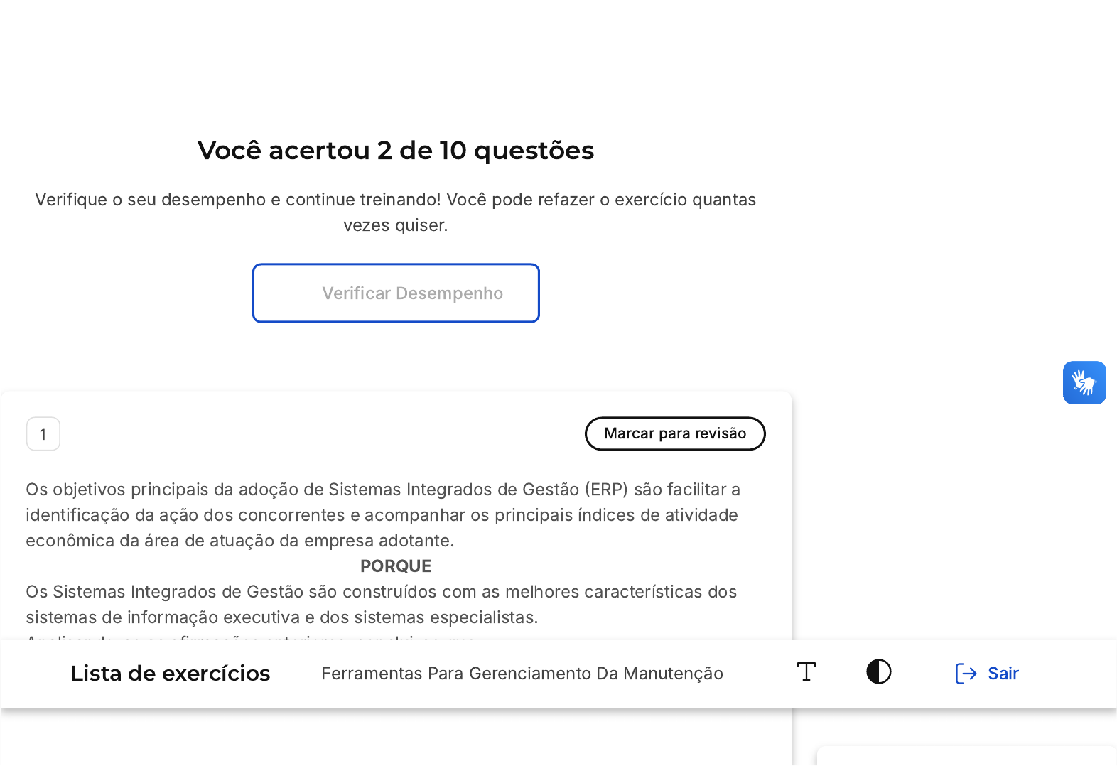 Você acertou 2 de 10 questões Verifique o seu desempenho e continue treinando! Você pode refazer o exercício quantas vezes quiser. Verificar Desempenho 1 Marcar para revisão Os objetivos principais da adoção de Sistemas Integrados de Gestão (ERP) são facilitar a identificação da ação dos concorrentes e acompanhar os principais índices de atividade econômica da área de atuação da empresa adotante. PORQUE Os Sistemas Integrados de Gestão são construídos com as melhores características dos sistemas de informação executiva e dos sistemas especialistas. Analisando-se as afirmações anteriores, conclui-se que: Lista de exercícios Ferramentas Para Gerenciamento Da Manutenção Sair A B C D E As duas afirmações são verdadeiras e a segunda justifica a primeira. As duas afirmações são verdadeiras e a segunda não justifica a primeira. A primeira afirmação é verdadeira e a segunda é falsa. A primeira afirmação é falsa e a segunda é verdadeira. As duas afirmações são falsas. Resposta incorreta Opa! A alternativa correta é a letra E. Confira o gabarito comentado! Gabarito Comentado As duas afirmações são falsas. O objetivo principal da adoção de Sistemas Integrados de Gestão (ERP) não é facilitar a identificação da ação dos concorrentes e acompanhar os principais índices de atividade econômica da área de atuação da empresa adotante. O ERP é um sistema de informação que integra todos os dados e processos de uma organização em um único sistema. A integração pode ser vista sob a perspectiva funcional (sistemas de: finanças, contabilidade, recursos humanos, fabricação, marketing, vendas, compras etc) e sob a perspectiva sistêmica (sistema de processamento de transações, sistemas de informações gerenciais, sistemas de apoio Questão 1 de 10 Corretas (2) Incorretas (8) Em branco (0) 1 2 3 4 5 6 7 8 9 10 A B C à decisão etc). Além disso, os Sistemas Integrados de Gestão não são necessariamente construídos com as melhores características dos sistemas de informação executiva e dos sistemas especialistas. Cada ERP é construído de acordo com as necessidades e especificidades de cada organização. 2 Marcar para revisão A aplicação de metodologias de análise de falhas permite a priorização de ações técnicas e gerenciais que podem resultar no aumento da confiabilidade de produtos e processos. Entre as metodologias mais conhecidas para essa finalidade estão a Análise de Modo e Efeito de Falha - FMEA (Failure mode and effect analysis) e Análise de Modo de Falha, Efeitos e Criticidade - FMECA (Failure Modes, Effects and Criticality). Acerca dessas metodologias, assinale a opção incorreta. A FMECA procura estabelecer uma relação lógica entre falhas primárias e a falha final do produto. A FMECA adapta-se melhor à análise de uma falha específica, já que o enfoque é dado à falha final do sistema. A FMEA focaliza as falhas potenciais, suas causas e consequências, de modo que ações de melhoria possam ser propostas. D E Na FMECA, o número de prioridade de risco (NPR) fornece uma indicação do tipo de falha que deve receber atenção prioritária. Na FMEA, o número de prioridade de risco (NPR) fornece uma indicação do tipo de falha que deve receber atenção prioritária. Resposta incorreta Opa! A alternativa correta é a letra D. Confira o gabarito comentado! Gabarito Comentado A alternativa D está incorreta. Na metodologia FMECA, o Número de Prioridade de Risco (NPR) não fornece uma indicação do tipo de falha que deve receber atenção prioritária. Na verdade, o NPR é uma métrica usada para classificar os riscos associados a potenciais falhas, com base em sua severidade, ocorrência e detecção. Ele não indica o tipo de falha, mas sim a prioridade de atenção que deve ser dada a cada falha potencial. 3 Marcar para revisão A respeito de sistema integrado de gestão empresarial (ERP, do inglês, Enterprise Resource Planning), é correto afirmar que: A B C D E Aumenta a agilidade de programadores dos times de desenvolvimento diretamente. É de simples implementação em empresas já consolidadas. Oferece aos gestores uma visão estratégica e detalhada de tudo o que acontece na operação. Dificulta uma gestão integrada. A utilização dele por si só torna uma empresa verdadeiramente integrada. Resposta correta Parabéns, você selecionou a alternativa correta. Confira o gabarito comentado! Gabarito Comentado O sistema integrado de gestão empresarial (ERP) é uma ferramenta que auxilia na gestão de uma empresa, oferecendo aos gestores uma visão estratégica e detalhada de tudo o que acontece na operação. Isso permite que eles tomem decisões mais informadas e eficazes. Portanto, a alternativa correta é: "Oferece aos gestores uma visão estratégica e detalhada de tudo o que acontece na operação". A B C D E 4 Marcar para revisão Normalmente as organizações têm muitos problemas a resolver de uma única vez. No entanto, a limitação de tempo e de recursos materiais e humanos impõe a necessidade de priorizar os problemas existentes. Para auxiliar os gestores na tarefa de priorizar problemas, a Matriz GUT apresenta-se como uma ferramenta simples e eficiente. As letras "G", "U" e "T" representam as iniciais de: Gerenciar, Uniformidade, Tempo. Gráfico, Unificar, Taxa. Gravidade, Urgência, Tendência. Grupo, Unilateral, Total. Gravidade, Uniformidade, Terminal. Resposta correta Parabéns, você selecionou a alternativa correta. Confira o gabarito comentado! A B Gabarito Comentado A Matriz GUT é uma ferramenta utilizada para auxiliar na priorização de problemas em uma organização. As letras "G", "U" e "T" representam as iniciais de Gravidade, Urgência e Tendência, respectivamente. A Gravidade se refere ao impacto do problema se nada for feito para solucioná-lo. A Urgência está relacionada ao tempo disponível ou necessário para resolver o problema. A Tendência indica o pote