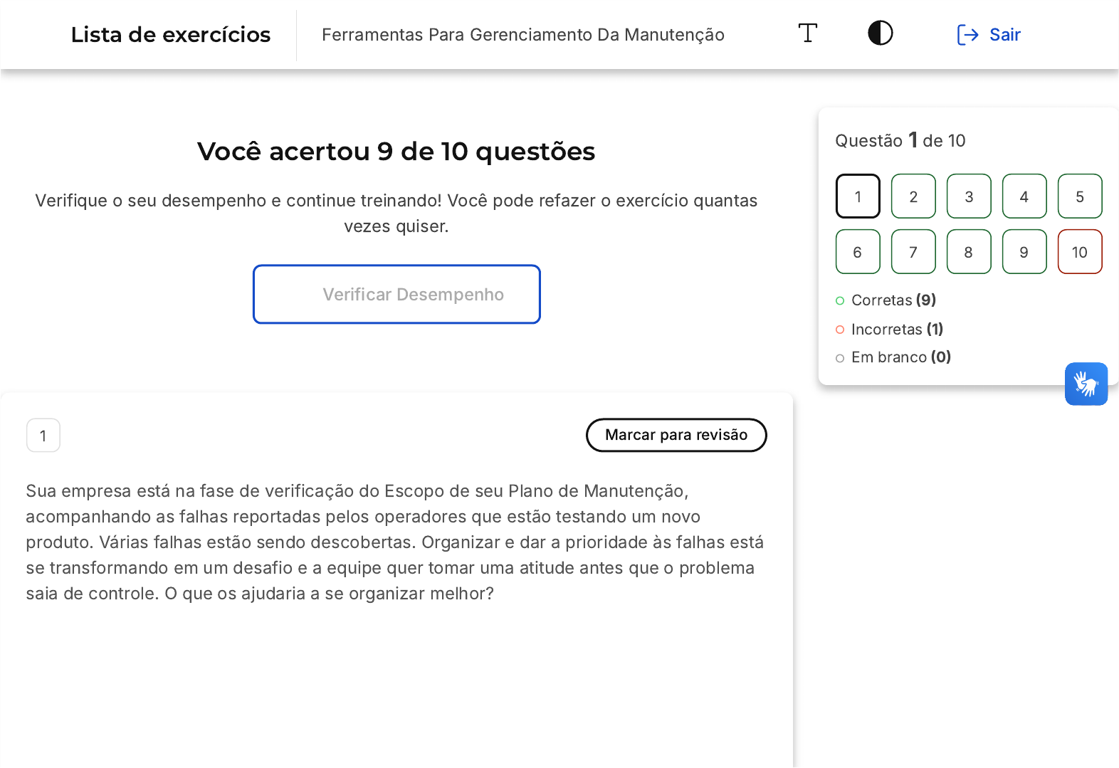 Você acertou 9 de 10 questões Verifique o seu desempenho e continue treinando! Você pode refazer o exercício quantas vezes quiser. Verificar Desempenho 1 Marcar para revisão Sua empresa está na fase de verificação do Escopo de seu Plano de Manutenção, acompanhando as falhas reportadas pelos operadores que estão testando um novo produto. Várias falhas estão sendo descobertas. Organizar e dar a prioridade às falhas está se transformando em um desafio e a equipe quer tomar uma atitude antes que o problema saia de controle. O que os ajudaria a se organizar melhor? Questão 1 de 10 Corretas (9) Incorretas (1) Em branco (0) 1 2 3 4 5 6 7 8 9 10 Lista de exercícios Ferramentas Para Gerenciamento Da Manutenção Sair A B C D E Diagrama de Pareto Fluxograma Diagrama de Ishikawa Diagrama Espinha de Peixe 5 Porquês Resposta correta Parabéns, você selecionou a alternativa correta. Confira o gabarito comentado! Gabarito Comentado O Diagrama de Pareto é a ferramenta mais adequada para a situação descrita no enunciado. Ele é um gráfico de barras que ordena as frequências das ocorrências, permitindo a identificação das causas mais comuns de um problema. Nesse caso, a equipe poderia usar o Diagrama de Pareto para organizar e priorizar as falhas descobertas durante a fase de verificação do escopo do Plano de Manutenção. Assim, A B C D E a equipe poderia focar nas falhas mais frequentes e críticas, otimizando o processo de manutenção e prevenindo que o problema saia de controle. 2 Marcar para revisão A respeito de sistema integrado de gestão empresarial (ERP, do inglês, Enterprise Resource Planning), é correto afirmar que: Aumenta a agilidade de programadores dos times de desenvolvimento diretamente. É de simples implementação em empresas já consolidadas. Oferece aos gestores uma visão estratégica e detalhada de tudo o que acontece na operação. Dificulta uma gestão integrada. A utilização dele por si só torna uma empresa verdadeiramente integrada. A B Resposta correta Parabéns, você selecionou a alternativa correta. Confira o gabarito comentado! Gabarito Comentado O sistema integrado de gestão empresarial (ERP) é uma ferramenta que auxilia na gestão de uma empresa, oferecendo aos gestores uma visão estratégica e detalhada de tudo o que acontece na operação. Isso permite que eles tomem decisões mais informadas e eficazes. Portanto, a alternativa correta é: "Oferece aos gestores uma visão estratégica e detalhada de tudo o que acontece na operação". 3 Marcar para revisão Na Matriz GUT, o critério GRAVIDADE visa avaliar: O potencial de crescimento do problema: possibilidade de crescimento, redução ou desaparecimento do problema. A estimativa de prioridade de problemas identificados. C D E O impacto do problema sobre coisas, pessoas, resultados, processos ou organizações e efeitos que surgirão em longo prazo, caso o problema não seja resolvido. A relação entre uma característica de qualidade e os fatores que a determinam. A relação com o tempo disponível ou necessário para resolver o problema. Resposta correta Parabéns, você selecionou a alternativa correta. Confira o gabarito comentado! Gabarito Comentado Na Matriz GUT, o critério de GRAVIDADE é utilizado para avaliar o impacto do problema sobre coisas, pessoas, resultados, processos ou organizações e os efeitos que surgirão em longo prazo, caso o problema não seja resolvido. Isso significa que a GRAVIDADE se refere à seriedade das consequências do problema, caso ele não seja tratado. Portanto, a alternativa correta é a C: "O impacto do problema sobre coisas, pessoas, resultados, processos ou organizações e efeitos que surgirão em longo prazo, caso o problema não seja resolvido". A B C D E 4 Marcar para revisão A aplicação de metodologias de análise de falhas permite a priorização de ações técnicas e gerenciais que podem resultar no aumento da confiabilidade de produtos e processos. Entre as metodologias mais conhecidas para essa finalidade estão a Análise de Modo e Efeito de Falha - FMEA (Failure mode and effect analysis) e Análise de Modo de Falha, Efeitos e Criticidade - FMECA (Failure Modes, Effects and Criticality). Acerca dessas metodologias, assinale a opção incorreta. A FMECA procura estabelecer uma relação lógica entre falhas primárias e a falha final do produto. A FMECA adapta-se melhor à análise de uma falha específica, já que o enfoque é dado à falha final do sistema. A FMEA focaliza as falhas potenciais, suas causas e consequências, de modo que ações de melhoria possam ser propostas. Na FMECA, o número de prioridade de risco (NPR) fornece uma indicação do tipo de falha que deve receber atenção prioritária. Na FMEA, o número de prioridade de risco (NPR) fornece uma indicação do tipo de falha que deve receber atenção prioritária. A B Resposta correta Parabéns, você selecionou a alternativa correta. Confira o gabarito comentado! Gabarito Comentado A alternativa D está incorreta. Na metodologia FMECA, o Número de Prioridade de Risco (NPR) não fornece uma indicação do tipo de falha que deve receber atenção prioritária. Na verdade, o NPR é uma métrica usada para classificar os riscos associados a potenciais falhas, com base em sua severidade, ocorrência e detecção. Ele não indica o tipo de falha, mas sim a prioridade de atenção que deve ser dada a cada falha potencial. 5 Marcar para revisão Dentre as características desejáveis de um Enterprise Resource Planning - ERP estão Melhor performance por ser orientado a eventos e não a processos. Garantir a segurança das informações por bloquear a entrada de dados em tempo real. C D E Maior integração de processos por ser um sistema especialista e não genérico. Garantir a consistência das informações por integrar as áreas da organização. Melhor performance por implementar bases de dados diversas e descentralizadas. Resposta correta Parabéns, 