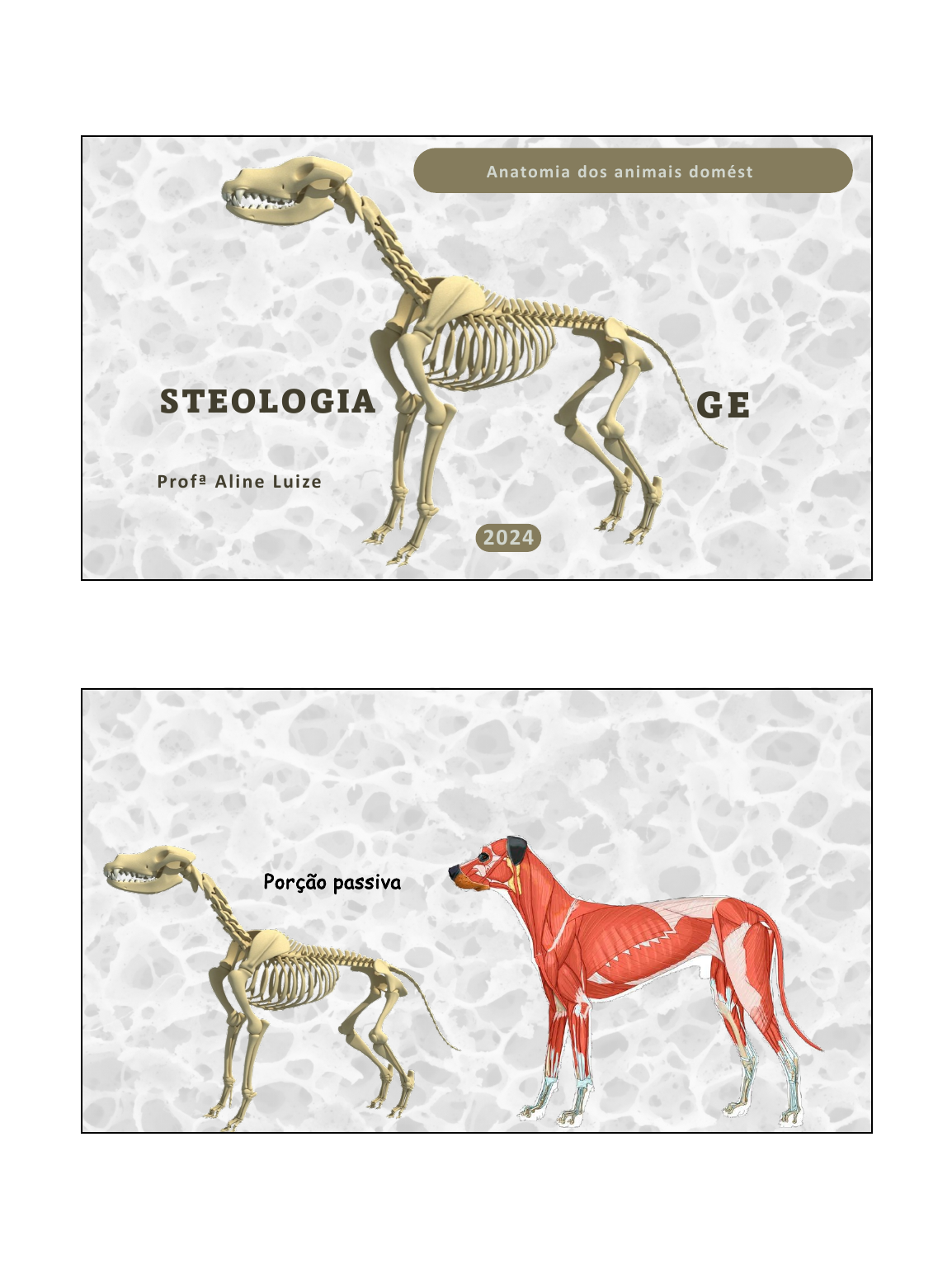 10/02/2025 1 Profª Aline Luize OSTEOLOGIA Anatomia dos animais domésticos 2024 GERAL 1 APARELHO LOCOMOTOR Porção ativa Porção passiva 2 10/02/2025 2 Axial ossos + cartilagens = arcabouço do corpo do animal ESQUELETO Apendicular torácico Apendicular pélvico Visceral 3 ESQUELETO Visceral 4 10/02/2025 3 ESQUELETO Visceral 5 Esqueleto axial: ossos da cabeça, pescoço e tronco E s q u e l e t o a p e n d i c u l a r Cintura escapular Braço Antebraço Mão Cintura pélvica Coxa Perna Pé ESQUELETO 6 10/02/2025 4 ESQUELETO 7 ESQUELETO 8 10/02/2025 5 OSSOS Proteção Sustentação Local de armazenamento de íons Ca e P Produção de células do sangue Locomoção associada aos músculos e articulações conformação do corpo Funções 9 OSSOS Formula e anatomia óssea variam de acordo com a espécie Equino Bovino 10 10/02/2025 6 OSSOS Eq – 205 ossos Bo – 188 ossos Ca – 215 ossos 11 OSSOS Equino - C7 T18 L6 S5 Ca15-21 Ruminante- C7 T13 L6 S5 Ca18-20 Suíno - C7 T14-15 L6-7 S4 Ca20-23 Cão - C7 T13 L7 S3 Ca20-23 Fórmula Vertebral 12 10/02/2025 7 OSSIFICAÇÃO Classificação Intramembranosa Células mesenquimais se transformam em células produtoras de osso 13 OSSIFICAÇÃO Classificação Endocondral Caratilagem substituída por osso 14 10/02/2025 8 OSSOS Classificação Curto Plano Irregular Pneumático Longo 15 OSSOS LONGOS Epífise proximal Diáfise Epífise distal Metáfise 16 10/02/2025 9 OSSOS CURTOS Comprimento Largura Espessura 17 OSSOS PLANOS Largura Comprimento Espessura 18 10/02/2025 10 OSSOS IRREGULARES 19 OSSOS PNEUMÁTICOS 20 10/02/2025 11 OSSOS • Aproximadamente de 15% de água, 30% de fibras colágenas e 55% de sais minerais cristalizados. • O sal mineral mais abundante é o fosfato de cálcio. Ele se combina com o hidróxido de cálcio, para formar cristais de hidroxiapatita. • Células osteoprogenitoras (-genicas = produtoras) Ø Células-tronco ósseas não especializadas derivadas do mesênquima Ø Sofrem divisão celular Ø Se desenvolvem em osteoblastos 21 OSSOS • Osteoblastos (-blastos = botões ou brotos) Ø são células formadoras dos ossos. ØEles sintetizam e secretam fibras colágenas e outros componentes orgânicos necessários para formar a matriz extracelular do tecido ósseo • Osteócitos (-citos = células) ØCélulas ósseas maduras Ø são as principais células do tecido ósseo e mantêm seu metabolismo diário, como a troca de nutrientes e resíduos com o sangue. 22 10/02/2025 12 OSSOS • Osteoclastos (-clasto = quebra ou ruptura) • Libera enzimas lisossomais e ácidos que digerem a proteína e os componentes minerais da matriz extracelular óssea • Remodelamento ósseo 23 24 10/02/2025 13 25 OSSOS Tecido ósseo compacto (denso) • O tecido ósseo compacto contém poucos espaços e é o tipo mais forte de tecido ósseo. • É encontrado sob o periósteo de todos os ossos e compõe a maior parte das diáfises de ossos longos. • Fornece proteção e apoio e resiste às tensões produzidas pelo peso e movimento. 26 10/02/2025 14 OSSOS • Tecido ósseo compacto: células e material intercelular calcificado – matriz óssea • Osteônio (Sistema de Havers): • Formado pela sobreposição de lamelas concêntricas de matriz óssea • Canais de Havers(longitudinais) • Canais de Volkman (horizontais) • Canais > transporte de nutrientes (passagem de VV. sg e Nn) • Canais comunicam a superfície óssea à cavidade medular 27 OSSOS Tecido ósseo esponjoso (trabecular) • O tecido ósseo esponjoso está bem localizado no interior de um osso, protegido por uma cobertura de osso compacto. • Constituído por lamelas ósseas que estão dispostas em um padrão irregular de colunas finas chamadas trabéculas ósseas. 28 10/02/2025 15 OSSOS • O tecido ósseo esponjoso compõe a maior dos ossos curtos, chatos, sesamoides e de formato irregular. • Nos ossos longos, forma o núcleo das epífises abaixo da camada fina do osso compacto e forma uma borda estreita variável que contorna a cavidade medular da diáfise. • O osso esponjoso é sempre coberto por uma camada de osso compacto para proteção. • o tecido ósseo esponjoso é leve, o que reduz o peso total de um osso. • sustentam e protegem a medula óssea vermelha. 29 30 10/02/2025 16 OSSOS • *Crânio Ø Tecido ósseo esponjoso: diploe Ø Tecido ósseo compacto: tábua vítrea "duplo” localizado entre as duas camadas 31 Periósteo: membranoso, possui 2 camadas: Externa: fibrosa fixação de tendões Interna: celular osteogênica Outras funções: proteção, osteogênica, vascularização, cicatrização e crescimento em espessura. Endósteo: fina membrana; reveste a cavidade medular; participa da remodelagem e crescimento Medula óssea: vermelha e amarela; adulto vermelha em ossos planos 32 10/02/2025 17 Canal medular Periósteo Endósteo Fibrosa Celular 33 34 10/02/2025 18 O S S O S D O C R Â N I O 35 T i p o s d e c râ n i o Dolicocefálico Mesocefálico Braquiocefálico 36 10/02/2025 19 Dentição • Implantados nos alvéolos dentários • Coroa porção visível – revestida por esmalte • Raiz – porção implantada no alvéolo –revestida por cemento • Colo – porção intermediária (às anteriores) consiste num estreitamento BAIA, 2018. 37 • Dentina • Esmalte • Cemento • Polpa • Periodonto DYCE; WENSING; SACK, 2010. Anatomia dentária 38 10/02/2025 20 39 40 10/02/2025 21 • Fórmula Dentária Cão § Dentição permanente = 42 dentes. Ø 2 X (3-1-4-2/ 3-1-4-3) Dentição permanente de cão. 41 • Fórmula Dentária Gato § Dentição difiodonte. § Dentição decídua = 26 dentes. Ø 2 X (3-1-3/3-1-2) § Dentição permanente = 28 dentes. Ø 2 X (3-1-3-1/ 3-1-2-1) Dentição permanente de gato. 42 10/02/2025 22 • Fórmula Dentária - Equino § Dentição difiodonte. § Dentição decídua = 24 dentes. Ø 2 X ( 3-0-3/3-0-3) § Dentição permanente = 36 a 44 dentes. Ø 2 X ( 3-1(0)-3(4)-3/ 3-1-3-3) Dentição permanente de equino.