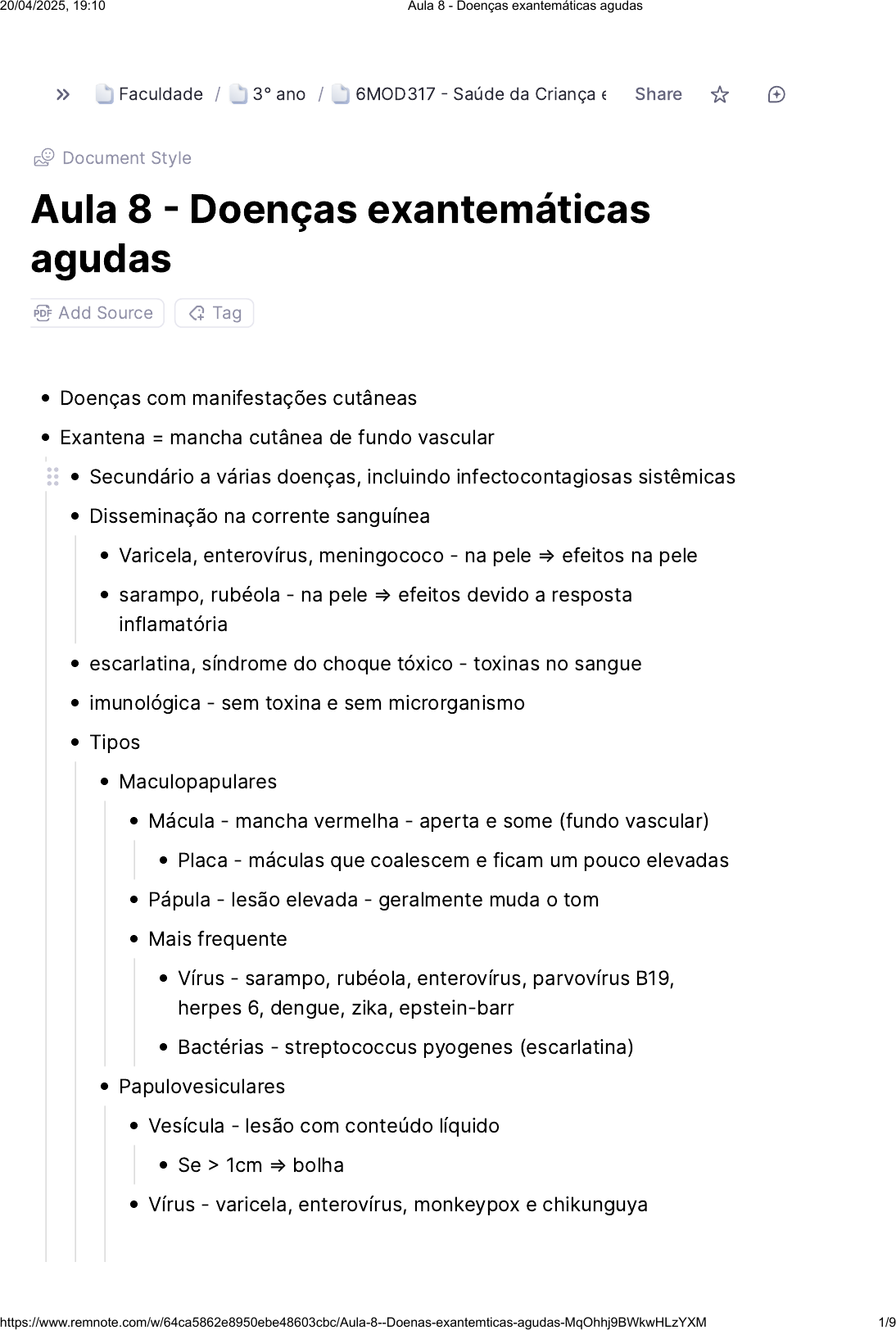 Faculdade 3° ano 6MOD317 - Saúde da Criança e Share Document Style Aula 8 - Doenças exantemáticas agudas Add Source Tag Doenças com manifestações cutâneas Exantena = mancha cutânea de fundo vascular Secundário a várias doenças, incluindo infectocontagiosas sistêmicas Disseminação na corrente sanguínea Varicela, enterovírus, meningococo - na pele ⇒ efeitos na pele sarampo, rubéola - na pele ⇒ efeitos devido a resposta inflamatória escarlatina, síndrome do choque tóxico - toxinas no sangue imunológica - sem toxina e sem microrganismo Tipos Maculopapulares Mácula - mancha vermelha - aperta e some (fundo vascular) Placa - máculas que coalescem e ficam um pouco elevadas Pápula - lesão elevada - geralmente muda o tom Mais frequente Vírus - sarampo, rubéola, enterovírus, parvovírus B19, herpes 6, dengue, zika, epstein-barr Bactérias - streptococcus pyogenes (escarlatina) Papulovesiculares Vesícula - lesão com conteúdo líquido Se > 1cm ⇒ bolha Vírus - varicela, enterovírus, monkeypox e chikunguya 20/04/2025, 19:10 Aula 8 - Doenças exantemáticas agudas https://www.remnote.com/w/64ca5862e8950ebe48603cbc/Aula-8--Doenas-exantemticas-agudas-MqOhhj9BWkwHLzYXM 1/9 Impetigo, estrófulo (lesão à picada de inseto), molusco contagioso, erupção por drogas Petequial-purpúrico Petéquia -pontos vermelhos ⇒ aperta e não some, pois tem comprometimento de extravasamento de hemácia Diminutas Se junta, fica tamanho maior ⇒ púrpura enterovírus e citomegalovírus Neisseria meningitis Streptococcus pneumoniae Haemophilus influenzae Streptococcus pyogenes Pseudomonas aeruginosa Urticariforme Placas Febril - infecciosa Afebril - outra causa Eritema multiforme - lesões em... Herpes, mycoplasma, estafilococos, estreptococos Associados a outros sinais e sintomas Meningite Enterovírus (Coxsa Otite Pneumonia Mycoplasma Adenovírus COVID Enterovírus Diagnóstico diferencial Sarampo 20/04/2025, 19:10 Aula 8 - Doenças exantemáticas agudas https://www.remnote.com/w/64ca5862e8950ebe48603cbc/Aula-8--Doenas-exantemticas-agudas-MqOhhj9BWkwHLzYXM 2/9 Genêro Morbilivirus damília Para,yxoviridae Vírus RNA com envelope, glicoproteína F (fusão) e H (adsorção) ⇒ sincícios ⇒ perda da função respiratória, cílios não conseguem segurar os patógenos ⇒ bcatérias colonizando o trato supeior desce para o pulmão 1 sorotipo Muito grave Complicações neurológicas, cardíacas Transmissão aérea - tosse, espirro, vírus suspenso no ar Extremamente contagioso Transmitido 4 a 6 dias antes e até 4 dias após o início do exantema Períod de infecção - 7 a 21 dias Período prodrômico - 2 a 4 dias Febre, sintomas nasais, conjuntivite, tosse, koplik (manchas brancas com fundo avermelhado na gengiva Período exantemático (3 dias) - febre, tosse faringite .. .. Tosse contínua Febre alta junto com exantema (evolução craniocaudal) Pode ter descamação da pele Sarampo modificado Grau de imunidade, mas não bloqueia totalmente Lactentes, uso de Ig, vacinação prévia Caso suspeito PROVAAA Febre + exantema maculopapular cefalocaudal + tosse/eou coriza e/ou conjuntivite independente de idade e situação vacinal Doença de notificação obrigatória (na suspeita notifica) em 24h Exames laboratoriais inespecíficos 20/04/2025, 19:10 Aula 8 - Doenças exantemáticas agudas https://www.remnote.com/w/64ca5862e8950ebe48603cbc/Aula-8--Doenas-exantemticas-agudas-MqOhhj9BWkwHLzYXM 3/9 Hemograma - leucopenia com linfopenia (leva imunossupressão celular [alvo TCD4]) Sorologia - anticorpo IgM (fase aguda) [demora 3 dias do início do exantema pra ser detectada] PCR - swab de nasofaringe + urina (qualquer material genético consegue ser identificado) Caso confirmado IgM + inicial - coleta 2ª amostra 2 a 3 semanas após a 1ª ⇒ IgM+ + IgG+ PCR + Complicações PROVAA Otite e laringotraqueobronquite, pneumonia e diarreia Neurológicas: convulsão.... Alterações pulmonares Opacidades em vidro despolido Vacinação 1 dose ≥ 12 meses ⇒ 93% 2 doses = 97% Vitalícia 2 doses até os 30 anos A partir de 30 anos ⇒ 1 dose Profissionais de saúde ⇒ 2 doses Dose zero - em período epidemiológico Triplíce viral ⇒ sarampo, rubéola e caxumba Tetraviral Contraindicações PROVAA Vacina de vírus vivo atenuado ⇒ gestante ⇒ risco de passar para o fetp Crianças 62 anos Imunocompetente ⇒ vacinação de bloqueio seletivo dentro de 72h após a exposição Imunodeprimido ⇒ Ig Isolamento Tratamento Vitamina A - melhora a imunidade celular, ajuda na regeneração de mucosa durante 2 dias Rubéola Família Togaviridae, gênero Ruvivirus Vírus RNA 1 cepa Transmissão por gotículas (10 dias antes e até 15 dias após exantema), transplacentária e urina (meses na rubéola congênita) Período d eincubação prolomgado Febre, dor de garganta, adenomegalia retroauricular, cervical, submandibular Exantema em 24h (distribuição rápida) róseo, claro, BEG, maculopapular Enantema - sinal de Forscheimer (na mucosa/palato) Síndrome da rubéola congênita PROVAA Catarata, microcefalia, persistência do canal arterial, sopro e surdez 20/04/2025, 19:10 Aula 8 - Doenças exantemáticas agudas https://www.remnote.com/w/64ca5862e8950ebe48603cbc/Aula-8--Doenas-exantemticas-agudas-MqOhhj9BWkwHLzYXM 5/9 Complicações Artrite Púrpura trombocitopênica (plaquetas baixas - reação de imunocomplexo e destruição das plaquetas) Encefalite Hepatite Caso suspeito - febre + exantema + adenomegalia independente de situação vacinal Sorologia - IgM positiva PCR Profilaxia Bloqueio seletivo Gestante em contato sem imunidade ⇒ Ig ⇒ atenua na gestante mas não impede a transmissão pro feto Exantema súbito Herpes tipo 6 Diagnóstico clínico Febre há 4 dias ⇒ no 5° dia aparece exantema (tronco, face) Às vezes faringite Eritema infeccioso Parvovírus B19 Sorologia PCR Quanto mais precoce, melhor diagnóstico por PCR Exantema em face, membros Face esbofeteada Febre Pode dar artralgia Enterov