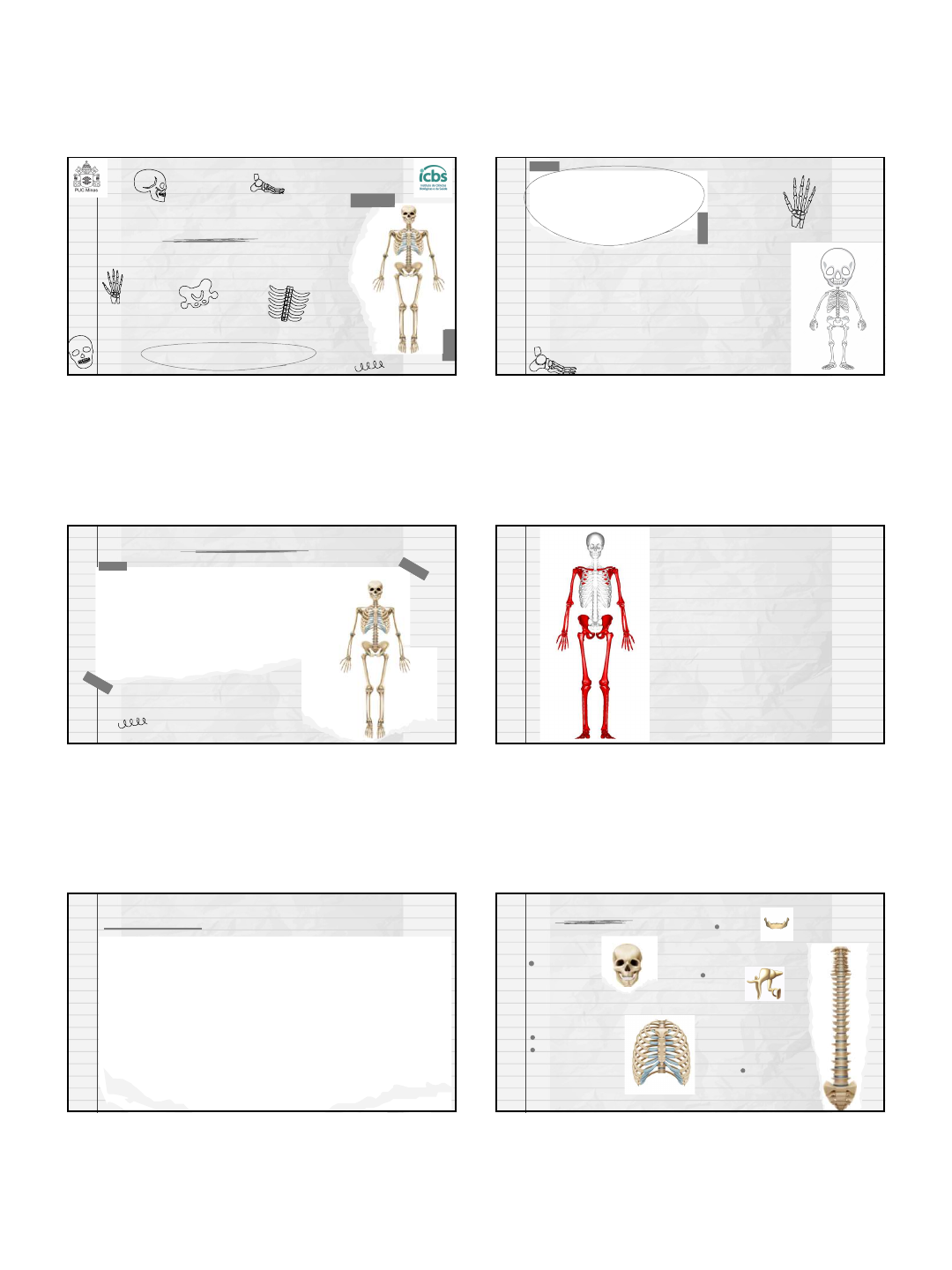 24/02/2025 1 Professor: Marco Aurelio Anatomia Do Esqueleto Conceito O esqueleto humano é uma estrutura formada por um conjunto de ossos e cartilagens, sendo essencial para a nossa sobrevivência. Função . Suporte do organismo; . Proteção dos órgãos internos e dos tecidos moles; . Em conjunto com os músculos, garante a nossa movimentação; . Apoio aos músculos esqueléticos; . Depósito de sais minerais, principalmente fósforo e cálcio; Total de ossos 206 ossos: 80 ossos no esqueleto axial e 126 ossos no esqueleto apendicular. Um recém-nascido possui mais ossos que um homem adulto, cerca de 300 ossos. Esqueleto Axial = 80 Esqueleto Apendicular = 126 Superior =64 Inferior =62 Crânio 22 Esqueleto Axial Esterno 1 Costelas 12 pares Vertebras 33 14. Face 8. Caixa Craniana Hioide 7 12 5 1/5 1/4 Martelo Bigorna Estribo 24/02/2025 2 Apendicular superior & Apendicular inferior 64 62 2 na cintura pélvica, 8 membros inferior (2 fêmur, 2 patelas, 2 tíbias, 2 fíbulas) e 52 ossos nos pés 4 na cintura escapular (2 clavículas e 2 escapula), 6 nos braços (2 úmeros, 2 ulna, 2 rádio) e 54 nas mãos 126 OSSOS Classificação São ossos cujo comprimento, apesar de ser variável, é maior que a largura e a espessura. Não apresenta uma forma geométrica definida. Possuem fina espessura e comprimento e largura equivalentes. São encontrados na extremidade distal de longos ossos dos membros superiores e inferiores, ao longo do trajeto dos tendões. São ossos, dotado de cavidades, possui pequenos orifícios que permitem a passagem do ar. O formato desses ossos é parecido com um cubo, já que comprimento, altura e largura são praticamente iguais. Irregulares Planos Sesamoides Pneumáticos Longos Curtos Crânio C r â n i o 1. . 7 vértebras cervicais 2. . 12 vértebras torácicas 3. . 5 vértebras lombares 4. . 1 sacro /5 fundidas 5. . 1 cóccix /4 coccígenas Coluna vertebral 33 1. Atlas Vértebras típicas e atípicas ATLAS AXIS SACRO CÓCCIX 1. . Esterno (1) 2. . Costelas (24) Tórax 24/02/2025 3 . Superior . 2 clavículas e 2 escapula . 2 úmeros, 2 ulna, 2 rádio . 54 nas mãos . Inferior 2 Ilíaco 2 fêmur, 2 patelas, 2 tíbias, 2 fíbulas 52 ossos nos pés Esqueleto apendicular Clavícula Escápula Membro superior/cintura escápular Úmero rádio ulna Membro superior /braço, antebraço Membro superior /mão Membro inferior/ cintura pélvica Quadril Ílio 1. Fêmur Patela Membro inferior/ coxa 24/02/2025 4 Tíbia fíbula Membro inferior/ Perna Membro inferior/ pé 1. 1. DANGELO, J.G.: FATTINI, C. A. Anatomia Humana Sistêmica e Segmentar. 3ª ed. São Paulo: Atheneu, 2007. 2. 2. FERNANDES, G. J. M. Dicionário Etimológico da Nomenclatura Anatômica. 1ª ed. São Paulo: Plêiade, 1999. 3. 3. MOORE, K.L. Anatomia Orientada para a Clínica. 7ª ed. Rio de Janeiro: Guanabara Koogan, 2014. 4. 4. NETTER, Frank H.. Atlas de anatomia humana. 7ª RIO DE JANEIRO: Elsevier, 201. 5. 5. SOCIEDADE BRASILEIRA DE ANATOMIA. Terminologia Anatômica Internacional. São Paulo: Manole, 2001. 6. 7. 6. https://www.kenhub.com/pt/library/ensino/beneficios-do-kenhub 1. 7. VASCONCELOS, Nathália Figueiredo. Roteiro para aulas práticas de Anatomia Humana Músculo Esquelética. Belo Horizonte. PUC MINAS, 2022 2. 8. WOLF- HEIDEGGER. Atlas de Anatomia Humana. Guanabara Koogan REFERÊNCIAS Crânio Generalidades Professor Marco Aurélio dos Santos Borges Generalidades ● Conceito ● O crânio é uma caixa óssea que tem como função proteger o cérebro e os órgãos do olfato, da visão e da audição, além dos órgãos externos do sistema respiratório e digestório. ● Importância funcional ● Abrigar e proteger o cérebro e os órgãos da sensibilidade da cabeça; ● Proteger e dar passagem aos nervos e vasos sanguíneos; ● Permitir a passagem de ar e alimentos através das aberturas existentes; ● Atuar no processo de mastigação a partir da atuação do maxilar, mandíbula e dentes. 24/02/2025 5 Vistas Generalidades ● Número de ossos (22) / (28) ● Divisão ○ Neurocrânio (8) ○ Víscerocrânio (14) ○ Ossos Ouvido Médio (6) Neurocrânio (Caixa craniana) ● 1 Frontal ● 2 Parietais ● 2 Temporais ● 1 Occipital ● 1 Esfenoide ● 1 Etmoide ● Osso etmóide 24/02/2025 6 Víscerocrânio (Ossos da face) ● 2 Nasais ● 2 Maxilas ● 2 Lacrimais ● 2 Zigomáticos ● 1 Mandíbula ● 2 Conchas nasais inferiores ● 1 Vômer ● 2 Palatinos 1. 1. DANGELO, J.G.: FATTINI, C. A. Anatomia Humana Sistêmica e Segmentar. 3ª ed. São Paulo: Atheneu, 2007. 2. 2. FERNANDES, G. J. M. Dicionário Etimológico da Nomenclatura Anatômica. 1ª ed. São Paulo: Plêiade, 1999. 3. 3. MOORE, K.L. Anatomia Orientada para a Clínica. 7ª ed. Rio de Janeiro: Guanabara Koogan, 2014. 4. 4. NETTER, Frank H.. Atlas de anatomia humana. 7ª RIO DE JANEIRO: Elsevier, 201. 5. 5. SOCIEDADE BRASILEIRA DE ANATOMIA. Terminologia Anatômica Internacional. São Paulo: Manole, 2001. 6. 7. 6. https://www.kenhub.com/pt/library/ensino/beneficios-do-kenhub 1. 7. VASCONCELOS, Nathália Figueiredo. Roteiro para aulas práticas de Anatomia Humana Músculo Esquelética. Belo Horizonte. PUC MINAS, 2022 2. 8. WOLF- HEIDEGGER. Atlas de Anatomia Humana. Guanabara Koogan REFERÊNCIAS OBRIGADO