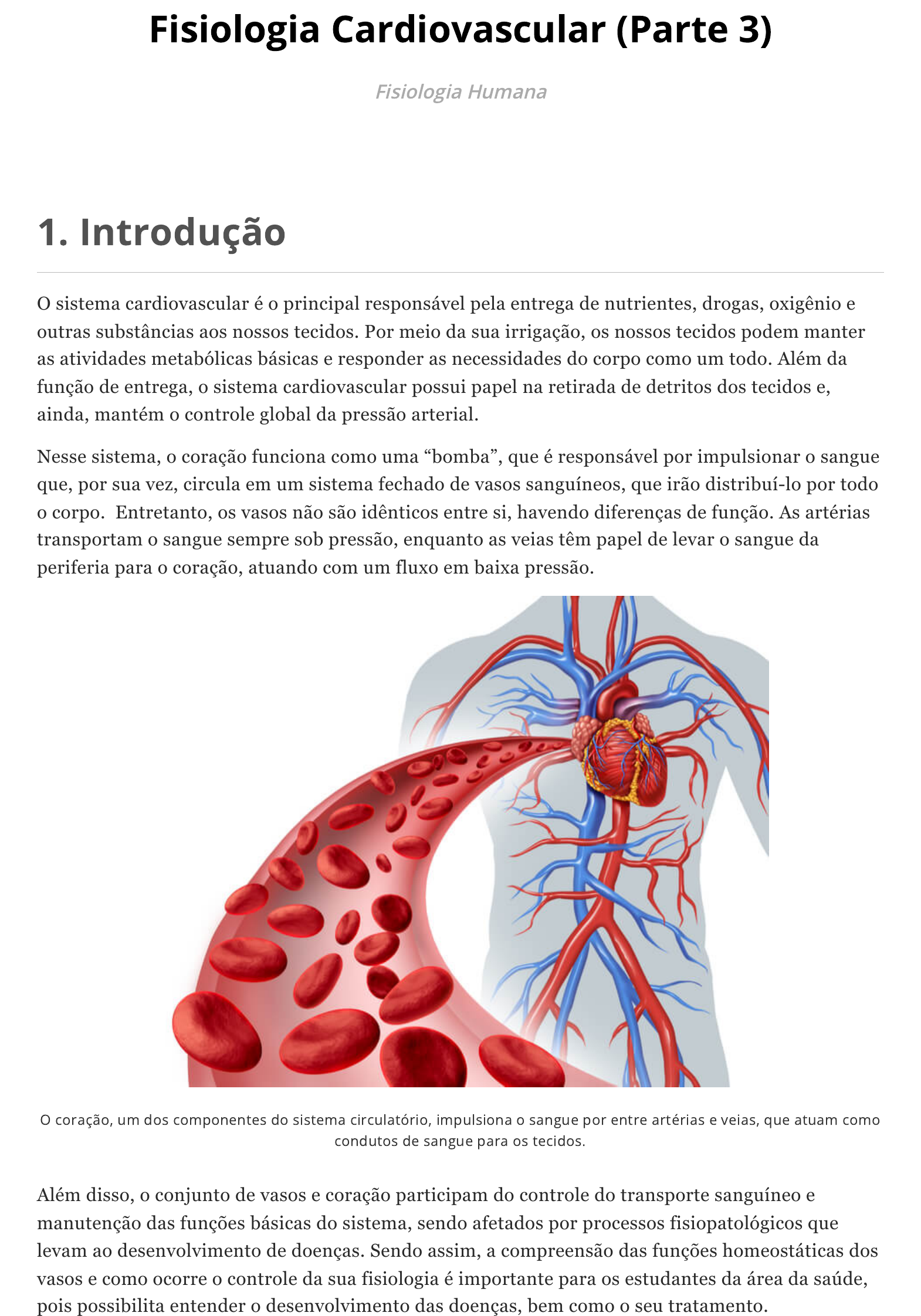 22/09/2023, 07:29 Fisiologia Cardiovascular (Parte 3) https://ceadsaladeaula.uvv.br/conteudo.php?aula=fisiologia-cardiovascular-parte-3&dcp=fisiologia-humana&topico=6 1/14 Fisiologia Cardiovascular (Parte 3) Fisiologia Humana 1. Introdução O sistema cardiovascular é o principal responsável pela entrega de nutrientes, drogas, oxigênio e outras substâncias aos nossos tecidos. Por meio da sua irrigação, os nossos tecidos podem manter as atividades metabólicas básicas e responder as necessidades do corpo como um todo. Além da função de entrega, o sistema cardiovascular possui papel na retirada de detritos dos tecidos e, ainda, mantém o controle global da pressão arterial. Nesse sistema, o coração funciona como uma “bomba”, que é responsável por impulsionar o sangue que, por sua vez, circula em um sistema fechado de vasos sanguíneos, que irão distribuí-lo por todo o corpo. Entretanto, os vasos não são idênticos entre si, havendo diferenças de função. As artérias transportam o sangue sempre sob pressão, enquanto as veias têm papel de levar o sangue da periferia para o coração, atuando com um fluxo em baixa pressão. Além disso, o conjunto de vasos e coração participam do controle do transporte sanguíneo e manutenção das funções básicas do sistema, sendo afetados por processos fisiopatológicos que levam ao desenvolvimento de doenças. Sendo assim, a compreensão das funções homeostáticas dos vasos e como ocorre o controle da sua fisiologia é importante para os estudantes da área da saúde, pois possibilita entender o desenvolvimento das doenças, bem como o seu tratamento. O coração, um dos componentes do sistema circulatório, impulsiona o sangue por entre artérias e veias, que atuam como condutos de sangue para os tecidos. https://cead.uvv.br/conteudo/wp-content/uploads/2019/09/aula_fishum_top06_img08.jpg 22/09/2023, 07:29 Fisiologia Cardiovascular (Parte 3) https://ceadsaladeaula.uvv.br/conteudo.php?aula=fisiologia-cardiovascular-parte-3&dcp=fisiologia-humana&topico=6 2/14 2. Sistema arterial e venoso O sistema cardiovascular possibilita a ligação das mais diversas partes do corpo, tendo como órgão central o coração, que atua bombeando o sangue por dentro dos vasos que, por sua vez, agem como vias condutoras do sangue para os diversos órgãos. Como foi visto anteriormente, existem duas formas de circulação chamadas de pequena e grande circulações. Em ambas, a rede de artérias e veias atuam de modo a direcionar o sangue que sai do coração aos diversos tecidos, retornando, ainda, com o sangue da periferia para o coração. Desse modo, podemos conceituar sistema circulatório como “ [...] um sistema fechado de condutos passivos, entregando sangue aos tecidos, onde são trocados nutrientes e dejetos metabólicos” (CONSTANZO, 2004), sendo que o fluxo sanguíneo nos órgãos é afetado diretamente pela resistência dos vasos. Neste momento, precisamos relembrar que o sangue oxigenado é enviado para todo o organismo através da artéria aorta, e o volume de sangue que é ejetado do coração em função do tempo é denominado débito cardíaco. O débito cardíaco é distribuído entre todos os órgãos, seguindo uma Imagem esquemática da pequena e grande circulação, representando a passagem do sangue nos diferentes vasos e nas câmaras cardíacas. https://cead.uvv.br/conteudo/wp-content/uploads/2019/09/aula_fishum_top06_img03.png 22/09/2023, 07:29 Fisiologia Cardiovascular (Parte 3) https://ceadsaladeaula.uvv.br/conteudo.php?aula=fisiologia-cardiovascular-parte-3&dcp=fisiologia-humana&topico=6 3/14 proporção relativamente pré-fixada, mas que pode ser alterada conforme a necessidade do organismo, por processos homeostáticos. Existem três principais formas de controle do fluxo sanguíneo tecidual. Na primeira, o débito cardíaco é direcionado aos órgãos que mais o necessitam por meio de mecanismos de mudança na resistência vascular daquele órgão; a segunda forma de controle se dá pela modificação no débito cardíaco, assim, ocorreria o aumento ou a redução do volume de sangue que é ejetado do coração; por fim, o terceiro mecanismo é uma combinação dos dois primeiros, em que há o aumento do volume ejetado e, ainda, alteração seletiva da resistência vascular periférica. Os mecanismos que norteiam o fluxo de sangue nos diferentes tecidos são chamados de hemodinâmica e compreendem fundamentos de física que são aplicados a dinâmicas de fluidos. Para iniciarmos, precisamos compreender as diferenças entre os vasos sanguíneos. É chamado de vaso sanguíneo o conjunto de condutos que transportam e direcionam o sangue aos tecidos e vice-versa. Além disso, alguns vasos estão relacionados com a troca de nutrientes e gases. Na figura abaixo, encontramos um esquema representativo dos vasos sanguíneos: Observa-se que existe uma ordem sequencial de passagem do sangue entre os vasos; inicialmente, eles saem do coração por meio de artérias que são calibrosas. A partir daí eles se ramificam em arteríolas que irão originar cadeias extremamente ramificadas, chamadas de capilares. Neste local, é onde ocorrem as trocas de nutrientes. A partir do capilar, o sangue é recolhido em vênulas que irão originar as veias que, por sua vez, seguem até o coração. Essa ordem é seguida em, praticamente, todos os tecidos, havendo algumas pequenas exceções, como na circulação porta- hepática, onde é possível visualizar uma cadeia de capilares precedida por vênulas. Esquema representativo dos vasos sanguíneos e sua organização. Você sabia? Na circulação porta-hepática, os nutrientes captados pelo intestino são enviados ao fígado por vênulas; ao chegarem neste órgão, uma nova rede de capilares é formada com o objetivo de possibilitar ao fígado a eliminação de xenobióticos, por meio da metabolização dessas substâncias. https://cead.uvv.br/conteudo/wp-content/uploads/2019/09/aula_fish