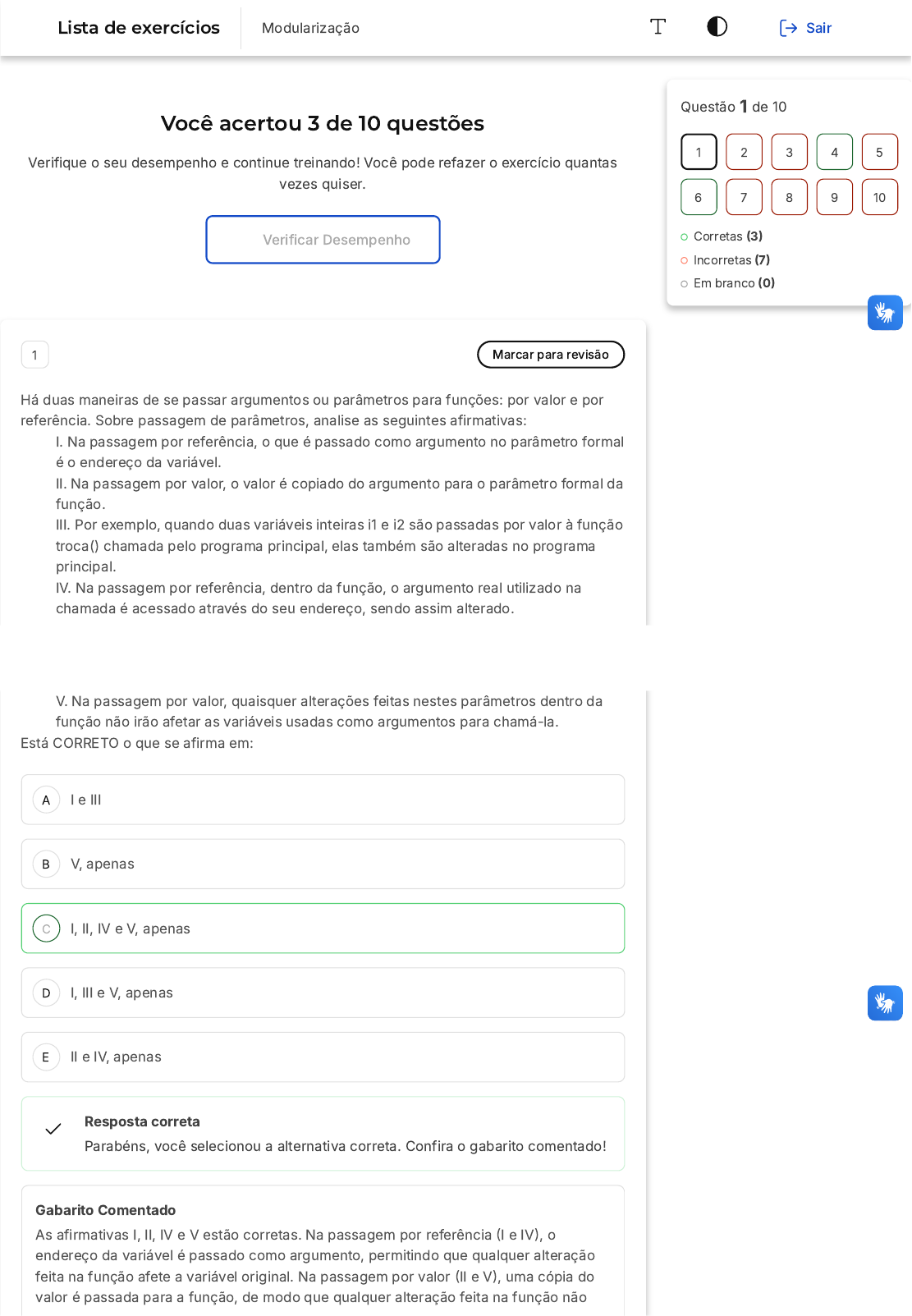 As afirmativas I, II, IV e V estão corretas. Na passagem por referência (I e IV), o