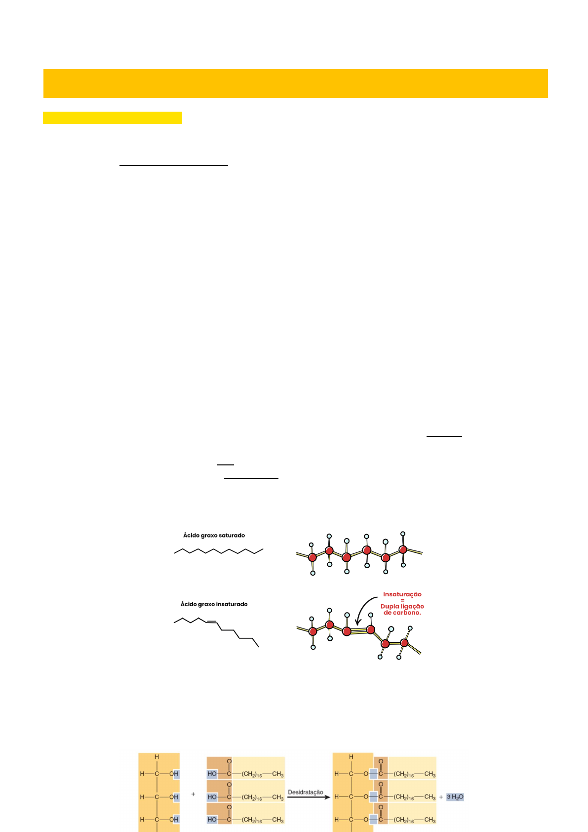 Maria Eduarda Ramos e Renata Marques - Medicina - turma 30D SP 3.2 → Tutoria CARACTERIZAÇÃO DOS LIPÍDIOS: CONCEITO E CARACTERÍSTICAS: os lipídios, também denominados gorduras, são moléculas constituídas, em sua maior parte, por átomos de hidrogênio e de carbono (hidrocarbonetos), ligados por ligações covalentes não polares. Logo, os lipídios não são polares e possuem baixa solubilidade em água, porém, podem ser solúveis em solventes orgânicos (éter, acetona, clorofórmio e etc). Em geral, estão localizados principalmente no plasma, no tecido adiposo e em membranas biológicas. Os lipídios mais abundantes são: triglicerídeos, colesterol, ácido aracdônico, fosfolipídios e vitaminas lipossolúveis. CLASSIFICAÇÃO: são classificados em: ● LIPÍDIOS SIMPLES: incluem as gorduras e as ceras, originados da reação de um álcool com ácido graxo. ○ Gorduras: ésteres de ácidos graxos com glicerol (um tipo de álcool). Os óleos são gorduras em estado líquido. ○ Ceras: ésteres de ácidos graxos com um álcool de cadeia longa, que não é glicerol. ● LIPÍDIOS COMPLEXOS: são ésteres de ácidos graxos que, além do álcool e dos ácidos graxos, contêm outros grupamentos. Podem ser: ○ Fosfolipídios: além dos ácidos graxos e álcool, contêm ácido fosfórico. ○ Glicolipídios: contêm ácido graxo, esfingosina e carboidrato. ○ Outros lipídios complexos: por exemplo, os aminolipídeos. As lipoproteínas podem ser classificadas dessa forma. ESTRUTURA DOS LIPÍDIOS: ● Ácidos graxos: são hidrocarbonetos de cadeia longa com um radical de ácido carboxílico em uma de suas extremidades, que contêm, geralmente, 16 ou 18 carbonos. São classificados em saturados ou insaturados. São ácidos graxos saturados quando todos seus carbonos são ligados por ligações covalentes SIMPLES (ou seja, não possui ligação dupla). São ácidos graxos insaturados quando contêm uma ou mais ligações duplas entre os átomos de carbono. Se houver apenas uma ligação dupla no ácido graxo insaturado, denomina-se "ácido graxo monoinsaturado", mas, se houver mais de uma ligação dupla, denomina-se "ácido graxo poli-insaturado". Em sua maioria, os ácidos graxos estão na geometria cis. Um exemplo de ácido graxo essencial é o ômega-3. Os ácidos graxos podem ser estruturalmente alterados, durante o processamento de determinados alimentos gordurosos, gerando os chamados "ácidos graxos trans". ● Triglicerídeos (triacilgliceróis): são os lipídios mais encontrados no corpo humano, também chamados de "gordura". São a forma de armazenamento dos lipídios no tecido adiposo. Os triglicerídeos são formados por 3 ácidos graxos e um glicerol. São encontrados no sangue e podem ser sintetizados no fígado. São armazenados em grandes quantidades no tecido adiposo, servindo como reserva de energia para o corpo, principalmente em situações de jejum ou em necessidade de energia extra, como durante exercícios físicos. ● Fosfolipídios: assemelha-se aos Maria Eduarda Ramos e Renata Marques - Medicina - turma 30D triglicerídeos na sua estrutura (ácidos graxos e glicerol), porém, há ligação com um fosfato. Constituem uma região polar (hidrofílica) em uma de suas extremidades e uma região não polar (hidrofóbica) na extremidade oposta, ou seja, os fosfolipídios são anfipáticos (extremidades polar e apolar). O álcool em suas ligações, geralmente, é o glicerol (glicerofosfolipídios), mas, nos esfingofosfolipídios, o álcool é a esfingosina. São os principais constituintes lipídicos das membranas. ● Esteróides: possui uma estrutura diferente das demais. É constituído por quatro anéis interconectados de átomos de carbono. Alguns grupos hidroxila (OH), que são polares, podem ser aderidos a esses anéis. Exemplos de esteróides são: colesterol, o cortisol das glândulas suprarrenais e hormônios sexuais feminino e masculino (estrogênio e testosterona, respectivamente) secretados pelas gônadas. FUNÇÕES DOS LIPÍDIOS: os lipídios desempenham diversas funções, dentre elas: ● Reserva de energia (a principal função); ● Função estrutural das membranas; ● Isolamento térmico; ● Proteção de órgãos; ● Função hormonal. DIGESTÃO E ABSORÇÃO DOS LIPÍDIOS: O processo de digestão consiste na quebra das partículas alimentares em subunidades absorvíveis. No caso das gorduras (lipídios), a boca e o estômago têm atuação limitada; a digestão inicia predominantemente no intestino delgado. O primeiro passo na digestão das gorduras é quebrar fisicamente as grandes gotículas de gordura em tamanhos pequenos para que as enzimas digestivas solúveis em água (lipases) possam atuar nas suas superfícies. Esse processo se chama de emulsificação, ocorrendo principalmente no duodeno, sob a influência da bile através dos sais biliares (derivados do colesterol) e lectina. O processo de emulsificação permite que as enzimas digestivas ajam eficientemente. Depois, os triacilgliceróis, os ésteres de colesterol e os fosfolipídios da dieta são degradados enzimaticamente por enzimas pancreáticas. Por exemplo: a lipase pancreática remove ácidos graxos dos triacilgliceróis. A secreção dessas enzimas digestivas são controladas hormonalmente. Na mucosa do intestino delgado há células que produzem um hormônio chamado Maria Eduarda Ramos e Renata Marques - Medicina - turma 30D Colecistocinina (CCK). A CCK age sobre a vesícula biliar, fazendo-a contrair e liberar bile, e sobre células exógenas do pâncreas, fazendo-as liberar enzimas digestivas. Há também a secreção de um hormônio peptídico chamado secretina, que induz o pâncreas e o fígado a liberarem uma solução aquosa rica em bicarbonato, que ajuda a neutralizar o pH do quimo que entra no intestino. Os produtos de degradação dos lipídios, juntamente dos sais biliares, formam as micelas mistas. Todos esses compostos, então, são associados a lipopro