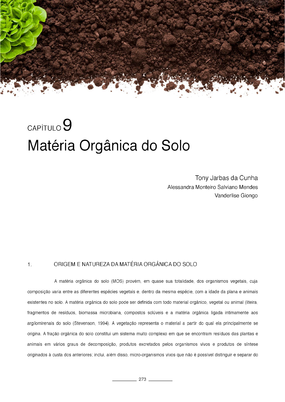CAPÍTULO 9 Matéria Orgânica do Solo Tony Jarbas da Cunha Alessandra Monteiro Salviano Mendes Vanderlise Giongo 1. ORIGEM E NATUREZA DA MATÉRIA ORGÂNICA DO SOLO A matéria orgânica do solo (MOS) provém, em quase sua totalidade, dos organismos vegetais, cuja composição varia entre as diferentes espécies vegetais e, dentro da mesma espécie, com a idade da plana e animais existentes no solo. A matéria orgânica do solo pode ser definida com todo material orgânico, vegetal ou animal (liteira, fragmentos de resíduos, biomassa microbiana, compostos solúveis e a matéria orgânica ligada intimamente aos argilomirenais do solo (Stevenson, 1994). A vegetação representa o material a partir do qual ela principalmente se origina. A fração orgânica do solo constitui um sistema muito complexo em que se encontram resíduos das plantas e animais em vários graus de decomposição, produtos excretados pelos organismos vivos e produtos de síntese originados à custa dos anteriores; inclui, além disso, micro-organismos vivos que não é possível distinguir e separar do 273material orgânico morto. Para Roscoe & Machado (2002), podem ser incluídas todas as substâncias resultantes da decomposição de plantas aquáticas e terrestres (inclusive turfeiras), além da biomassa total do solo. Apesar de se encontrar diferenças entre as espécies, ocorre certa constância entre os componentes básicos das plantas, variando o percentual dos constituintes estruturais. Segundo Waksman (1936), em termos percentuais de peso do vegetal seco, os componentes dos vegetais são, comumente, divididos em seis grandes grupos: (1) Celulose (15 - 60%); (2) Hemicelulose (10 -30%); (3) Lignina (5 30%); (4) Fração solúvel em água (5 30% incluindo açucares, amino ácidos e ácidos alifáticos); (5) Fração solúvel em éter ou em álcool (1 - 15% incluído gorduras, óleos e ceras) e (6) Proteínas 10%). Por outro lado, Dick et al., (2009), reportam que 90 da estrutura da MOS é composta de carbono, oxigênio, nitrogênio e hidrogênio (em média 55, 34, 3 e 5%, respectivamente). Os constituintes minerais usualmente encontrados na cinza variam de 1 12%. A idade da planta influencia na proporção relativa dos componentes. Assim, plantas mais jovens são mais ricas em proteínas, minerais e na fração solúvel em água, enquanto, à medida que a planta envelhece, as frações celulose, hemicelulose e ligninas aumentam. Durante a decomposição da matéria orgânica pela ação de enzimas e micro-organismos, alguns componentes são mais prontamente utilizados do que outros. A fração solúvel em água e proteínas são os primeiros compostos a serem metabolizados. A celulose e hemicelulose não desaparecem com a mesma intensidade, sendo a permanência destes compostos no solo muito curta. As ligninas são altamente resistentes, tornando-se, às vezes, relativamente mais abundantes na matéria orgânica em decomposição. A relação carbono/nitrogênio (C:N) pode determinar a cinética de decomposição. Deve-se considerar a dinâmica da relação C:N sob dois aspectos: (a) relação C:N dos micro-organismos e (b) relação C:N da matéria orgânica. No primeiro caso, verifica-se que a relação C:N das células microbianas varia bastante. Em termos médios pode-se considerar que nos fungos essa relação está em torno de 10:1, nos actinomicetos em torno de 8:1, nas bactérias aeróbicas igual a 5:1 e nas bactérias anaeróbicas igual a 6:1. A MOS é a principal fonte de carbono (C para os micro-organismos, porém, nem todo C da matéria orgânica é transformado em célula microbiana. Grande parte se perde sob a forma de CO2 decorrente de sua mineralização. A quantidade de C da matéria orgânica, assimilável pelos micro-organismos do solo, é variável segundo micro-organismo ou grupos de micro-organismos considerados. Em termos percentuais, têm-se os seguintes coeficientes assimilatórios do carbono orgânico total (COT): fungos (30 - 40%); actinomiceteos (15 - 30%) e bactérias (1 - 15%). Na prática, considera-se o coeficiente assimilatório do carbono orgânico em torno de 2742. EVOLUÇÃO DA MATÉRIA ORGÂNICA No que se refere à evolução, o ciclo da decomposição da matéria orgânica pode ser rápido, com é caso dos solos bem drenados, arejados e pouco ácidos ou, muito lento, nos solos com excesso de água ou ácidos. No primeiro caso, a atividade biológica se desenvolve fortemente por um grande número de micro-organismos aeróbios, que promovem uma biodegradação rápida das matérias vegetais, e como produtos resultantes estão o e NH3, que são liberados durante as transformações; e as substâncias solúveis ou insolúveis que, posteriormente, vão formar compostos húmicos mais ou menos polimerizados a depender do pH do meio. Os compostos preferencialmente os ácidos cítricos e málicos, não terão muito tempo no solo, pois, sob influência mineralizante de uma microflora muito ativa, desaparecem rapidamente em profundidade (Bruckert, 1970). Nos solos submetidos a um regime hídrico temporário ou permanente, há uma fraca atividade dos micro- organismos e consequentemente pouca decomposição dos produtos mal decompostos. O estado de anaerobiose no solo favorece uma evolução particular da matéria orgânica, com a liberação de elementos gasosos tais como: NH3 e algumas vezes de H2 e CH4 (Boyer, 1971). Os produtos de decomposição realizam apenas fenômenos de polimerização limitada, daí a produção dominante de produtos ácidos solúveis, de ácidos fúlvicos (AF), assim como, de ácidos húmicos (AH) marrons de fraco peso molecular (Dabin, 1980/81). A matéria orgânica evoluída sob influência da hidromorfia, onde não ouve acúmulo de substâncias orgânicas pouco decompostas, apresenta na sua constituição uma maior proporção de compostos hidrossolúveis e de produtos fracamente polimerizados que nos solos bem drenados, o que favorecem o desenvolvimento de