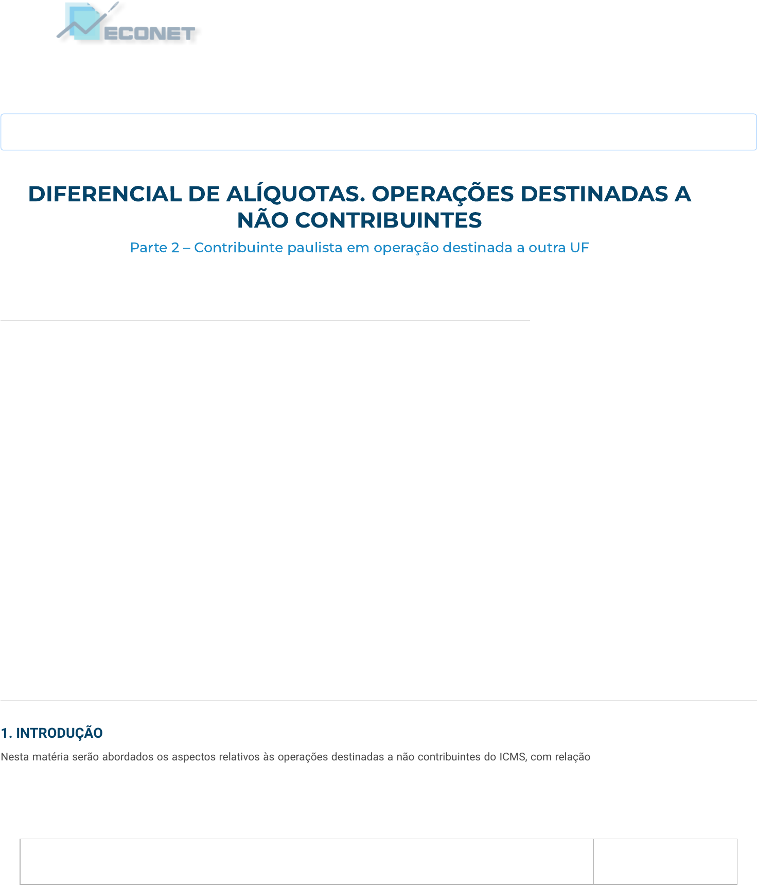 ICMS/SP Boletim ICMS n° 09 - 1ª Quinzena. Publicado em: 05/05/2023 DIFERENCIAL DE ALÍQUOTAS. OPERAÇÕES DESTINADAS A NÃO CONTRIBUINTES Parte 2 – Contribuinte paulista em operação destinada a outra UF 1. INTRODUÇÃO Nesta matéria serão abordados os aspectos relativos às operações destinadas a não contribuintes do ICMS, com relação ao recolhimento do Diferencial de Alíquotas (DIFAL), previsto na Emenda Constitucional n° 087/2015 e Convênio ICMS n° 236/2021. Pela extensão do assunto, esta matéria foi dividida em duas partes. A primeira trata das operações de contribuintes de outras Unidades Federadas destinando mercadorias para não contribuintes localizados no Estado de São Paulo. A leitura poderá ser realizada no boletim indicado abaixo: DIFERENCIAL DE ALÍQUOTAS. OPERAÇÕES DESTINADAS A NÃO CONTRIBUINTES Parte 1 - Contribuinte de outra UF em operação destinada a São Paulo Boletim N° 08/2023 Nesta segunda parte, serão abordadas as regras a serem observadas, quando o contribuinte paulista destina mercadorias para outras Unidades Federadas. 2. TRIBUTAÇÃO NA ORIGEM Em regra geral, as alíquotas interestaduais previstas no Estado de São Paulo deverão ser aplicadas nas operações e prestações interestaduais destinadas a não contribuintes do ICMS, de acordo com os incisos II e III e § 2° do artigo 52 do Regulamento do ICMS do Estado de São Paulo (RICMS/SP), aprovado pelo Decreto n° 45.490/2000, nos quais relaciona: a) 7%, nas operações ou prestações destinadas às regiões Norte, Nordeste, Centro-Oeste e ao Estado de Espírito Santo; b) 12%, nas operações ou prestações destinadas às regiões Sul e Sudeste; c) 4%, nas operações interestaduais com bens e mercadorias importadas do exterior ou com Conteúdo de Importação superior a 40%. Cabe ressaltar ainda que, de acordo com o item 2 do § 2° do artigo 52 do RICMS/SP, não será aplicado 4% sobre bens e mercadorias que não possuam similar nacional, aqueles que estão previstos em lista publicada pelo Conselho de Ministros da Câmara de Comércio Exterior (Camex), nos termos da Resolução Camex n° 326/2022 e Resolução do Senado Federal n° 013/2012. Matéria elaborada conforme a legislação vigente à época de sua publicação, sujeita a mudanças em decorrência das alterações legais. Roteiro 1. INTRODUÇÃO 2. TRIBUTAÇÃO NA ORIGEM 2.1. Remetente do Regime Periódico de Apuração (RPA) 2.1.1. Ressarcimento de imposto 2.2. Remetente Simples Nacional 3. CONTRIBUINTE PAULISTA EM OPERAÇÃO DESTINADA A OUTRA UF 3.1. Emissão de documento �scal 3.2. Cálculo do imposto 3.3. Escrituração Fiscal Digital (EFD) 4. RECOLHIMENTO 4.1. Prazos para recolhimento 4.2. Guia de recolhimento 5. OPERAÇÕES DIVERSAS 5.1. Operação presencial para não contribuinte de outra UF 5.2. Construção civil – entrega em local diverso 5.3. Operações em feiras 6. DEVOLUÇÃO DE NÃO CONTRIBUINTE DE OUTRA UF 6.1. Emissão de documento de entrada 6.2. Escrituração Fiscal Digital (EFD) 7. SIMPLES NACIONAL https://www.econeteditora.com.br/bdi/e-h/2015/emenda_constitucional_087_2015.php https://www.econeteditora.com.br/bdi/bc/b21/convenio_icms_236_2021.php https://www.econeteditora.com.br/boletim_icms/bo-icms-sp/sp-23/09_diferencial_aliquotas_parte1.php https://www.econeteditora.com.br/icms_sao_paulo/livro1-art1a259.asp#art52_ii https://www.econeteditora.com.br/icms_sao_paulo/livro1-art1a259.asp#art52_iii https://www.econeteditora.com.br/icms_sao_paulo/livro1-art1a259.asp#art52_p2 https://www.econeteditora.com.br/icms_sao_paulo/livro1-art1a259.asp#art52 https://www.econeteditora.com.br/icms_sao_paulo/leg-sp/leg00/dec_00/decreto45490_2000.asp https://www.econeteditora.com.br/icms_sao_paulo/livro1-art1a259.asp#art52_p2_2 https://www.econeteditora.com.br/icms_sao_paulo/livro1-art1a259.asp#art52_p2 https://www.econeteditora.com.br/icms_sao_paulo/livro1-art1a259.asp#art52 https://www.econeteditora.com.br/bdi/res/rs22/res_gecex_326_2022.php https://www.econeteditora.com.br/bdi/res/rs12/resolucao013_senado_federal_2012.php ICMS/SP Boletim ICMS n° 09 - 1ª Quinzena. Publicado em: 05/05/2023 Com relação à inaplicabilidade da alíquota de 4%, indica-se a ferramenta Importados – Alíquotas 4%. 2.1. Remetente do Regime Periódico de Apuração (RPA) O fato gerador do ICMS ocorre no momento da saída da mercadoria do estabelecimento de contribuinte, conforme disposto no inciso I do artigo 2° do RICMS/SP. Dessa forma, para as empresas do Regime Periódico de Apuração (RPA), quando a saída for destinada a não contribuinte do ICMS, localizado em outra Unidade da Federação, o imposto da operação própria deverá, em regra, ser tributado normalmente, exceto se o produto possuir algum benefício �scal especí�co. 2.1.1. Ressarcimento de imposto O contribuinte localizado no Estado de São Paulo, quando estiver na condição de substituído tributário, com relação ao imposto que havia sido retido anteriormente por substituição tributária nesse mesmo estado, poderá ser ressarcido do valor do imposto retido para essa UF, na hipótese de saída de mercadoria destinada a outro estado, nos termos do inciso IV do artigo 269 do RICMS/SP e Portaria CAT n° 042/2018. Ainda, o valor do ICMS próprio também poderá ser aproveitado, de acordo com o artigo 271 do RICMS/SP, quando admitido, por meio do lançamento no Registro de Apuração do ICMS, no quadro "Crédito do Imposto – Outros Créditos", com a expressão "Crédito Relativo à Operação Própria do Substituto", mediante aplicação da alíquota interna sobre a base de cálculo que seria atribuída à operação própria do remetente, caso estivesse submetida ao regime comum de tributação, conforme § 1° do artigo 271 do RICMS/SP. Os lançamentos referentes ao artigo 271 do RICMS/SP deverão ser informados na EFD ICMS IPI no Registro E111 com o código de ajuste “SP020721” (Crédito relativo à operação própria do Substituto em opera