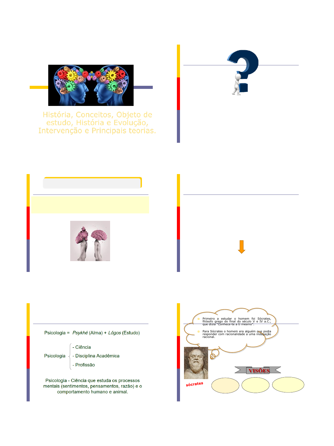 06/02/2025 1 PSICOLOGIA História, Conceitos, Objeto de estudo, História e Evolução, Intervenção e Principais teorias. O QUE É PSICOLOGIA” ? O QUE VEM À SUA MENTE QUANDO VOCÊ PENSA “ PSICOLOGIA” ? E UM “PSICÓLOGO”... ... O QUE SERIA ? CONCEITOS DE PSICOLOGIA É a ciência que estuda o comportamento humano e os processos mentais, compreendendo os sentimentos, pensamentos, razão, emoções, impressões e outras questões inerentes ao sujeito (MAIA, 2020) PSICO – LOGIA Psyche (mente)(grego) Logos (grego)= estudo ETIMOLOGIA DA PALAVRA Relações entre o pensamento humano (homem) e o seu comportamento. ETIMOLOGIA DA PALAVRA Primeiro a estudar o homem foi Sócrates, filósofo grego do final do século V e IV a.C., que dizia “Conhece-te a ti mesmo”. Para Sócrates o homem era alguém que podia responder com racionalidade a uma indagação racional. O QUE É O HOMEM? ANTROPOCÊNTRICATEOCÊNTRICACOSMOCÊNTRICA 06/02/2025 2 Descartes Um ser racional RAMOS, 200 Sartre Um Ser livre . Marcel Um ser vivo, consciente, sociável e problemático Bobbio Um ser religioso ; Comte Um ser de ciência Aristóteles Um ser essencialmente social e político O QUE É O HOMEM? Freud Um ser de desejo e luta O QUE É O HOMEM ? PSICOLOGIA FENÔMENO HUMANO MÚLTIPLAS MANIFESTAÇÕES DO COMPORTAMENTO E DA RACIONALIDADE AMBIENTE EmoçõesSentimentos Comportamento Pensamento O QUE É O HOMEM ? SER SOCIEDADE PROCESSO CIVILIZADOR CULTURA Estado Comportamentos e práticas sociais individuais e coletivas Ordem simbólica PSICOLÓGICO => Comportamento, Emoção, Sentimento, Mente, Processos mentais, Desenvolvimento, Personalidade, Aprendizagem, Motivação. SOCIAL => Interação social e grupos organizados CULTURAL => História, crenças, costumes, usos, filosofia, linguagem, etc. BIOLÓGICO => Anatômico, bioquímico e fisiológico. O QUE É O HOMEM? 06/02/2025 3 HISTÓRIA E EVOLUÇÃO DA PSICOLOGIA A psicologia é tão antiga quanto o desenvolvimento do pensamento subjetivo: remonta ao início da preocupação do homem com as suas percepções e emoções, que abrange, também, o desenvolvimento do pensamento racional sobre o mundo, sobre os seres humanos e sobre si mesmo (COLLETA, 2018) HISTÓRIA E EVOLUÇÃO DA PSICOLOGIA Os conhecimentos de outras áreas, como: a filosofia e a espiritualidade de cada cultura se misturavam na jornada para entender a mente humana. A busca pela compreensão da mente humana é milenar . COLLETA, 2018 HISTÓRIA E EVOLUÇÃO DA PSICOLOGIA A psicologia surgiu como ciência há menos de 200 anos. O termo “Psicologia” foi usado pela primeira vez em 1590 como título de uma obra escrita por Rudolf Goclenius (1547-1628), professor da Universidade de Marburgo na Alemanha (PRADO-NETTO; COSTA, 2017) Esse desprendimento ocorreu em meados do século XIX, quando as ciências humanas adotaram as metodologias empíricas como ciência.; No século XIX foi reconhecida como uma ciência que estuda o comportamento e o psiquismo humano; A partir dos estudos do comportamento e dos fenômenos mentais, aplicando o método científico, surgiu a psicologia científica e experimental, com a inauguração do primeiro laboratório experimental. A psicologia originou-se da filosofia Com o desprendimento da psicologia da filosofia a psicologia se desenvolve como ciência humana, quando se toma consciência de que o conhecimento científico não é filosófico. psiquismo humano COLETTA, 2018 HISTÓRIA E EVOLUÇÃO DA PSICOLOGIA (MAIA, 2024). Se contrapõe ao modelo positivista, a psicologia possui um estatuto próprio enquanto ciência humana marcada por uma pluralidade de objetos (SANTOS, 2008) PARADIGMA Definida como ciência do comportamento, a partir da forte influência de correntes cientificistas (PRADO FILHO; MARTINS, 2007) Sua origem filosófica a coloca como um campo de reflexão sobre a alma e a mente. Assim, o estudo da psicologia seria a experiência humana ou a consciência, ou o abandono dessas concepções, por serem consideradas imprecisas e de difícil medição. OBJETO DE ESTUDO Qual é, afinal, o objeto específico de estudo da psicologia? Embora o estudo da mente seja milenar a psicologia surgiu como ciência, efetivamente, no século XIX . HISTÓRIA E EVOLUÇÃO DA PSICOLOGIA 06/02/2025 4 Funcionalismo Associacionismo Behaviorismo Psicanálise Gestalt Estruturalismo COSTA, 2005 Sóciointeracionista Principais correntes Psicológicas Construtivista Psicogenética As primeiras correntes Funcionalismo William James (1842-1910) ESTRUTURALISMO Estudou a consciência em seus aspectos estruturais. Wundt (1832-1920) ASSOCIACIONISMO O conhecimento é construído a partir da associação de ideias As ideias são cópias das impressões recebidas pelos sentidos Thorndike (1874-1949) FUNCIONALISMO Buscava compreender como é a interação do organismo com o ambiente a adaptação do sujeito no ambiente, entendendo sua funcionalidade e utilidade -TCC James(1842-1910) As primeiras correntes PRINCIPAIS CONTRIBUIDORES (COLETTA, 2018). O marco da psicologia ocorreu 1879, com o filósofo e psicólogo Wilhelm Wundt; Fundou o primeiro laboratório experimental de Psicologia na Universidade de Leipzig na Alemanha. Corrente: : ESTRUTURALISMO WUNDT A partir deste marco passou-se a estudar a mente humana com rigor científico. Wundt (1832-1920) fundador da psicologia científica e “Pai da Psicologia Experimental “; Primeira corrente da psicologia o Estruturalismo experiência consciente imediata, que investiga como um sujeito apreende sensações e sentimentos; Tornou a Psicologia independente da Filosofia contribuindo para novos estudos. Contribuiu na Psicologia Social, que estuda os comportamentos em sociedade, causados por interações entre pessoas e a partir de suas linguagens e seus hábitos culturais. Método da introspecção para estudar a consciência. Contrapondo-se a este filósofo, apresentou-se, em 1890, Willian James (1842- 1910), conhecido como o “ Pai da psicologia american