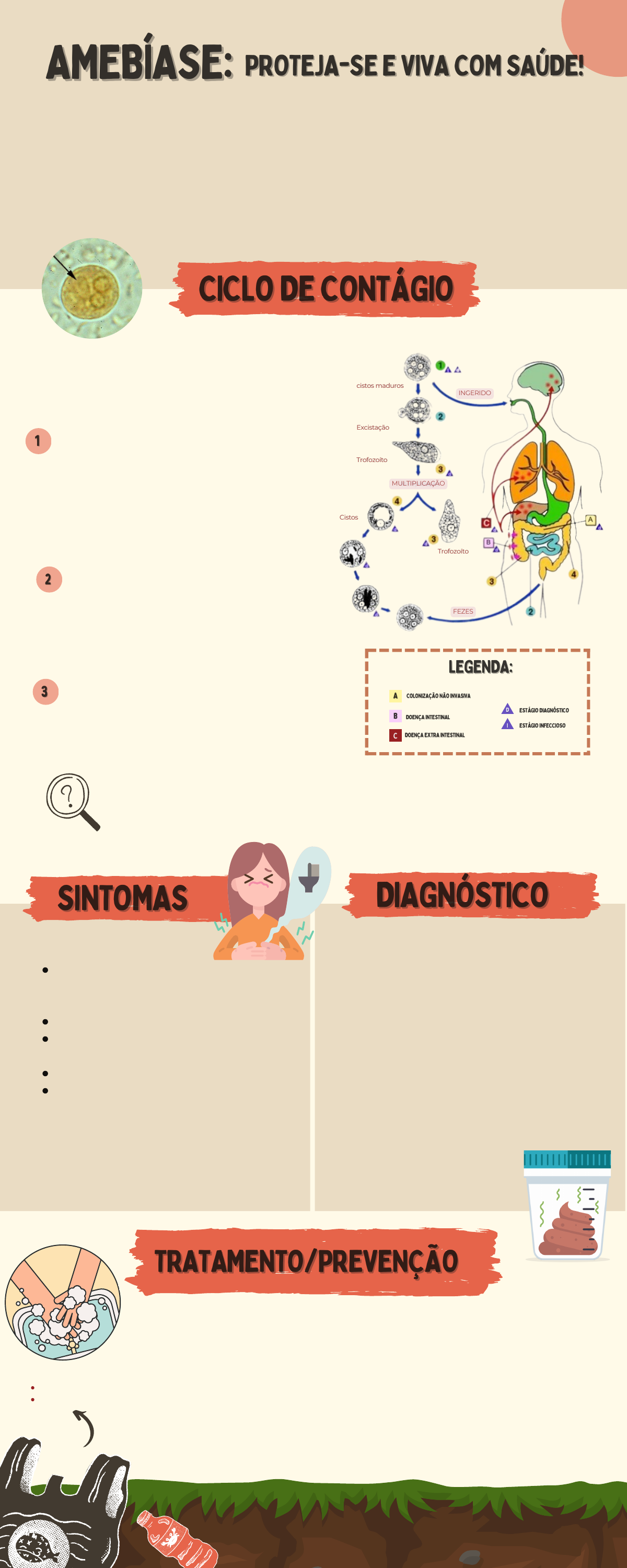11 LEGENDA:LEGENDA: AA BB CC COLONIZAÇÃO NÃO INVASIVACOLONIZAÇÃO NÃO INVASIVA DOENÇA INTESTINALDOENÇA INTESTINAL DOENÇA EXTRA INTESTINALDOENÇA EXTRA INTESTINAL ESTÁGIO DIAGNÓSTICOESTÁGIO DIAGNÓSTICO ESTÁGIO INFECCIOSOESTÁGIO INFECCIOSO dd ii cistos maduroscistos maduros ExcistaçãoExcistação TrofozoítoTrofozoíto MULTIPLICAÇÃO CistosCistos TrofozoítoTrofozoíto FEZES INGERIDO SANEAMENTO BOA HIGIENE aLGUMAS PESSOAS PODEM SER PORTADORAS ASSINTOMÁTICAS. pORÉM, MESMO SEM SINTOMAS ESSAS PESSOAS PODEM TRANSMITIR A DOENÇA A amebíase é uma infecção intestinal causada por um parasita chamado Entamoeba histolytica que pode trazer desconforto e complicações para a saúde. É a segunda causa de morte por parasitose. Aprenda como se proteger e garantir o seu bem-estar e de sua família. AMEBÍASE:AMEBÍASE: PROTEJA-SE E VIVA COM SAÚDE!PROTEJA-SE E VIVA COM SAÚDE! CICLO DE CONTÁGIOCICLO DE CONTÁGIO SINTOMASSINTOMAS DIAGNÓSTICODIAGNÓSTICO TRATAMENTO/PREVENÇÃOTRATAMENTO/PREVENÇÃO O diagnóstico é feito através da realização do exame parasitológico de fezes (EPF) com a identificação morfológica dos cistos e trofozoítos da E. histolytica. Em geral, formas císticas são encontradas em fezes consistentes e trofozoíticas em material fecal diarréico ou pastoso. O tratamento é feito por meio de cuidados individuais e do uso de antiparasitários Prevenir a contaminação de alimentos e água com fezes humanas é essencial para prevenir a amebíase. Aprimorar os sistemas de saneamento em áreas em que a infecção é comum pode ajudar. DIARREIA: fezes solta e aquosas (com presença de sangue) CÓLICAS ABDOMINAIS FEBRE (em casos mais graves) FADIGA PERDA DE PESO CISTO: é a forma infectante do parasita que é eliminado nas fezes. Podem sobreviver no ambiente por tempo prolongado e contaminar água, alimentos e objetos. Ao se alimentar com alimentos contaminados acontece a infecção. INTESTINO GROSSO: os cistos se abrem e liberam forma trofozoítas. Elas se alimentam de bactérias e células intestinais, reproduzem-se e podem causar danos à mucosa intestinal. 22 O ciclo biológico da Entamoeba histolytica envolve 2 estágios principais: os cistos e a forma trofozoíta: DISSEMINAÇÃO: em alguns casos a forma trofozoítas podem penetrar na parede intestinal e disseminar para outros orgãos, como fígado (causando abscessos). 33 espécies não patogênicas possuem um ciclo biológico semelhante, porém não são capazes de causar doenças nos seres humanos. Logo, podem ser encontradas no intestino de pessoas saudáveis, mas não apresentam risco de contaminação e/ou complicações.