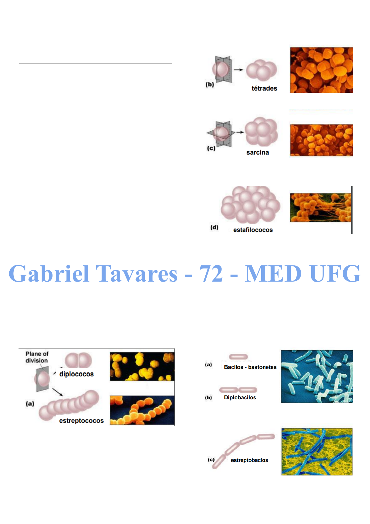 Gabriel Tavares - 72 - MED UFG Bactérias — Quanto menor a célula, maior a área de superfície e m relação ao seu volume ● Quando fazemos uma relação entre o superfície com seu próprio volume (necessidade metabólica) ● Isso implica no fato de que, proporcionalmente, as bactérias consomem mais substrato que a célula eucarióticas ● Tamanho pequeno = crescimento mais rápido — A maioria das bactérias são monomórficas, apresentando uma forma única, diferentemente das pleomórficas, que podem assumir múltiplas formas. → Arranjo dos cocos (Gran positivas no geral) ● Isolados ● Diplococos: dois cocos em formato de lagarta ● Estreptococos: vários cocos em formato de lagarta ● Tétrades: 4 cocos em formato de “quadrado” ● Sarcina: cocos em formato de cubo ● Estafilococos: vários cocos entrelaçados ○ Staphylococcus aureus — Vale lembrar que , apesar de estarem unidas, os cocos não dependem umas das outras, elas apenas se comunicam. → Arranjo dos bacilos/bastonetes (Gran negativos no geral) ● Isolados ● Diplobacilos ● Estreptobacilos ● Cocobacilos Gabriel Tavares - 72 - MED UFG — Vale lembrar que eles se multiplicam em apenas um plano — Vibriões: formato de bacilo encurvado, como se fosse uma vírgula — Espirilos: formato helicoidal rígido, curto e espesso, como um saca-rolhas — Espiroquetas: formato helicoidal flexível, longo e fino → Citologia bacteriana: ● Material genético: disperso no citoplasma, é um DNA circular ● Não possui organelas ● Parede celular: constituída de peptideoglicanos - as bactérias dependem muito da parede celular pra sobreviver, pois ela é responsável por uma permeabilidade seletiva ● Citoesqueleto: não está presente ● Recombinação: não possui, exceto pelos plasmídeos ● Ribossomos: possuem ribossomos 70S ● Divisão celular: realizada através da divisão binária — Estruturas essenciais e acessórias: — Estruturas acessórias: são estruturas que não são essenciais para a sobrevivência, porém, quando presentes, podem conceder algum tipo de vantagem à bactéria 1. Flagelo: atua na propulsão, responsável pela motilidade. O flagelo é caracterizado pelo antígeno H (flagelar). É composto por proteínas nomeadas flagelinas. Quando uma bactéria tem flagelo, ela pode responder a estímulos ou obter tropismo, se locomovendo ou se distanciando de acordo com um estímulo. PUMPs - padrões moleculares de patógenos - 2. Fímbrias: estruturas formadas por proteínas, chamadas de adesinas, promovem a adesão, interagem com moléculas específicas do hospedeiro, elas podem explicar o motivo de algumas bactérias causarem patologias em locais anatômicos específicos no corpo humano. Gabriel Tavares - 72 - MED UFG 3. Cápsula: glicocálice - “capa de açucar”, é composto de carboidratos e viscoso, a cápsula pode contribuir para a virulência - forte aderência = cápsula; fraca aderência = camada limosa. Cada variante de bactéria possui um tipo capsular único, o que dificulta, por exemplo, a vacinação, pois, a variabilidade das cápsulas pode afetar a eficácia da imunização. O antígeno K (capsular) 4. Pili: – geralmente são mais longos que as fímbrias e estão presentes em apenas uma(1 pilus)ou duas(2 pili) estruturas por célula. Os pili são responsáveis pelo processo de transferência DNA conhecido como conjugação — Estruturas essenciais 1. Parede celular:confere forma celular, protege a bactéria contra a lise, oferece adesão para o flagelo. Ela é responsável por diferenciar as bactérias entre gram positivas e gram negativas. É composta de peptidoglicano ● Composição: repetição de subunidades de dissacarídeos, N-acetil-glucosamina, ácido N-acetil murâmico, cadeias laterais de pentapeptídeos ligadas às subunidades de nam, ligação cruzada de aminoácidos ligam os pentapeptídeos ○ NAM e NAG se unem através de ligações glicosídicas ○ Enzima transpeptidase - enzima que realiza as ligações cruzadas do peptideoglicano) - ○ Esse peptidoglicano forma uma rede/arcabouço que dá ○ proteção e resistência em todas dimensões ● Bactérias gram-positivas: ○ Espessura do peptidoglicano é bem espesso ○ LPS ausente ○ Ácidos teicoicos ○ Espaço periplasmático ausente ou pequeno ● Bactérias gram-negativas: possuem a mesma membrana plasmática, uma ou poucas camadas de peptideoglicanos, possuem uma segunda camada lipídica interna, porém possuem Lipopolissacarídeos (LPS) em sua membrana exterior ○ O LPS é uma molécula altamente inflamatória ○ Espaço periplasmático presente e bem desenvolvido Gabriel Tavares - 72 - MED UFG ● Coloração pela técnica de Gram: ○ Gram-positivas = retêm o cristal violeta porque a camada espessa de peptidoglicano impede a saída do corante -> Resultado: cor roxa ○ Gram-negativas = perdem o cristal violeta na etapa de lavagem com álcool, devido à parede fina. Resultado -> cor rosa/vermelha ● Resistência a antibióticos: ○ Gram-positivas: são sensíveis a antibióticos que inibem a síntese de parede celular, como a penicilina e as cefalosporinas ○ Gram-negativas: muito resistentes, pois sua membrana externa impede a entrada de fármacos e muitas possuem bombas de efluxo que expulsam o fármaco 2. Membrana plasmática: ● Síntese de lipídios ● Síntese de parede celular ● Transporte de nutrientes ● Quimiotaxia ● Transporte de elétrons ● Secreção de proteínas ● Transdução de sinais 3. Ribossomos: ● Ribossomos 50S e 30S, são ribossomos menores 4. DNA plasmidial 5. Cytoplasm 6. Esporo: bactérias do gênero clostridium, em certas condições mudam sua composição, param de se multiplicar, seu metabolismo para e formam uma estrutura resistente à ação de métodos físicos e químicos de eliminação de microrganismos → Coloração de Gram Crescimento, nutrição e metabolismo Bacteriano → As bactérias são muito versáteis no que diz