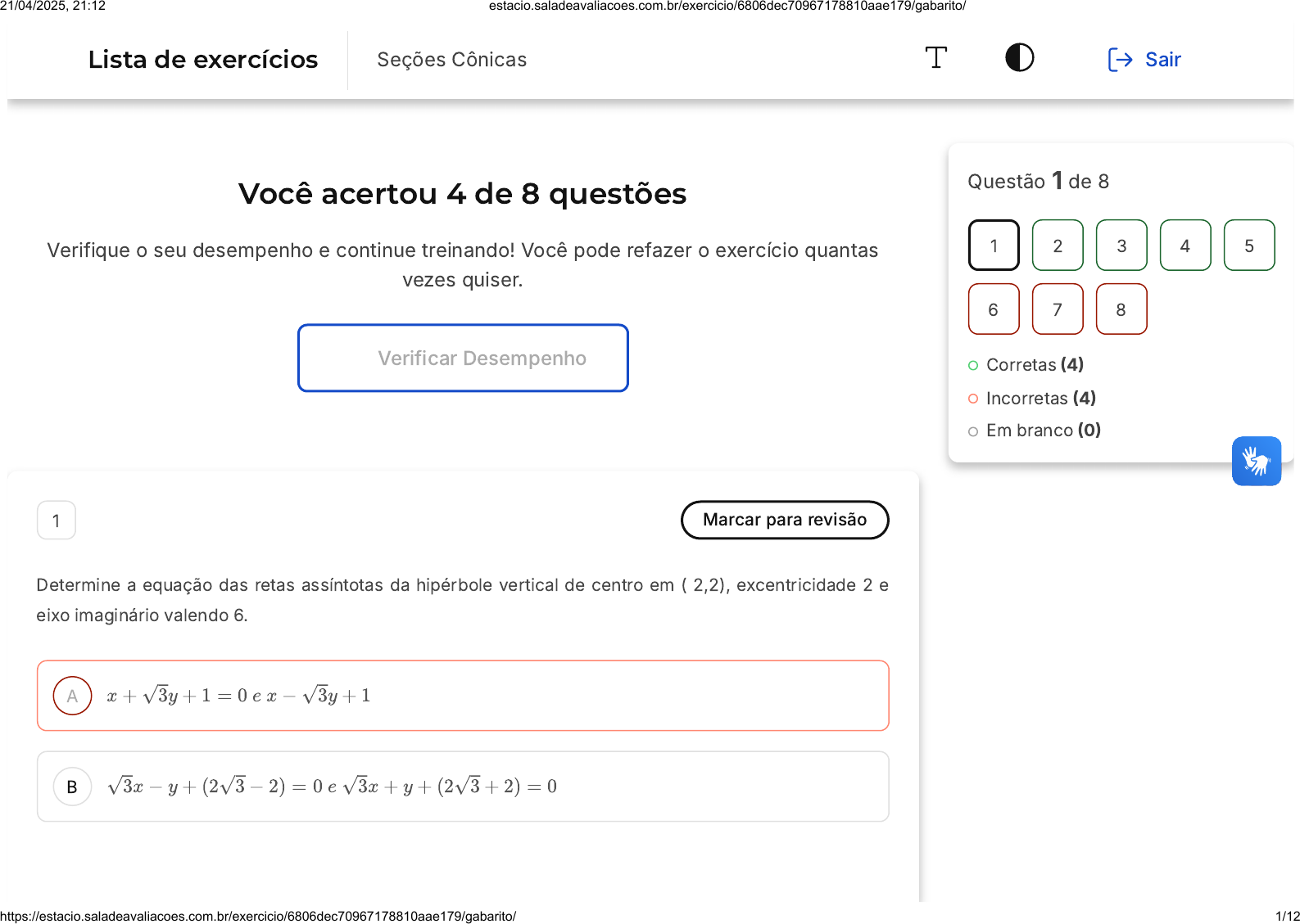 Você acertou 4 de 8 questões Verifique o seu desempenho e continue treinando! Você pode refazer o exercício quantas vezes quiser. Verificar Desempenho A B 1 Marcar para revisão Determine a equação das retas assíntotas da hipérbole vertical de centro em ( 2,2), excentricidade 2 e eixo imaginário valendo 6. x + √3y + 1 = 0 e x − √3y + 1 √3x − y + (2√3 − 2) = 0 e √3x + y + (2√3 + 2) = 0 Questão 1 de 8 Corretas (4) Incorretas (4) Em branco (0) 1 2 3 4 5 6 7 8 Lista de exercícios Seções Cônicas Sair 21/04/2025, 21:12 estacio.saladeavaliacoes.com.br/exercicio/6806dec70967178810aae179/gabarito/ https://estacio.saladeavaliacoes.com.br/exercicio/6806dec70967178810aae179/gabarito/ 1/12 C D E x − √3y + (2√3 − 2) = 0 e x + √3y + (2√3 + 2) = 0 x + √3y + (2√3 − 2) = 0 e x − √3y + (2√3 + 2) = 0 √3x − y + 2√3 = 0 e √3x + √3y + 2√3 = 0 Resposta incorreta Opa! A alternativa correta é a letra C. Confira o gabarito comentado! Gabarito Comentado As retas assíntotas de uma hipérbole são as retas que a hipérbole se aproxima, mas nunca toca. No caso desta hipérbole vertical com centro em (2,2), excentricidade 2 e eixo imaginário valendo 6, as equações das retas assíntotas são dadas por e . Essas equações representam as retas que a hipérbole se aproxima à medida que seus pontos se afastam do centro. x − √3y + (2√3 − 2) = 0 x + √3y + (2√3 + 2) = 0 2 Marcar para revisão Determine o lugar geométrico e a excentricidade da cônica representada pela equação .− = 1 (y−3)2 9 (x+2)2 16 21/04/2025, 21:12 estacio.saladeavaliacoes.com.br/exercicio/6806dec70967178810aae179/gabarito/ https://estacio.saladeavaliacoes.com.br/exercicio/6806dec70967178810aae179/gabarito/ 2/12 A B C D E Hipérbole horizontal com excentricidade 5 3 Hipérbole vertical com excentricidade 5 3 Hipérbole horizontal com excentricidade 5 4 Hipérbole vertical com excentricidade 5 4 Elipse vertical com excentricidade 3 5 Resposta correta Parabéns, você selecionou a alternativa correta. Confira o gabarito comentado! Gabarito Comentado 21/04/2025, 21:12 estacio.saladeavaliacoes.com.br/exercicio/6806dec70967178810aae179/gabarito/ https://estacio.saladeavaliacoes.com.br/exercicio/6806dec70967178810aae179/gabarito/ 3/12 A B C A equação dada é de uma hipérbole, pois a diferença entre os quadrados dos termos é igual a 1. Além disso, o termo y está positivo, indicando que a hipérbole é vertical. A excentricidade é dada pela raiz quadrada da soma dos quadrados dos denominadores dos termos dividida pelo termo positivo. Nesse caso, a excentricidade é . Portanto, a cônica representada pela equação é uma hipérbole vertical com excentricidade . √ = 16+9 9 5 3 5 3 3 Marcar para revisão A geometria é amplamente utilizada na arquitetura e no design de interiores para criar espaços harmoniosos e visualmente agradáveis. Ao projetar uma sala de estar, o arquiteto precisa considerar diferentes formas geométricas, incluindo a hipérbole. Ao analisar a equação reduzida de uma hipérbole, é possível identificar seu tipo com base no sinal negativo presente na equação. Qual das alternativas abaixo descreve corretamente o tipo de hipérbole com base no sinal negativo antes da fração relacionada à variável y? Hipérbole vertical. Hipérbole horizontal. Hipérbole simétrica. 21/04/2025, 21:12 estacio.saladeavaliacoes.com.br/exercicio/6806dec70967178810aae179/gabarito/ https://estacio.saladeavaliacoes.com.br/exercicio/6806dec70967178810aae179/gabarito/ 4/12 D E Hipérbole ascendente. Hipérbole descendente. Resposta correta Parabéns, você selecionou a alternativa correta. Confira o gabarito comentado! Gabarito Comentado Ao analisar a equação reduzida de uma hipérbole, o sinal negativo antes da fração relacionada à variável y indica que se trata de uma hipérbole horizontal. 4 Marcar para revisão A geometria desempenha um papel importante no campo da física, especialmente na descrição de movimentos e trajetórias. Ao analisar a forma de uma hipérbole representada por uma equação do segundo grau, é possível identificar diferentes configurações. Uma forma de classificar a hipérbole é por meio do cálculo do discriminante da equação. Qual das alternativas abaixo descreve corretamente o resultado do discriminante (Δ ) ao transformar a equação do segundo grau em uma equação de 2º grau em x ou em y? 0 21/04/2025, 21:12 estacio.saladeavaliacoes.com.br/exercicio/6806dec70967178810aae179/gabarito/ https://estacio.saladeavaliacoes.com.br/exercicio/6806dec70967178810aae179/gabarito/ 5/12 A B C D E Se Δ for um quadrado perfeito, a equação representará uma hipérbole.0 Se Δ for um quadrado perfeito, a equação representará duas retas concorrentes.0 Se Δ não for um quadrado perfeito, a equação representará uma parábola.0 Se Δ não for um quadrado perfeito, a equação representará duas retas concorrentes. 0 Se Δ não for um quadrado perfeito, a equação representará uma elipse.0 Resposta correta Parabéns, você selecionou a alternativa correta. Confira o gabarito comentado! Gabarito Comentado Ao transformar a equação do segundo grau em uma equação de 2º grau em x ou em y para representar uma hipérbole, é necessário calcular o discriminante (Δ ). Se o Δ for um quadrado perfeito, isso significa que o resultado da equação será um número cuja raiz quadrada é um número inteiro. Nesse caso, a equação representará duas retas concorrentes, que são as degenerações da hipérbole. Por outro lado, se o Δ não for um quadrado perfeito, a equação representará uma hipérbole propriamente dita. 0 0 0 21/04/2025, 21:12 estacio.saladeavaliacoes.com.br/exercicio/6806dec70967178810aae179/gabarito/ https://estacio.saladeavaliacoes.com.br/exercicio/6806dec70967178810aae179/gabarito/ 6/12 A B C D E Portanto, a alternativa correta é que se Δ for um quadrado perfeito, a equação representará duas retas conc