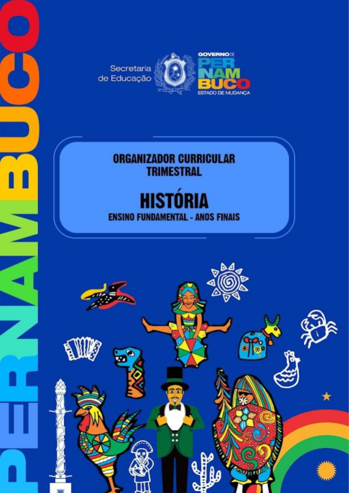 SUMÁRIO 1 INTRODUÇÃO......................................................................................................................8 1.1 A CONSTRUÇÃO DO CURRÍCULO DE PERNAMBUCO............................................8 1.2 CONCEPÇÕES SOBRE O CURRÍCULO................................................................... 11 1.3 PRINCÍPIOS NORTEADORES...................................................................................13 1.4 EDUCAÇÃO ESPECIAL NA PERSPECTIVA DA INCLUSÃO....................................15 1.5 COMPETÊNCIAS E HABILIDADES........................................................................... 16 1.6 COMPETÊNCIAS GERAIS.........................................................................................18 1.7 CONCEPÇÕES SOBRE O PROCESSO DE ENSINO E APRENDIZAGEM..............19 1.8 FORMAÇÃO DE PROFESSORES.............................................................................22 1.9 AVALIAÇÃO DA, PARA E COMO APRENDIZAGEM................................................. 25 1.10 TEMAS TRANSVERSAIS E INTEGRADORES DO CURRÍCULO...........................27 1.11. O DOCUMENTO E SUA ORGANIZAÇÃO...............................................................35 REFERÊNCIAS...................................................................................................................... 37 2. ENSINO FUNDAMENTAL..................................................................................................42 2.1 O ENSINO FUNDAMENTAL E SUAS FASES............................................................ 42 2.2 A TRANSIÇÃO DA EDUCAÇÃO INFANTIL PARA O ENSINO FUNDAMENTAL – ANOS INICIAIS.................................................................................................................43 2.3 A TRANSIÇÃO DO ENSINO FUNDAMENTAL ANOS INICIAIS PARA OS ANOS FINAIS...............................................................................................................................46 REFERÊNCIAS...................................................................................................................... 49 3. ENSINO FUNDAMENTAL - ANOS FINAIS - HISTÓRIA................................................... 50 3.1 HISTÓRIA NO ENSINO FUNDAMENTAL – ANOS FINAIS: UNIDADES TEMÁTICAS, OBJETOS DE CONHECIMENTO E HABILIDADES.........................................................54 3.2 COMPETÊNCIAS ESPECÍFICAS DE HISTÓRIA PARA O ENSINO FUNDAMENTAL.. 57 ORGANIZADOR CURRICULAR POR TRIMESTRE............................................................. 59 6º ANO.............................................................................................................................. 59 7º ANO.............................................................................................................................. 67 8º ANO.............................................................................................................................. 73 9º ANO.............................................................................................................................. 80 REFERÊNCIAS...................................................................................................................... 92 FICHA TÉCNICA.................................................................................................................... 93 APRESENTAÇÃO Olá, Professor(a)! O presente documento tem por objetivo dinamizar o acesso ao conteúdo do Currículo de Pernambuco – Ensino Fundamental (CPE-EF), no sentido de facilitar seu acesso diante das demandas cotidianas e inerentes à prática pedagógica da/ na Educação Básica. Sendo assim, sua elaboração leva em conta a função norteadora desempenhada pelo CPE-EF em sua relação com seu manuseio facilitado em termos de agilidade e de correlação com as realidades constituintes de cada contexto escolar e dos saberes a serem ensinados e aprendidos nas aulas de cada Componente Curricular devidamente situados em suas respectivas Áreas do Conhecimento Escolar. A necessidade de compartimentalizar CPE-EF por componente curricular surge para facilitar a rotina pedagógica do professor no acesso ao CPE-EF de seu componente curricular em sua área específica do conhecimento. No entanto, essa divisão mantém as diretrizes e pressupostos norteadores da construção do CPE-EF em correlação às especificidades do Ensino Fundamental, bem como a caracterização e a delimitação específica e particularizada de cada Área do Conhecimento Escolar em razão dos Componentes Curriculares que as constituem, sem que se perca o caráter de unicidade inerente ao documento original. Dessa forma, ficam mantidos todos os princípios norteadores do CPE-EF: equidade e excelência, formação integral, educação em direitos humanos e inclusão, garantindo um processo de ensino e aprendizagem democrático, voltado para a construção de uma educação de qualidade, comprometida com a justiça e a inclusão, mantendo o diálogo como importante ato na busca do conhecimento de todos que constroem o processo educativo no seu cotidiano (FREIRE, 1987). O respeito e uso desses princípios norteadores em sala de aula colaboram para a construção de uma educação que incentiva o protagonismo estudantil como mecanismo para a formação de cidadãos conscientes de seus direitos e deveres para a construção de uma sociedade mais justa e humanitária. 4 Sob o viés e a intencionalidade pedagógicos citados acima, no redimensionamento dos componentes curriculares dos quais trata cada volume constituinte desta proposta, é possível verificar de forma mais prática e detida as características, potencialidades e possibilidades de apropriação e de materialização autônoma das propostas trazidas pelo CPE-EF para o cotidiano das aulas dos Componentes Curriculares que constituem cada Área do Conhecimento Escolar; facilitando, assim, tanto a dinâmica interna de cada um de