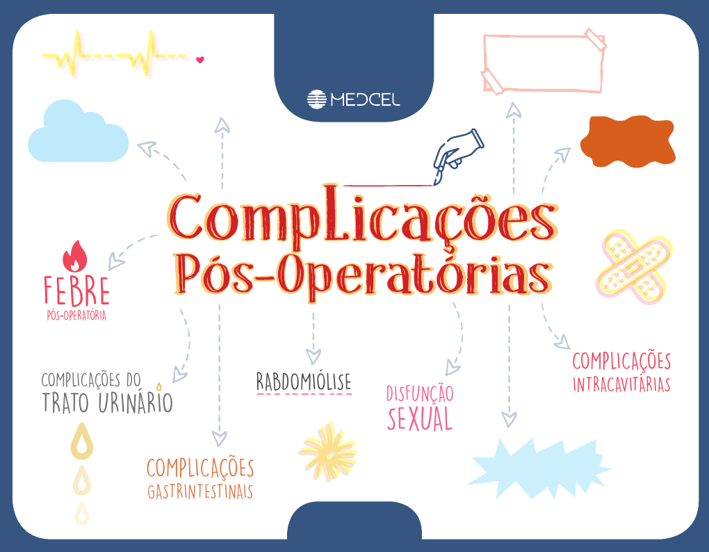CLÍNICA CIRÚRGICA MAPA MENTAL COMPLICAÇÕES RESPIRATÓRIAS COMPLICAÇÕES DA FERIDA OPERATÓRIACOMPLICAÇÕES CARDÍACAS DEISCÊNCIAS ANASTOMÓTICAS DISFUNÇÃO SEXUAL COMPLICAÇÕES DO SISTEMA NERVOSO CENTRAL COMPLICAÇÕES INTRACAVITÁRIAS COMPLICAÇÕES GASTRINTESTINAIS FEBRE PÓS-OPERATÓRIA COMPLICAÇÕES DO TRATO URINÁRIO RABDOMIÓLISE CLÍNICA CIRÚRGICA Febre Pós-Operatória 24 horas: Atelectasia pulmonar 72 horas: Infecção urinária Após o 7o dia: Coleção intracavitária, fístula 48 horas: Flebite Até o 5o dia: Infecção da ferida operatória e de cateteres vasculares causas Processos infecciosos Pro ces sos nã o- in fec cio sos CLÍNICA CIRÚRGICA COMPLICAÇÕES CARDÍACAS Maioria aparece durante cirurgia ou 3 primeiros dias do pós-operatório 0,4% desenvolvem infarto agudo do miocárdio Arritmias período pós-operatório - avaliar se decorrem de: Alcalose Estresse durante cirurgia emergenciais Hipopotassemia Hipoxemia Toxicidade digitálica Manifestações ClÍnicas: Dores torácicas Hipotensão Arritmias cardíacas Comuns nos procedimentos intratorácicos CLÍNICA CIRÚRGICA COMPLICAÇÕES RESPIRATÓRIAS COMPLICAÇÕES RESPIRATÓRIAS Síndrome da angústia respiratória do adulto • Liberados mediadores bioquímicos da inflamação, que lesam o endotélio com extravasamento de plasma para dentro do alvéolos, após trauma ou sepse • Edema pulmonar restante impede ven- tilação e oxigenação • Pressão arterial de oxigênio declina • Concentração de dióxido de carbono aumenta. Aspiração de conteúdos da boca e do estômago • Comum em sedados • Taxa de 50% de morte • Tratamento com manutenção de via aérea livre que previne novos riscos • Antibióticos só em casos de aspiração de grande volume ou repercussão clínica desfavorável Atelectasia • Mais comum • Afeta 25% em cirurgias abdominais • Mais frequente nas primeiras 48 horas • Responsável por mais de 90% dos casos febris Pneumonia • Maior determinador de morte • Uso profilático de antibióticos não diminui incidência de colonização Gram negativa de orofaringe • Tempo de intubação = ocorrência das pneumonias associadas à ventilação Embolia pulmonar • Tamanho do coágulo = gravidade clínica • Tomografia computadorizada = multislice = rapidez diagnóstica, baixa morbidade, sensibilidade de 86% e especificidade de 92% Edema pulmonar • Acumulo de líquidos nos alvéolos • Redução de troca gasosa de- sencadeando a hipoxemia • Causas: iatrogênicas, disfunção miocárdica primária e hiperten- são arterial não controlada CLÍNICA CIRÚRGICA COMPLICAÇÕES DO TRATO URINÁRIO COMPLICAÇÕES DO TRATO URINÁRIO bactérias entéricas Gram negativa Local da infecção bexiga (cistite) pielite e pielonefrite ascende trato urinário superior Germes Amostra da urinaAmostra da urina bactérias leucócitosbactérias leucócitos disúria calafrios aumento da frequência da micção e dor sintomas área da infecção operações pélvicas sondagem vesical de demora operações perineais procedimentos anestesia espiral permanência individualizada Inabilidade de micção espontânea CLÍNICA CIRÚRGICA COMPLICAÇÕES GASTRINTESTINAIS COMPLICAÇÕES GASTRINTESTINAIS ÚlcerasPancreatite risco aumentado prolaxia com inibidor de bomba de prótons • insuciência respiratória • coagulopatia • infecção grave • uremia • hemorragia digestiva 10 pancreatite aguda 1 a 3 submetidos à manipulação peripancreática cirurgia das vias biliares Íleo paralítico ou adinâmico maior frequência uso medicação opioides níveis anormais eletrólitos condições inflamatórias dor maior frequência uso medicação opioides níveis anormais eletrólitos condições inflamatórias dor pancreatitepancreatite peritoniteperitonite Diarreia por Clostridium dicile tratamento • metronidazol • patógeno resistente causa comum de infecção nosocomial Diarreia por Clostridium dicile vancomicina oral Insuficiência hepáticaInsuficiência hepática • icterícia pós-operatória • necrose de células hepáticas • ressecção massiva de tecido hepático • inamação lesão perenquimatosa drogas sepse hipertensão hipóxia Obstrução mecânica pós-operatório imediato resultante de aderências resultante formação de hérnias internas mais tardia menos frequente CLÍNICA CIRÚRGICA DISFUNÇÃO SEXUAL DISFUNÇÃO SEXUAL retossigmoidectomias ejaculação retrógrada lesão do plexo hipogástrico prostatectomia aberta cirurgia cardíaca reconstrução aórtica disfunção erétil disfunção erétilcirurgias pélvicas risco de lesão dos ramos sacrais do plexo discutir riscos com paciente acesso robótico laparoscopia menores indícios CLÍNICA CIRÚRGICA COMPLICAÇÕES DO SISTEMA NERVOSO CENTRAL acidente vascular cerebral maior complicação idosos severa aterosclerose hipotensão durante cirurgia pós-cirurgia hipotermia prolongada suspeita quadro de déficit neurológico focal + 24 horas infecção grave baixo débito cardíaco Delirium principal em idosos disfunção cognitiva condições sedação período de internação pós-operatória flutuação do nível de orientação temporoespacial perda de memória conversação incoerente infecções ativas distúrbios hidroeletrolíticos doses baixas de haloperidol sem efeitos cardiovasculares Delirium CLÍNICA CIRÚRGICA RABDOMIÓLISE reação a agentes anestésicos compressão muscular RABDOMIÓLISE diurese forçada hiper-hidratação alcalinização da urina infusão de bicarbonato furosemida matinol estímulo diurético elevação de creatinofosfoquinase elevação de creatinofosfoquinase deposita-se nos glomérulos insuficiência renal diurese em menor volume coloração acastanhada grumos proteção renal proteção renal CLÍNICA CIRÚRGICA COMPLICAÇÕES DA FERIDA OPERATÓRIA COMPLICAÇÕES DA FERIDA OPERATÓRIA Seroma Acúmulo de liquefação da gordura e da linfa Presença aumenta o risco de infecção da