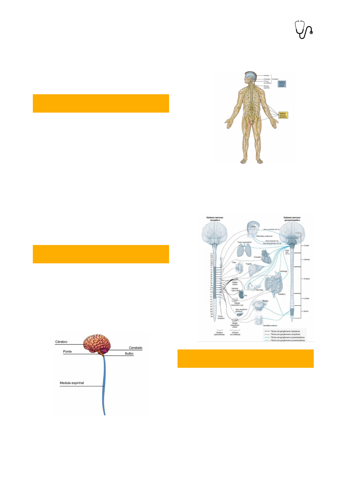 MEDICINA - UNIPE Controle Nervoso e Movimento Embriologia Desenvolvimento do Sistema Nervoso - N a p r i m e i r a s e m a n a o c o r r e a fecundação e, consequentemente, a formação do zigoto, que sofrerá mitoses sucessivas e originará a mórula; - Na segunda semana, a mórula (já no útero) sofre cavitação pelo influxo de líquido, se despoja da zona pelúcida e se torna um disco bilaminar (ectoderma e endoderma); - Na terceira semana, ocorre a formação da linha primitiva no teto da ectoderme, levando a uma migração de célu las ectodérmicas para a posição entre a ectoderme e a endoderme, originando as células mectomesenquimatosas responsáveis por formar a mesoderme e a notocorda; O sistema nervoso consiste em três regiões principais: 1. Sistema nervoso central (SNC) - formado pelo encéfalo (Cérebro, tronco encefálico e cerebelo) e pela medula espinal, protegido pelo crânio e coluna vertebral; 2. Sistema nervoso periférico (SNP) - neurônios fora do SNC, nervos cranianos e espinais e seus gânglios associados, conectando o SNC às es t ru turas periféricas; 3. Sistema nervoso autônomo (SNA) - possui partes no SNC e no SNP, formado pelos neurônios que inervam o músculo liso, M. c a r d í a c o , e p i t é l i o g l a n d u l a r e a combinação desses tecidos O sistema nervoso começa a ser formado no início da terceira semana, já que a placa neural e o sulco neural se desenvolvem no aspecto posterior do embrião trilaminar. A notocorda e o mesênquima paraxial vão induzir, através de sinalização parácrina sobre as células adjacentes da ectoderme, um espessamento formando a placa neural, que se estende cranialmente em relação ao nó primitivo. Na placa neural, as células 1 Revisão Geral - Embriologia Divisão do Sistema Nervoso Desenvolvimento do Sistema Nervoso MEDICINA - UNIPE Controle Nervoso e Movimento começam a se proliferar e dar origem a crista neural e ao sulco neural (invaginação), que formarão o tubo neural e as cristas neurais. O tubo neural é quem vai se diferenciar e formar o SNC e a crista neural é quem vai dar origem a maior parte das células do SNP e SNA; Esse processo de formação da placa neural e do tubo neural. Tem início durante a terceira semana na região do quarto ao sexto pares de somitos. Nesse estágio, os 2/3 craniais da placa e do tubo neural até o quarto par de somitos representam o futuro encéfalo e o terço caudal da placa e do tubo representa a futura medula espinhal; A fusão das pregas neurais e a formação do tubo neural começam no quinto somito e prossegue nas direções cranial e caudal, permanecendo abertas, as extremidades caudal e cranial; O lúmen do tubo neural se torna o canal neural que se comunica livremente com a cavidade amniótica; O neuroporo rostral (abertura cranial) se fecha aproximadamente no 25º dia, enquanto o neuroporo caudal se fecha no 27º dia. O fechamento dos neuropóros coincide com o estabelecimento da circulação vascular para o tubo neural. Se desenvolve a partir do 4 par de vômitos e vai até a eminência caudal. As paredes laterais do tubo neural, constituídas por células neuroepiteliais, se espessam ao longo de toda a parede e formam um epitélio pseudoestratificado espesso. Esse espessamento nas paredes laterais reduz o tamanho do canal neural, até que só exista, entre a 9ª e 10ª semanas, o canal central da medula espinhal. As células neuroepiteliais constituem a zona ventricular, voltada para o canal medular, que dá origem aos neuroblastos e aos g l i o b a s t o s . A l é m d i s s o , a s c é l u l a s neuroepiteliais diferenciam-se em células ependimárias, que formam o epêndima. 2 Neurulação Desenvolvimento da Medula Espinal MEDICINA - UNIPE Controle Nervoso e Movimento As placas Alar e basal produzem protuberancias longitudinais que se estendem através da maior parte do comprimento da medula espinal em desenvolvimento. Placas alares - os corpos celulares dessa placa formam os cornos cinzentos dorsais da medula espinhal, caracterizado por n e u r ô n i o s c o m n ú c l e o s a f e r e n t e s (sensitivos). Conforme vai aumentando, formam-se os septos medianos dorsais. Placas basais - os corpos celulares dessa placa formam os cornos ventrais e laterais da medula espinhal. Axônios das células dos cornos ventrais crescem para fora da medula espinhal e formam as raízes ventrais dos nervos espinhais. Os neurônios dos gânglios espinais (gânglios da raiz dorsal/sensitivos) são derivados da crista neural. Se desenvolvem das células da crista neural e do mesênquima paraxial entre o 20º e 35º dias. As células migram para circundar o tubo neural e formam as meninges primordiais. A camada externa dessas membranas se espessa para formar a dura-máter. A camada interna é composta pela pia-máter e aracnoide- máter (leptomeninges). Começa a se desenvolver durante a terceira semana, quando a placa e o tubo n e u r a l e s t ã o s e d e s e n v o l v e n d o d o neuroectoderma. A parte cranial ao quarto par de somitos do tubo neural se desenvolve no encéfalo. As células neuroprogenitoras proliferam, migram e se diferenciam para formar áreas específicas do encéfalo. A fusão das pregas neurais na região cranial e o fechamento do neuroporo rostral formam três vesículas encefá l icas pr imár ias , das qua is se desenvolve o encéfalo: -Prosencéfalo (encéfalo anterior); -Mesencéfalo (encéfalo médio); -Rombencéfalo (encéfalo posterior); Diferenciação do mesencéfalo Vesícula primária Derivados no adulto Mesencéfalo Teto Tegmento Aqueduto encefálico 3 Desenvolvimento dos gânglios espinais Desenvolvimento das meninges espinais Desenvolvimento do Cérebro MEDICINA - UNIPE Controle Nervoso e Movimento Relação entre estrutura e função do mesencéfalo: conduzir informações (lesões - perda do controle voluntário). O mesencéfalo diferencia-se no teto e no tegmento. O espaço preenchido de LCS ( l iqu ido cerebrospin