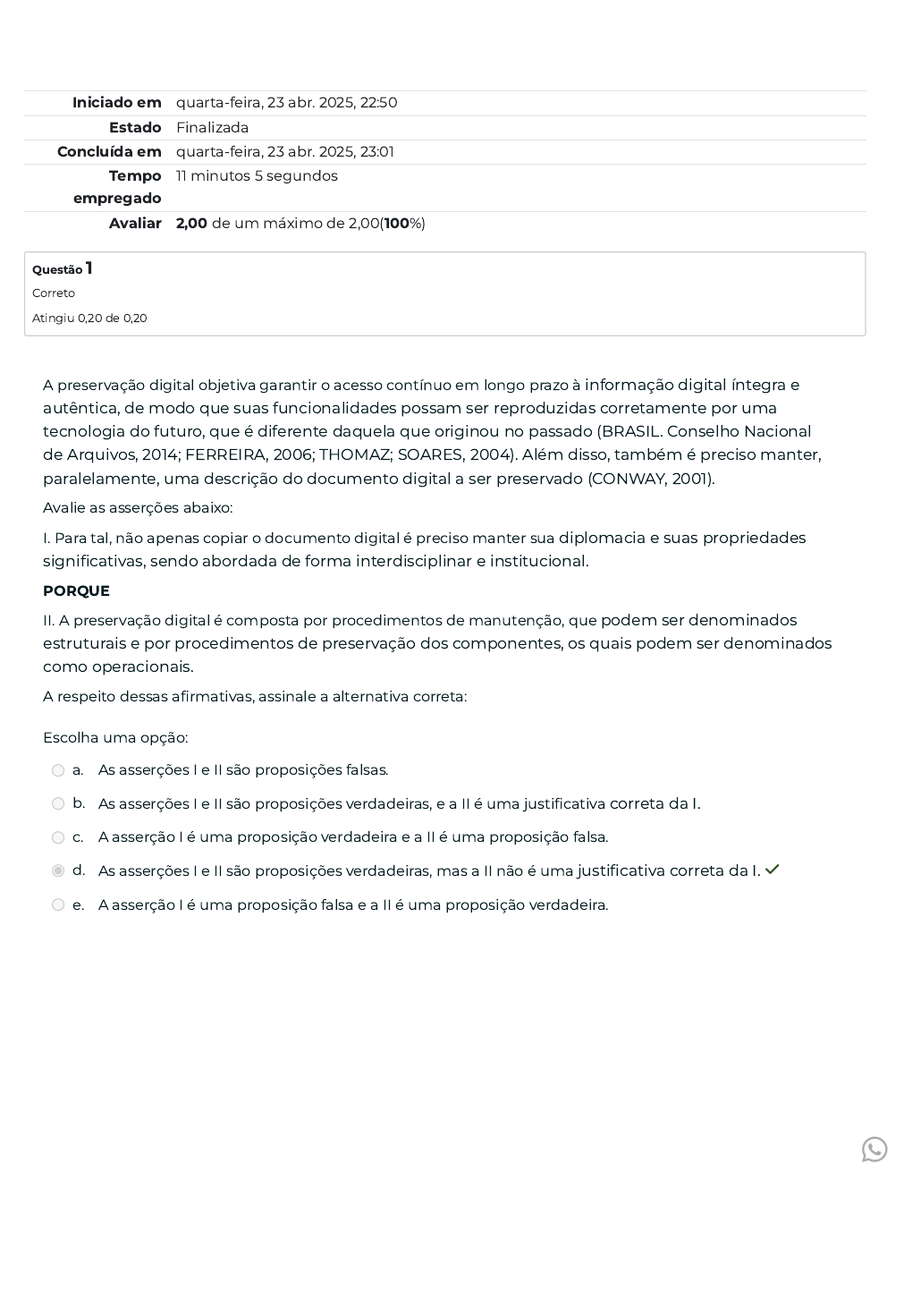 Iniciado em quarta-feira, 23 abr. 2025, 22:50 Estado Finalizada Concluída em quarta-feira, 23 abr. 2025, 23:01 Tempo empregado 11 minutos 5 segundos Avaliar 2,00 de um máximo de 2,00(100%) Questão 1 Correto Atingiu 0,20 de 0,20 A preservação digital objetiva garantir o acesso contínuo em longo prazo à informação digital íntegra e autêntica, de modo que suas funcionalidades possam ser reproduzidas corretamente por uma tecnologia do futuro, que é diferente daquela que originou no passado (BRASIL. Conselho Nacional de Arquivos, 2014; FERREIRA, 2006; THOMAZ; SOARES, 2004). Além disso, também é preciso manter, paralelamente, uma descrição do documento digital a ser preservado (CONWAY, 2001). Avalie as asserções abaixo: I. Para tal, não apenas copiar o documento digital é preciso manter sua diplomacia e suas propriedades significativas, sendo abordada de forma interdisciplinar e institucional. PORQUE II. A preservação digital é composta por procedimentos de manutenção, que podem ser denominados estruturais e por procedimentos de preservação dos componentes, os quais podem ser denominados como operacionais. A respeito dessas afirmativas, assinale a alternativa correta: Escolha uma opção: a. As asserções I e II são proposições falsas. b. As asserções I e II são proposições verdadeiras, e a II é uma justificativa correta da I. c. A asserção I é uma proposição verdadeira e a II é uma proposição falsa. d. As asserções I e II são proposições verdadeiras, mas a II não é uma justificativa correta da I. ✓ e. A asserção I é uma proposição falsa e a II é uma proposição verdadeira. https://api.whatsapp.com/send?phone=554491540086&text=Ol%C3%A1,%20como%20podemos%20te%20ajudar%20hoje? Questão 2 Correto Atingiu 0,20 de 0,20 Questão 3 Correto Atingiu 0,20 de 0,20 São dados que descrevem outros dados, formando uma estrutura abstrata denominada esquema ou conjunto de metadados. Esta estrutura é criada para fins específicos sendo necessária para identificar, representar, interoperar e gerir o funcionamento e a utilização dos conteúdos de um sistema de informação (DE SORDI, 2008; SAYÃO, 2010b). Fazendo referência ao texto mencionado, assinale corretamente. Escolha uma opção: a. Instrumentos de análise diplomática b. documentos arquivísticos c. documentos digitais d. componentes e. Metadados ✓ O documento e o respectivo suporte físico são perfeitamente separáveis, desta forma, a informação que era fixada em suporte convencional passa a ser armazenada em suporte eletrônico, deixando de ter uma relação indissociável. Assim, a facilidade de copiar documentos registrados em diferentes suportes físicos, acrescenta maior flexibilidade aos documentos digitais (BODÊ, 2007). Assim, partindo dessa informação, assinale corretamente. Escolha uma opção: a. Os bits que compõem o documento não precisam ser logicamente ordenados por meio de uma linguagem, para serem registrados fisicamente em um suporte eletrônico, o qual é um objeto material. b. A ruptura menos notável entre as características de representação dos documentos digitais e convencionais, paralelamente, dissemina a ideia de documento digital como um elemento não virtual, imaterial. c. Embora seja fruto de uma primorosa evolução das tecnologias de informação, o documento ao ser representado em digital, não deve ser abordado como um elemento “virtuoso” que ocupa pouco espaço. d. A ruptura mais notável entre as características de representação dos documentos digitais e convencionais, paralelamente, dissemina a ideia de documento digital como um elemento virtual, imaterial. ✓ e. É possível ler os documentos digitais de maneira direta, o que faz do computador um importante intermediário para interpretar e representar estes registros. https://api.whatsapp.com/send?phone=554491540086&text=Ol%C3%A1,%20como%20podemos%20te%20ajudar%20hoje? Questão 4 Correto Atingiu 0,20 de 0,20 Questão 5 Correto Atingiu 0,20 de 0,20 Os metadados de preservação tornam-se componentes-chave para grande parte das estratégias de preservação digital, pois tem a função de documentar todas as ações proferidas sobre os documentos (SARAMAGO, 2004; THOMAZ, 2004; THOMAZ; SANTOS, 2003). Avalie as asserções abaixo: I. Podem identificar os documentos de forma única, tanto interna, quanto externamente, em relação ao acervo ao qual pertencem. PORQUE II. Atuam fornecendo informação de apoio à preservação em longo prazo, criando assim, um histórico das transformações ocorridas. A respeito dessas afirmativas, assinale a alternativa correta: Escolha uma opção: a. A asserção I é uma proposição falsa e a II é uma proposição verdadeira. b. As asserções I e II são proposições verdadeiras, mas a II não é uma justificativa correta da I. c. As asserções I e II são proposições falsas. d. A asserção I é uma proposição verdadeira e a II é uma proposição falsa. e. As asserções I e II são proposições verdadeiras, e a II é uma justificativa correta da I. ✓ Observa-se que a demanda por documentos criados em meio digital e as incertezas quanto a sua preservação estão ameaçando a capacidade de se continuar utilizando os arquivos como fontes confiáveis (THOMAZ, 2005). A respeito dessa informação, avalie as afirmativas. I. A metodologia utilizada consiste no levantamento bibliográfico documental, composto por materiais previamente publicados, dentre eles, livros, teses, dissertações, textos em sites da Internet e artigos em periódicos científicos indexados no Google Scholar. PORQUE II. O ritmo acelerado da evolução tecnológica criou um grande paradoxo: há uma grande facilidade para criar documentos digitais, entretanto, os métodos de preservação ainda são escassos e a maioria ainda não teve sua eficácia comprovada em longo prazo. Da mesma forma, a fragilidade implícita vem ameaçando a garantia de integridade e autenticid