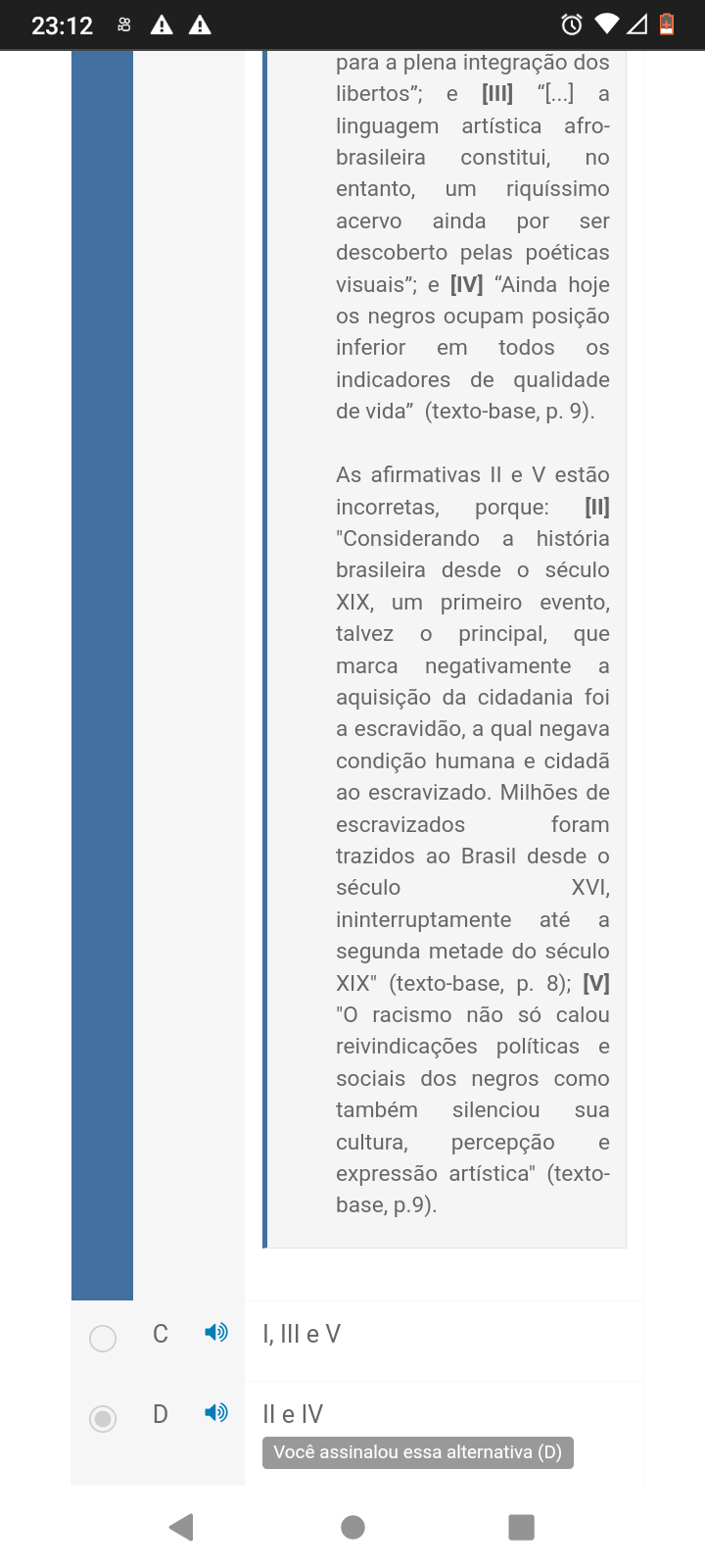 23:12 A A para a plena integração dos libertos"; e [III] "[...] a linguagem artística afro- brasileira constitui, no entanto, um acervo ainda por ser descoberto pelas poéticas visuais"; e [IV] "Ainda hoje os negros ocupam posição inferior em todos os indicadores de qualidade de vida" (texto-base, p. 9). As afirmativas e V estão incorretas, porque: "Considerando a história brasileira desde o século XIX, um primeiro evento, talvez o principal, que marca negativamente a aquisição da cidadania foi a escravidão, a qual negava condição humana e cidadã ao escravizado. Milhões de escravizados foram trazidos ao Brasil desde o século XVI, ininterruptamente até a segunda metade do século XIX" (texto-base, p. 8); [V] "O racismo não só calou reivindicações políticas e sociais dos negros como também silenciou sua cultura, percepção e expressão artística" (texto- base, p.9). C I, III e V D e IV Você assinalou essa alternativa (D)
