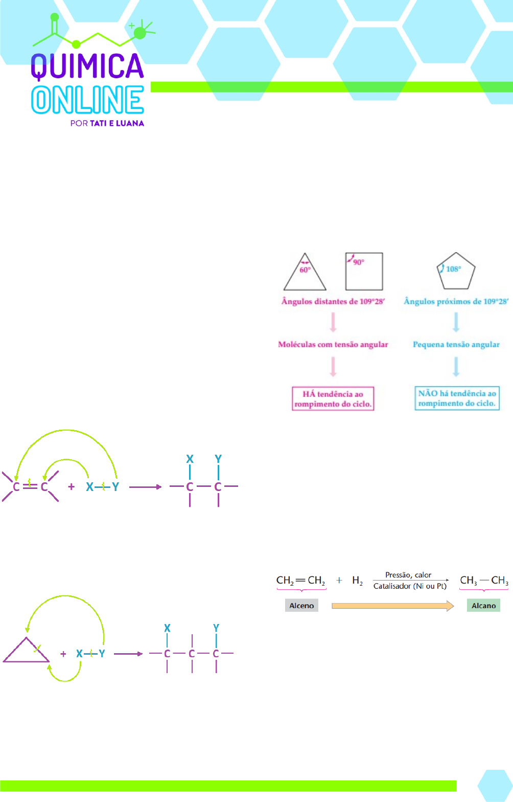 MÓDULO 29 REAÇÕES ORGÂNICAS Tipos de reações orgânicas As reações orgânicas podem ser classificadas de várias maneiras. Alguns dos tipos mais comuns são: adição, substituição, oxidação e eliminação. Reações de Adição As reações de adição são características de compostos insaturados: alquenos, alquinos e dienos, principalmente, e ocorrem com a quebra da ligação pi (π). A ligação pi (feita através de orbitais paralelos) é bem mais fraca que a ligação sigma (frontal) e, em determinadas condições, pode ser deslocada para um dos carbonos tornando o negativo e propício ao ataque de um reagente eletrófilo. Consequentemente, o carbono que ficou longe da ligação pi torna se positivo e propício ao ataque de um reagente nucleófilo. O resultado é que os carbonos, que antes estabeleciam a ligação pi entre si, passam a estabelecer as ligações sigma com outros átomos ou grupos de átomos. Observação: Os ciclanos de três e quatro carbonos apresentam tendência para sofrer reações de adição, nas quais ocorre o rompimento do ciclo. Ocorre a quebra de uma ligação sigma (σ) entre carbonos do anel, originando compostos de cadeia aberta. Isso acontece devido às tensões de Baeyer. Todos os átomos de carbono de moléculas saturadas têm hibridização sp 3. Logo, os ângulos esperados entre seus ligantes são de 109 o28’. Se esses ângulos forem alterados, surgirá uma tensão na molécula (tensão angular ou tensão de Baeyer), pois o sistema sempre tende a retornar ao ângulo mais estável. Verificando os ângulos destacados nos ciclanos esquematizados abaixo, notamos que há considerável tensão angular no ciclopropano e no ciclobutano. Isso explica por que esses ciclos de três e quatro carbonos possuem tendência para se romper, pois, dessa maneira, a tensão angular é eliminada e a molécula se estabiliza. Hidrogenação Catalítica (Adição de Hidrogênio) É a reação de um composto insaturado (um alceno, por exemplo) com gás hidrogênio (H2), na presença de platina (Pt), paládio (Pd) ou níquel (Ni) metálicos, finamente pulverizados. Esses metais tornam a reação mais rápida (agem como catalisadores) e, portanto, viável economicamente. Esta reação produz compostos saturados. No caso de compostos insaturados por mais de uma ligação pi (π), a hidrogenação pode ser parcial ou total, dependendo da quantidade de matéria de H 2 adicionado para cada 1 mol do composto. Assim, considerando essa quantidade de composto insaturado, para cada ligação pi (π) rompida na estrutura, adicionase 1 mol de H 2. 1 MÓDULO 29 REAÇÕES ORGÂNICAS Lembrando que a adição de hidrogênio também pode ocorrer com o ciclopropano e o ciclobutano, mesmo sendo compostos saturados. A hidrogenação catalítica é também conhecida como reação de SabatierSenderens e constitui um meio de obter alcanos a partir de alcenos. O catalisador aumenta a rapidez de uma reação. Dessa forma, uma reação que seja muito lenta para ter aplicação prática em uma indústria ou laboratório passa a ser possível com o uso do catalisador adequado. Um catalisador propicia à reação um novo mecanismo alternativo. Esse novo mecanismo apresenta uma energia de ativação menor. Na hidrogenação, os metais níquel, platina ou paládio conseguem catalisar a reação em virtude de uma importante propriedade que possuem: a capacidade de adsorver o H2 e o composto insaturado. Adsorver significa aderir à superfície. Assim, tanto as moléculas de gás hidrogênio como do composto insaturado ficam aderidas à superfície do metal (isto é, são adsorvidas por ele), o que provoca o enfraquecimento das ligações, tornando mais fácil a reação. Observação: As reações de hidrogenação são denominadas reações de redução, pois o Nox do carbono envolvido na reação diminui: As insaturações C=C presentes nos óleos, que são líquidos, podem sofrer hidrogenação catalítica, transformando os grupos CH=CH em CH 2CH2 e originando, portanto, gorduras saturadas, que são sólidas. Esse processo é empregado para transformar os óleos de milho, soja, girassol e outros em materiais pastosos, utilizados no preparo de margarinas. Um exemplo de equação da hidrogenação catalítica das insaturações de um triacilglicerol é: As margarinas contêm, além de óleos vegetais hidrogenados, outros componentes, como leite, vitamina A, aromatizantes e corantes. Anteriormente, era comum hidrogenar todas as insaturações presentes na cadeia carbônica. Essa prática foi modificada. Há evidências médicas de que os triacilgliceróis saturados, quando ingeridos em grande quantidade, podem provocar acúmulo de lipídios nas artérias, diminuindo o fluxo sanguíneo e conduzindo a problemas circulatórios e cardíacos. As margarinas são fabricadas atualmente, em sua maioria, a partir de óleos poliinsaturados, com hidrogenação de apenas parte das insaturações. Isso minimiza a presença de triacilgliceróis saturados e, acreditase, oferece menos riscos à saúde. Halogenação (Adição de Halogênios) Os halogênios, principalmente Cl 2 e Br 2, reagem com compostos insaturados em reações de adição. O produto obtido é um dihaleto no qual os átomos de halogênio estão posicionados em carbonos vizinhos, chamado de dihaleto vicinal. 2 Regra de Markovnikov: Na adição de um haleto de hidrogênio a um composto insaturado, o hidrogênio do haleto liga se ao carbono mais hidrogenado (que possui mais ligações com hidrogênio) da dupla ou tripla. MÓDULO 29 REAÇÕES ORGÂNICAS O teste mais comum para verificar se uma cadeia alifática é insaturada, à temperatura ambiente, é o Teste de Bromo e consiste na reação com uma solução de bromo em tetracloreto de carbono (Br 2/CCl4). Essa solução apresenta uma coloração castanha/alaranjada devido à presença de bromo. Se a cadeia for insaturada, a coloração castanha desaparecerá. A reação de adição do Br 2 