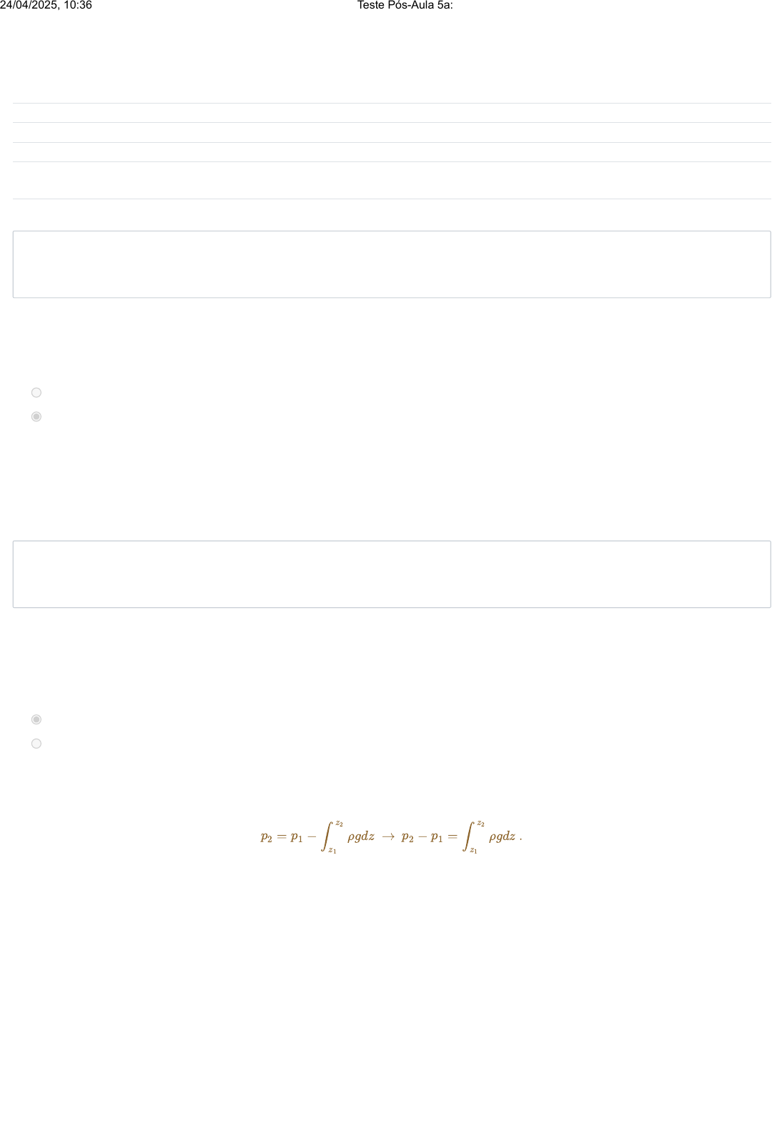 Iniciado em quinta-feira, 24 abr. 2025, 10:35 Estado Finalizada Concluída em quinta-feira, 24 abr. 2025, 10:44 Tempo empregado 8 minutos 48 segundos Avaliar 0,70 de um máximo de 0,70(100%) Questão 1 Correto Atingiu 0,10 de 0,10 Questão 2 Correto Atingiu 0,10 de 0,10 A condição hidrostática é caracterizada pelo regime laminar. Escolha uma opção: Verdadeiro Falso Fluidos em regime laminar possuem velocidade. Portanto, não estão em condição hidrostática. A resposta correta é 'Falso'. Quando o fluido está em condição hidrostática, a variação da pressão é calculada apenas em função da gravidade, da massa específica e da variação da cota. Escolha uma opção: Verdadeiro Falso Em regime hidrostático, a pressão é calculada por Portanto, a variação de pressão ao longo do fluido depende da massa específica ρ, da gravidade g e da variação da cota z. A resposta correta é 'Verdadeiro'. = − ρgdz → − = ρgdz .p2 p1 ∫ z2 z1 p2 p1 ∫ z2 z1 24/04/2025, 10:36 Teste Pós-Aula 5a: Revisão da tentativa 177.153.50.3/moodle/mod/quiz/review.php?attempt=54958&cmid=3576 1/4 Questão 3 Correto Atingiu 0,20 de 0,20 Universidade Federal Fluminense (UFF) - Engenharia Mecanica - COSEAC (2015) O Princípio de Pascal é uma grande contribuição prática nas aplicações em mecânica dos fluidos. No seu enunciado verifica-se que, quando: Escolha uma opção: a. um ponto de um líquido em equilíbrio sofre uma variação de pressão, todos os outros pontos sofrem uma variação proporcional ao seu inverso b. um ponto de um líquido em equilíbrio sofre uma variação de pressão, apenas os pontos da vizinhança sofrem a mesma variação c. um ponto de um líquido em equilíbrio sofre uma variação de pressão, todos os outros pontos sofrem a mesma variação d. um ponto de um líquido em equilíbrio sofre uma variação de pressão, todos os outros pontos não sofrem variação e. dois pontos equidistantes de um líquido em equilíbrio sofrem uma variação de pressão, outros dois pontos sofrerão a mesma variação Sua resposta está correta. O cálculo da pressão em condição hidrostática é dado por que para um fluido incompressível, será Caso a pressão no ponto 1 seja aumentada para , teremos a nova condição Subtraindo-se as duas últimas equações, ou seja, o aumento da pressão num determinado ponto será igual ao aumento em todos os pontos do mesmo fluido. Essa conclusão é chamada de Princípio de Pascal. A resposta correta é: um ponto de um líquido em equilíbrio sofre uma variação de pressão, todos os outros pontos sofrem a mesma variação = − ρgdz ,p2 p1 ∫ z2 z1 = − ρg ( − ) = − ρg(−h) → = + ρgh .p2 p1 z2 z1 p1 p2 p1 p′ 1 = + ρgh .p′ 2 p′ 1 Δ = Δ ,p2 p1 24/04/2025, 10:36 Teste Pós-Aula 5a: Revisão da tentativa 177.153.50.3/moodle/mod/quiz/review.php?attempt=54958&cmid=3576 2/4 Questão 4 Correto Atingiu 0,15 de 0,15 Polícia Civil do Rio de Janeiro (PC-RJ) - Perito Criminal - IBFC (2013) Uma prensa hidráulica é constituída de dois êmbolos sendo que o diâmetro do êmbolo maior é 59% superior ao diâmetro do outro êmbolo. Admitindo que o óleo hidráulico utilizado para a transmissão de força é incompressível e que uma força F foi aplicada no êmbolo de menor diâmetro, surgirá, como consequência, uma força F no êmbolo de maior diâmetro. A razão F /F vale: a. 0,31 b. 6,36 c. 0,40 d. 1,59 e. 2,53 1 2 2 1 Sua resposta está correta. Conforme o eunuciado, o êmbolo correspondente à força é o de maior diâmetro, então: De acordo com o Princípio de Pascal: Substituindo-se : Considerando-se que as forças iniciais eram iguais ou desprezíveis: A razão entre áreas é igual ao quadrado da razão entre diâmetros: Substituindo (i) na equação anterior: A resposta correta é: 2,53 F2 = (1 + ) = 1, 59 ⋅D2 59 100 D1 D1 → = 1, 59 (i) D2 D1 Δ = Δp1 p2 p = F/A = ΔF1 A1 ΔF2 A2 → = ΔF2 ΔF1 A2 A1 → = F2 F1 A2 A1 → = F2 F1 ( ) D2 D1 2 = = 2, 5281 F2 F1 (1, 59)2 24/04/2025, 10:36 Teste Pós-Aula 5a: Revisão da tentativa 177.153.50.3/moodle/mod/quiz/review.php?attempt=54958&cmid=3576 3/4 Questão 5 Correto Atingiu 0,15 de 0,15 Petróleo Brasileiro S.A (Petrobras) - Engenheiro(a) de Equipamentos Júnior - CESGRANRIO (2014) Para um determinado fluido com peso específico de 10514 N/m , uma diferença de pressão de 2041 Pa corresponde a uma altura de carga de a. 0,39 m b. 0,19 m c. 2041,00 m d. 10,30 m e. 5,15 m 3 Sua resposta está correta. De acordo com o Teorema de Stevin: ou, para pressão manométrica, Explicitando-se h: A resposta correta é: 0,19 m p = + ρghpatm = ρgh = γhpm h = = = 0, 19 m pm γ 2041 10514 24/04/2025, 10:36 Teste Pós-Aula 5a: Revisão da tentativa 177.153.50.3/moodle/mod/quiz/review.php?attempt=54958&cmid=3576 4/4