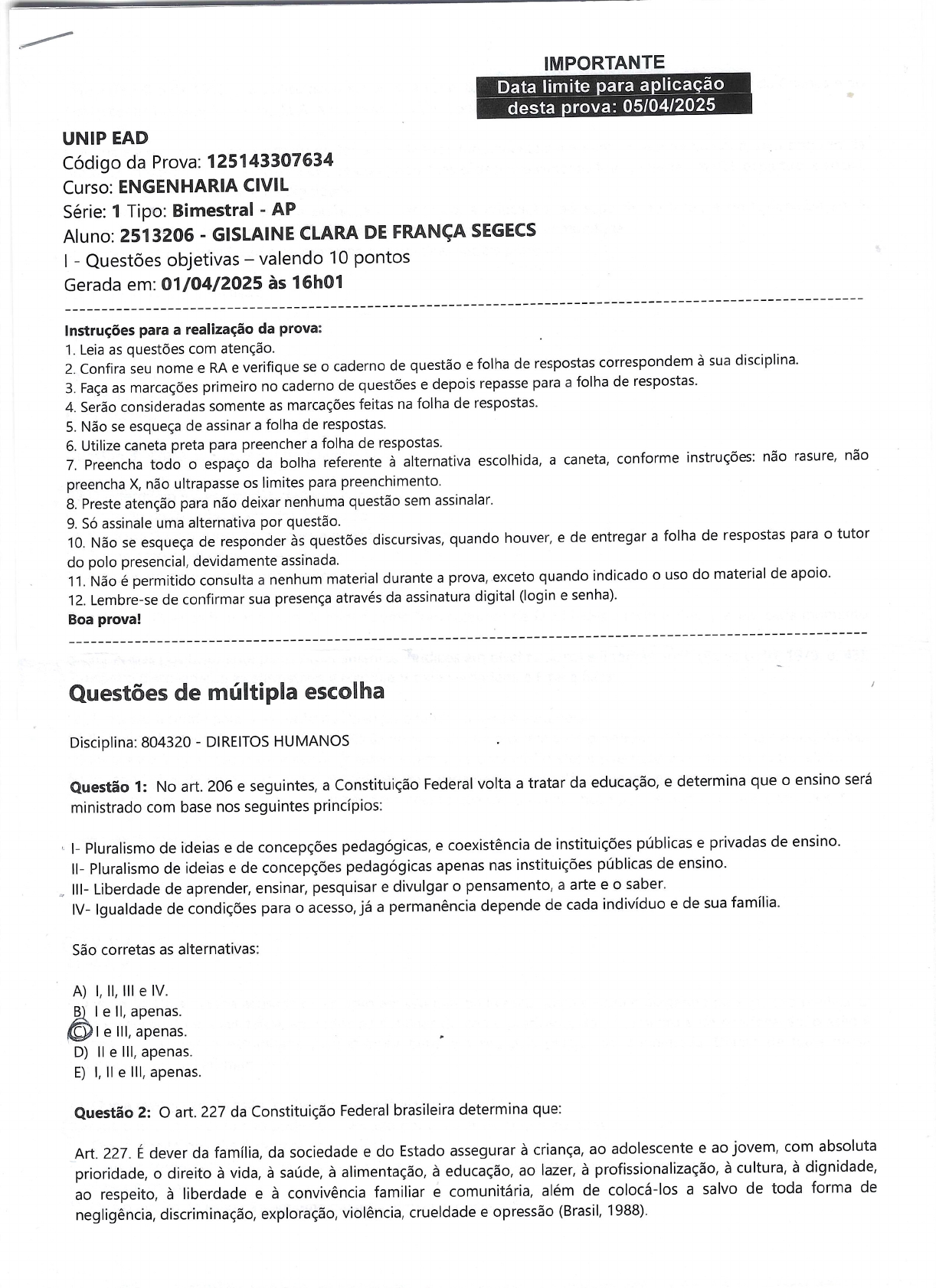 IMPORTANTE Data limite para aplicação desta prova: 05/04/2025 UNIP EAD Código da Prova: 125143307634 Curso: ENGENHARIA CIVIL Série: 1 Tipo: Bimestral AP Aluno: 2513206 GISLAINE CLARA DE FRANÇA SEGECS I - Questões objetivas valendo 10 pontos Gerada em: 01/04/2025 às 16h01 Instruções para a realização da prova: 1. Leia as questões com atenção. 2. Confira seu nome e RA e verifique se o caderno de questão e folha de respostas correspondem à sua disciplina. 3. Faça as marcações primeiro no caderno de questões e depois repasse para a folha de respostas. 4. Serão consideradas somente as marcações feitas na folha de respostas. 5. Não se esqueça de assinar a folha de respostas. 6. Utilize caneta preta para preencher a folha de respostas. 7. Preencha todo o espaço da bolha referente à alternativa escolhida, a caneta, conforme instruções: não rasure, não preencha X, não ultrapasse os limites para preenchimento. 8. Preste atenção para não deixar nenhuma questão sem assinalar. 9. Só assinale uma alternativa por questão. 10. Não se esqueça de responder às questões discursivas, quando houver, e de entregar a folha de respostas para o tutor do polo presencial, devidamente assinada. 11. Não é permitido consulta a nenhum material durante a prova, exceto quando indicado o uso do material de apoio. 12. Lembre-se de confirmar sua presença através da assinatura digital (login e senha). Boa prova! Questões de múltipla escolha Disciplina: 804320 DIREITOS HUMANOS Questão 1: No art. 206 e seguintes, a Constituição Federal volta a tratar da educação, e determina que o ensino será ministrado com base nos seguintes princípios: Pluralismo de ideias e de concepções pedagógicas, e coexistência de instituições públicas e privadas de ensino. II- Pluralismo de ideias e de concepções pedagógicas apenas nas instituições públicas de ensino. III- Liberdade de aprender, ensinar, pesquisar e divulgar o pensamento, a arte e o saber IV- Igualdade de condições para o acesso, já a permanência depende de cada indivíduo e de sua família. São corretas as alternativas: A) I, II, III e IV. B) e II, apenas. e III, apenas. D) e III, apenas. E) I, e III, apenas. Questão 2: O art. 227 da Constituição Federal brasileira determina que: Art. 227. É dever da família, da sociedade e do Estado assegurar à criança, ao adolescente e ao jovem, com absoluta prioridade, o direito à vida, à saúde, à alimentação, à educação, ao lazer, à profissionalização, à cultura, à dignidade, ao respeito, à liberdade e à convivência familiar e comunitária, além de colocá-los a salvo de toda forma de negligência, discriminação, exploração, violência, crueldade e opressão (Brasil, 1988)Em 13 de julho de 1990, o Brasil colocou em vigor a Lei n. 8.069, que ficou conhecida como Estatuto da Criança e do Adolescente, ou, simplesmente, ECA. A respeito do ECA, podemos afirmar que: A criança e o adolescente gozam de todos os direitos fundamentais inerentes à pessoa humana, sem prejuízo da proteção integral de que trata esta Lei, assegurando-lhes o desenvolvimento físico, mental, moral, espiritual e social, em condições de liberdade e de dignidade. II- Os direitos referentes à vida, à saúde, à alimentação, à educação, ao esporte, ao lazer, à profissionalização, à cultura, à dignidade, ao respeito, à liberdade e à convivência familiar e comunitária. III- Preferência na formulação e na execução das políticas sociais públicas. Estão corretas as alternativas: A) I, e III. B) e II, apenas. I e III, apenas. D) e III, apenas. E) III, apenas. Questão 3: Entre os crimes contra a humanidade estão incluídos: A extermínio e a escravidão de seres humanos. B) Violação de tratados e acordos internacionais. C) Participação em conspiração para a guerra. D) Tratamento cruel de E) Assassinato de reféns ou prisioneiros. histórico, Questão 4: Direitos humanos são definidos como "um conjunto de faculdades e instituições que, em cada reconhecidas concretizam as exigências da dignidade, da liberdade e da igualdade humanas as quais devem momento A positivamente pelos ordenamentos jurídicos em nível nacional e internacional" (Pérez Luño, 1979, p. 43). ser respeito disso, analise as afirmativas e coloque V para verdadeira e para falsa: (V) I- acesso à saúde para prevenção de doenças para a cura delas. (F) () III- II- acesso acesso à à educação básica que permita às pessoas desenvolverem suas potencialidades intelectuais e cognitivas. (V) IV- condições de empregabilidade que permitam a cada pessoa um salário que lhe e ao vida educação superior para desenvolverem suas potencialidades intelectuais mundo do trabalho. (F) V- de conviver com outras pessoas preferencialmente que são próximas nos tipos de garanta pensamentos digna. e atitudes. A sequência correta é: A) V, V, V, V, V. B) V, F, V, V, F. C) F, V, F, V, V. D V, V, F, F. E) V, F, V, F, F. Questão asilo é 5: Uma pessoa acusada de estupro em seu país pede asilo no país vizinho alegando perseguição revogado concedido e, mais tarde, apurados os detalhes do crime praticado, do julgamento e da condenação, política. asilo é natureza é possível afirmar: e a pessoa extraditada para cumprir pena em seu país porque foi condenada. Diante de fatos o dessa A) Que a revogação do asilo foi ilegal porque já estava garantido. B Que o direito de asilo não pode ser invocado por autores de crimes comuns. C) Que o direito de asilo é sempre qualquer D) Não se motivo. contempla direito de asilo em países vizinhos para não incentivar a mudança de um país para outro por E) Que o direito de asilo não era uma garantia efetiva naquele país.Questão 6: No Brasil, direito à saúde é garantido: A) Somente aos que podem pagar planos de saúde suplementar. B) Somente aos trabalhadores que recolhem valor da Previdência Social. C) Somente aos trabalhadores que possuem cartei