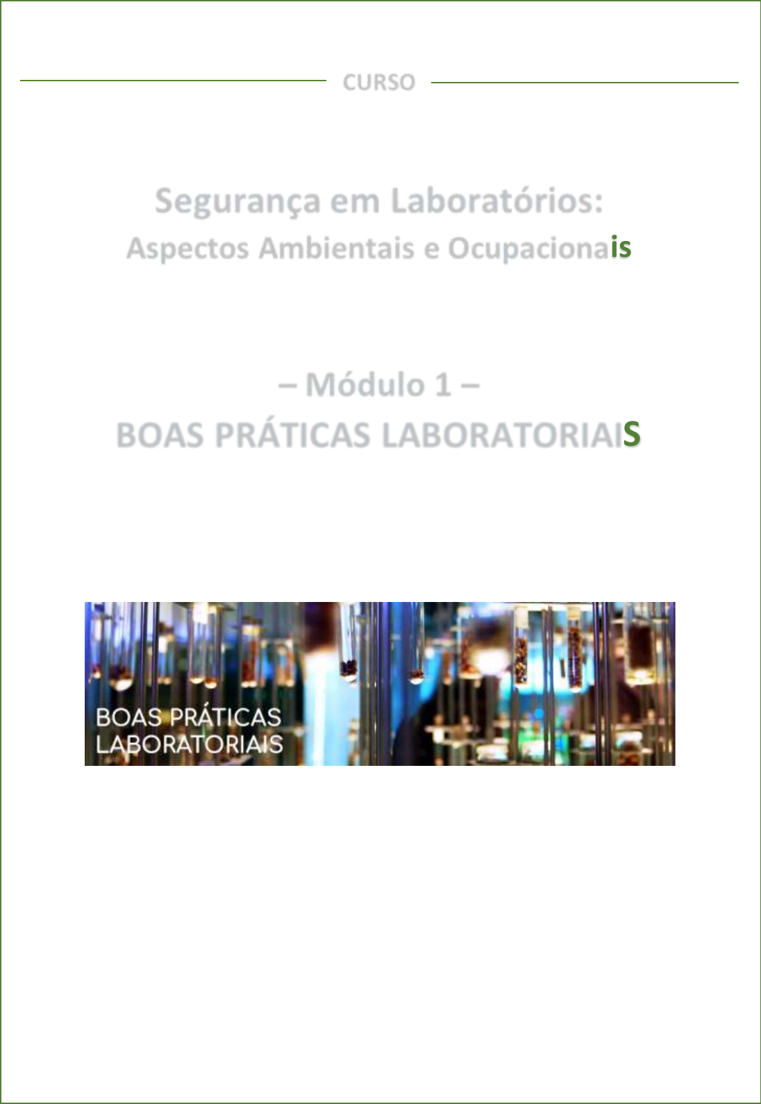 CURSO Segurança em Laboratórios: Aspectos Ambientais e Ocupacionais – Módulo 1 – BOAS PRÁTICAS LABORATORIAIS CURSO Segurança em Laboratórios: Aspectos Ambientais e Ocupacionais – Módulo 1 – BOAS PRÁTICAS LABORATORIAIS Universidade Federal de São Paulo Departamento de Gestão e Segurança Ambiental São Paulo, maio de 2024. SUMÁRIO GLOSSÁRIO ....................................................................................................................... 5 Referências bibliográficas ............................................................................................ 7 SEGURANÇA DO TRABALHO ............................................................................................ 8 Conceito........................................................................................................................ 8 Pilares ........................................................................................................................... 8 Universidades ............................................................................................................... 8 Cenário.......................................................................................................................... 8 Laboratórios ................................................................................................................. 9 Responsáveis ................................................................................................................ 9 Acesso à informação e ao conhecimento.................................................................... 9 Tipos de risco.............................................................................................................. 10 Riscos químicos ...................................................................................................... 10 Vias de introdução de agentes químicos no organismo ....................................... 11 Não conformidade no ambiente de trabalho e consequências ............................... 12 Ocorrência de acidentes e incidentes ....................................................................... 12 Perigo x Risco ............................................................................................................. 13 Mapa (ou matriz) de riscos ........................................................................................ 14 Referências bibliográficas .......................................................................................... 15 PRINCÍPIOS DAS BOAS PRÁTICAS LABORATORIAIS ...................................................... 18 Introdução .................................................................................................................. 18 5S – SENSOS................................................................................................................ 18 Princípios ................................................................................................................ 18 Aplicação ................................................................................................................ 19 Condutas..................................................................................................................... 20 Lavagem das mãos ..................................................................................................... 21 Operações com vidraria e outros utensílios ............................................................. 22 Limpeza e uso: preocupação com a coletividade ..................................................... 22 Rotulagem dos produtos químicos............................................................................ 23 Limpeza de superfícies e utensílios ........................................................................... 23 Diluição de ácidos ...................................................................................................... 23 Conservação e organização dos produtos químicos ................................................. 24 Características técnicas a serem consideradas num almoxarifado.......................... 24 Referências bibliográficas .......................................................................................... 24 EQUIPAMENTOS DE PROTEÇÃO COLETIVA E INDIVIDUAL ........................................... 26 Avental........................................................................................................................ 27 Óculos de segurança .................................................................................................. 27 Luvas ........................................................................................................................... 27 Proteção respiratória ................................................................................................. 28 Referências bibliográficas .......................................................................................... 29 PRINCÍPIO DE INCÊNDIO: PREVENÇÃO E COMBATE ..................................................... 31 Fogo ............................................................................................................................ 31 Incêndio ...................................................................................................................... 31 Tetraedro do fogo ...................................................................................................... 32 Pontos de fulgor, combustão e ignição ..................................................................... 33 Transmissão de calor.................................................................................................. 33 Classes de incêndio .................................................................................................... 34 Métodos de extinção do fogo...................................................................