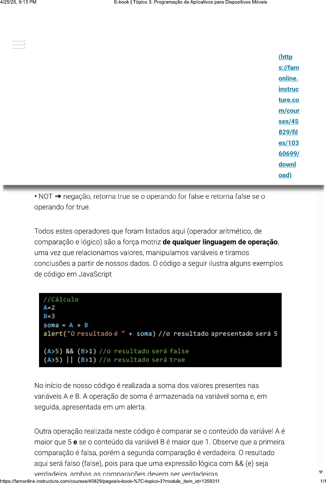 4/25/25, 9:13 PM E-book Tópico 3: Programação de Aplicativos para Dispositivos Móveis (http s://fam online. instruc ture.co m/cour ses/45 829/fil es/103 60699/ downl load) NOT negação, retorna true se O operando for false e retorna false se O operando for true. Todos estes operadores que foram listados aqui (operador aritmético, de comparação e lógico) são a força motriz de qualquer linguagem de operação, uma vez que relacionamos valores, manipulamos variáveis e tiramos conclusões a partir de nossos dados. O código a seguir ilustra alguns exemplos de código em JavaScript //Cálculo A=2 B=3 alert ("O resultado é soma) //o resultado apresentado será 5 (A>5) && (B>1) //o resultado será false (A>5) II (B>1) //o resultado será true No início de nosso código é realizada a soma dos valores presentes nas variáveis A e B. A operação de soma é armazenada na variável soma e, em seguida, apresentada em um alerta. Outra operação realizada neste código é comparar se O conteúdo da variável A é maior que 5 e se conteúdo da variável B é maior que 1. Observe que a primeira comparação é falsa, porém a segunda comparação é verdadeira. O resultado aqui será falso (false), pois para que uma expressão lógica com && (e) seja verdadeira ambas as comparações devem ser verdadeiras 1/1