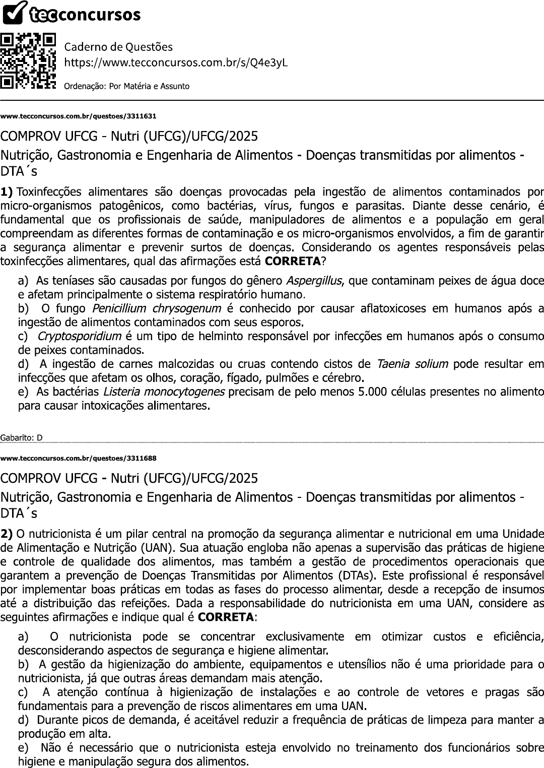 tecconcursos Caderno de Questões https://www.tecconcursos.com.br/s/Q4e3yL Ordenação: Por Matéria e Assunto www.tecconcursos.com.br/questoes/3311631 COMPROV UFCG Nutri (UFCG)/UFCG/2025 Nutrição, Gastronomia e Engenharia de Alimentos Doenças transmitidas por alimentos DTA's 1) Toxinfecções alimentares são doenças provocadas pela ingestão de alimentos contaminados por micro-organismos patogênicos, como bactérias, vírus, fungos e parasitas. Diante desse cenário, é fundamental que os profissionais de saúde, manipuladores de alimentos e a população em geral compreendam as diferentes formas de contaminação e os micro-organismos envolvidos, a fim de garantir a segurança alimentar e prevenir surtos de doenças. Considerando os agentes responsáveis pelas toxinfecções alimentares, qual das afirmações está CORRETA? a) As teníases são causadas por fungos do gênero Aspergillus, que contaminam peixes de água doce e afetam principalmente o sistema respiratório humano. b) O fungo Penicillium chrysogenum é conhecido por causar aflatoxicoses em humanos após a ingestão de alimentos contaminados com seus esporos. c) Cryptosporidium é um tipo de helminto responsável por infecções em humanos após o consumo de peixes contaminados. d) A ingestão de carnes malcozidas ou cruas contendo cistos de Taenia solium pode resultar em infecções que afetam os olhos, coração, fígado, pulmões e cérebro. e) As bactérias Listeria monocytogenes precisam de pelo menos 5.000 células presentes no alimento para causar intoxicações alimentares. Gabarito: D www.tecconcursos.com.br/questoes/3311688 COMPROV UFCG Nutri (UFCG)/UFCG/2025 Nutrição, Gastronomia e Engenharia de Alimentos Doenças transmitidas por alimentos DTA's 2) nutricionista é um pilar central na promoção da segurança alimentar e nutricional em uma Unidade de Alimentação e Nutrição (UAN). Sua atuação engloba não apenas a supervisão das práticas de higiene e controle de qualidade dos alimentos, mas também a gestão de procedimentos operacionais que garantem a prevenção de Doenças Transmitidas por Alimentos (DTAs). Este profissional é responsável por implementar boas práticas em todas as fases do processo alimentar, desde a recepção de insumos até a distribuição das refeições. Dada a responsabilidade do nutricionista em uma UAN, considere as seguintes afirmações e indique qual é CORRETA: a) nutricionista pode se concentrar exclusivamente em otimizar custos e eficiência, desconsiderando aspectos de segurança e higiene alimentar. b) A gestão da higienização do ambiente, equipamentos e utensílios não é uma prioridade para o nutricionista, já que outras áreas demandam mais atenção. c) A atenção contínua à higienização de instalações e ao controle de vetores e pragas são fundamentais para a prevenção de riscos alimentares em uma UAN. d) Durante picos de demanda, é aceitável reduzir a frequência de práticas de limpeza para manter a produção em alta. e) Não é necessário que o nutricionista esteja envolvido no treinamento dos funcionários sobre higiene e manipulação segura dos alimentos.Gabarito: A QUADRIX Nutr F Jr (CRN 8)/CRN 8/2024 Nutrição, Gastronomia e Engenharia de Alimentos Doenças transmitidas por alimentos DTA's 3) As doenças transmitidas por alimentos (DTA) são consequências da ingestão de perigos biológicos, químicos e físicos. Nesse caso, existem fatores intrínsecos e extrínsecos, que se relacionam, não atuando isoladamente. Com base nessas informações, assinale a alternativa correta, acerca dos fatores apresentados. a) Atmosfera (gases) é um fator intrínseco. b) Umidade relativa é um fator intrínseco. c) Luz é um fator extrínseco. d) Potencial de oxirredução é um fator extrínseco. e) Atividade da água é um fator extrínseco. Gabarito: www.tecconcursos.com.br/questoes/2809784 CEBRASPE (CESPE) Nutr (Pref Camaçari)/Pref Camaçari/2024 Nutrição, Gastronomia e Engenharia de Alimentos Doenças transmitidas por alimentos DTA's 4) Em relação às enfermidades transmitidas por alimentos (ETA), assinale a opção correta. a) Existem vários mecanismos patogênicos envolvidos com a determinação dessas enfermidades, estando elas, em geral, agrupadas em duas categorias: intoxicações e intoxicações não bacterianas. b) Entre os agentes etiológicos que produzem toxinas in vivo estão o Staphylococcus aureus e o Bacillus cereus. c) A Salmonella é um dos agentes etiológicos mais comuns de ETA, e sua ação se dá por toxina pré- formada. d) Staphylococcus aureus e Bacillus cereus possuem um período de incubação de 1 h a 8 h e os sintomas que aparecem primeiro ou predominam são dor abdominal e diarreia. e) Uma das ações prioritárias para prevenção, controle e redução dos riscos e surtos de ETA é o investimento público para melhoria da infraestrutura dos serviços de saneamento básico, e outras opções de prevenção incluem práticas de higiene pessoal e coletiva e manejo adequado de alimentos para consumo, tais como lavagem das mãos com água limpa e sabão; desinfecção das hortaliças antes do consumo; cozimento dos alimentos em temperatura adequada; e armazenamento correto dos alimentos. Gabarito: E CEBRASPE (CESPE) CEduc (Pref Camaçari)/Pref Camaçari/2024 Nutrição, Gastronomia e Engenharia de Alimentos Doenças transmitidas por alimentos DTA's 5) As enfermidades transmitidas por alimentos são comuns, entretanto, uma delas, causada por bactéria patogênica anaeróbia, é considerada rara no Brasil. Essa enfermidade é transmitida pelo consumo de alimentos mal conservados com a presença de toxinas produzidas pela bactéria. Após a contaminação, são observados sintomas gastrointestinais e, na evolução da doença, podem ser observados sinais clínicos neurológicos como visão turva, tontura, dificuldade para respirar e paralisia muscular.A doença de que trata o texto precedente é causada pela 