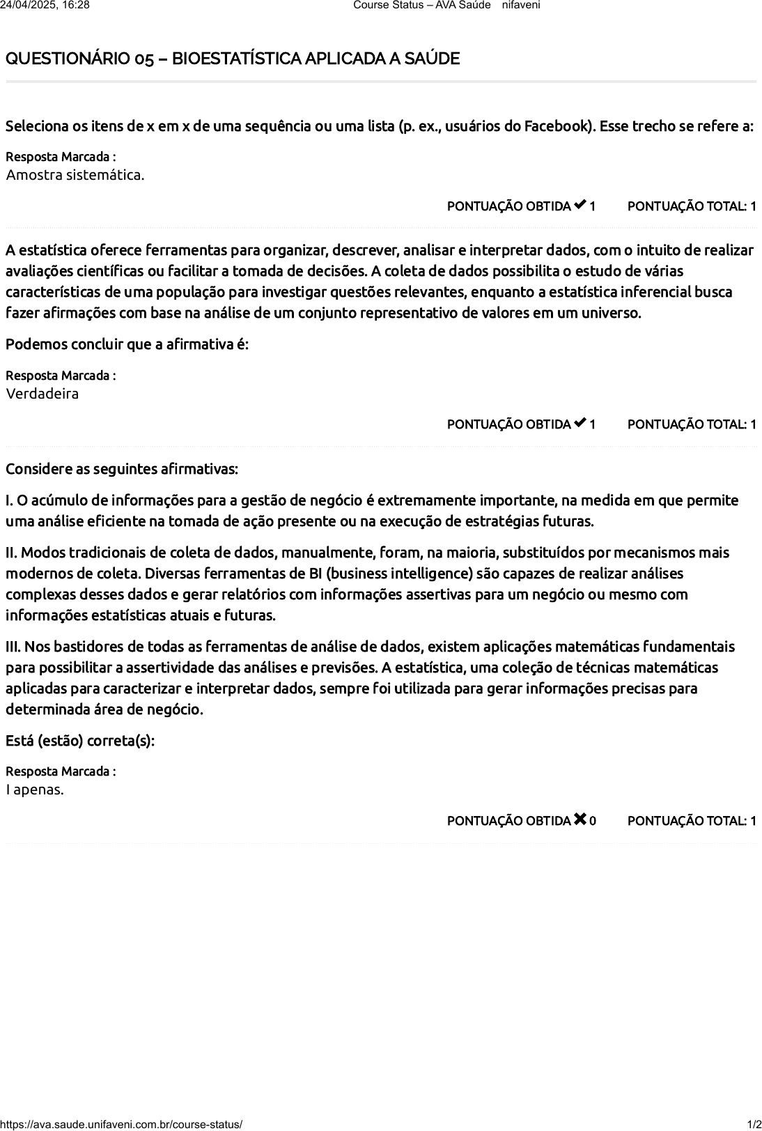 QUESTIONÁRIO 05 – BIOESTATÍSTICA APLICADA A SAÚDE PONTUAÇÃO TOTAL: 1PONTUAÇÃO OBTIDA 1 Seleciona os itens de x em x de uma sequência ou uma lista (p. ex., usuários do Facebook). Esse trecho se refere a: Resposta Marcada : Amostra sistemática. PONTUAÇÃO TOTAL: 1PONTUAÇÃO OBTIDA 1 A estatística oferece ferramentas para organizar, descrever, analisar e interpretar dados, com o intuito de realizar avaliações científicas ou facilitar a tomada de decisões. A coleta de dados possibilita o estudo de várias características de uma população para investigar questões relevantes, enquanto a estatística inferencial busca fazer afirmações com base na análise de um conjunto representativo de valores em um universo. Podemos concluir que a afirmativa é: Resposta Marcada : Verdadeira PONTUAÇÃO TOTAL: 1PONTUAÇÃO OBTIDA 0 Considere as seguintes afirmativas: I. O acúmulo de informações para a gestão de negócio é extremamente importante, na medida em que permite uma análise eficiente na tomada de ação presente ou na execução de estratégias futuras. II. Modos tradicionais de coleta de dados, manualmente, foram, na maioria, substituídos por mecanismos mais modernos de coleta. Diversas ferramentas de BI (business intelligence) são capazes de realizar análises complexas desses dados e gerar relatórios com informações assertivas para um negócio ou mesmo com informações estatísticas atuais e futuras. III. Nos bastidores de todas as ferramentas de análise de dados, existem aplicações matemáticas fundamentais para possibilitar a assertividade das análises e previsões. A estatística, uma coleção de técnicas matemáticas aplicadas para caracterizar e interpretar dados, sempre foi utilizada para gerar informações precisas para determinada área de negócio. Está (estão) correta(s): Resposta Marcada : I apenas. 24/04/2025, 16:28 Course Status – AVA Saúde Unifaveni https://ava.saude.unifaveni.com.br/course-status/ 1/2 4 / 5 PONTUAÇÃO TOTAL: 1PONTUAÇÃO OBTIDA 1 Muitas vezes, uma análise estatística enfrenta dificuldades na execução probabilística em um cenário em que existe um número elevado de elementos pertencentes a um grupo. Nesse tipo de situação, o processo de análise estatística dificilmente atinge todos os elementos do universo de estudo. Em relação ao estudo estatístico, assinale a alternativa que representa o conceito de amostragem: Resposta Marcada : Realizar uma amostragem é verificar o comportamento de uma população por meio da análise de parte de um evento observado. PONTUAÇÃO TOTAL: 1PONTUAÇÃO OBTIDA 1 Em estudos estatísticos inferenciais, em que se pretende realizar inferências sobre características presentes em uma população, existem duas classificações possíveis para uma amostragem. Dessa forma, elas podem ser classificadas em probabilísticas ou não probabilísticas. Analise se as afirmações sobre os tipos de amostragem são verdadeiras (V) ou falsas (F): ( ) A amostra estratificada, classificada como não probabilística, seleciona áreas geográficas aleatórias na representação de uma população. ( ) Na amostra aleatória simples, classificada como probabilística, todos os itens de uma população têm as mesmas chances de serem escolhidos para compor uma amostra. ( ) Em amostras sistemáticas, os elementos escolhidos, com base na população de estudo, obedecem a critérios aleatórios e normalmente são utilizados em populações que podem ser listadas. ( ) As amostragens probabilísticas podem envolver elementos que são escolhidos por procedimentos aleatórios. Resposta Marcada : F – V – F – V. Total de Pontos 24/04/2025, 16:28 Course Status – AVA Saúde Unifaveni https://ava.saude.unifaveni.com.br/course-status/ 2/2