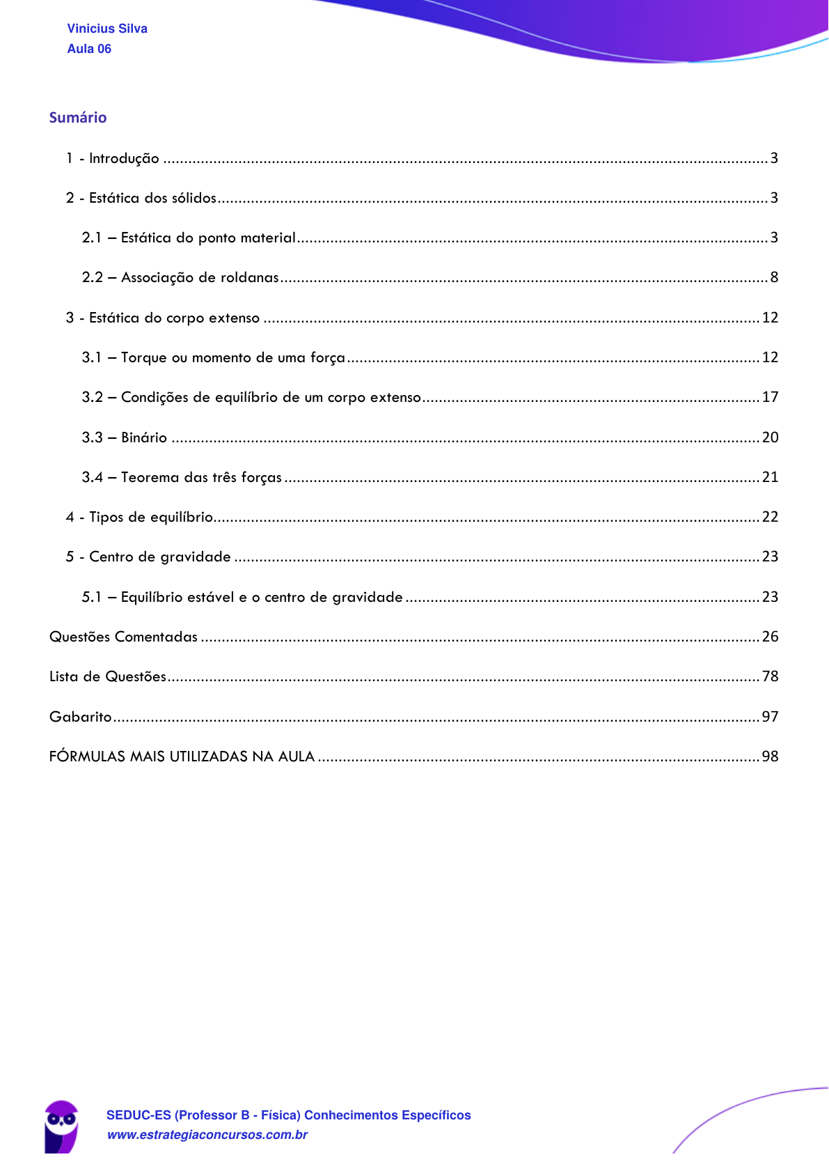 1 Sumário 1 - Introdução ................................................................................................................................................. 3 2 - Estática dos sólidos .................................................................................................................................... 3 2.1 – Estática do ponto material ................................................................................................................. 3 2.2 – Associação de roldanas ..................................................................................................................... 8 3 - Estática do corpo extenso ....................................................................................................................... 12 3.1 – Torque ou momento de uma força ................................................................................................... 12 3.2 – Condições de equilíbrio de um corpo extenso ................................................................................. 17 3.3 – Binário ............................................................................................................................................. 20 3.4 – Teorema das três forças .................................................................................................................. 21 4 - Tipos de equilíbrio ................................................................................................................................... 22 5 - Centro de gravidade .............................................................................................................................. 23 5.1 – Equilíbrio estável e o centro de gravidade ..................................................................................... 23 Questões Comentadas ...................................................................................................................................... 26 Lista de Questões .............................................................................................................................................. 78 Gabarito ........................................................................................................................................................... 97 FÓRMULAS MAIS UTILIZADAS NA AULA .......................................................................................................... 98 Vinicius Silva Aula 06 SEDUC-ES (Professor B - Física) Conhecimentos Específicos www.estrategiaconcursos.com.br 17028458776 - Vitor Brandão de Souza 3 1 - Introdução Olá guerreiros! Força nos estudos e muita atenção nessa aula que é de suma importância para a resolução das questões da nossa prova. Abraços. Prof. Vinícius Silva. Essa é a nossa última aula de mecânica, as próximas duas aulas vão contemplar o assunto de óptica geométrica e ondulatória. O conteúdo a ser visto aqui é o de Estática, a terceira e última parte da mecânica, que é a menor delas, envolve a estática dos sólidos e dos fluidos. Trata-se de uma aula longa, com bastante conteúdo de muitas questões comentadas. Vamos fazer um passeio por todos os teoremas, por todas os conceitos e fazer uma base teórica forte para construir todo o raciocínio das questões. 2 - Estática dos sólidos A estática dos sólidos é um assunto muito interessante, que estuda o equilíbrio de um corpo sólido, o equilíbrio aqui será apenas o equilíbrio estático, por razões óbvias. O corpo sólido pode ser de dois tipos: • Ponto material: as dimensões não influenciam no problema • Corpo extenso: as dimensões são relevantes para o equilíbrio. Vamos iniciar os estudos pela estática do ponto material. 2.1 – Estática do ponto material Nesse ponto vamos aprender a determinar sob quais condições um corpo pode ser considerado em equilíbrio. Essas condições foram vistas na aula de dinâmica, mas vamos relembrar: Vinicius Silva Aula 06 SEDUC-ES (Professor B - Física) Conhecimentos Específicos www.estrategiaconcursos.com.br 17028458776 - Vitor Brandão de Souza 4 “Um corpo encontra-se em equilíbrio quando a força resultante sobre ele é nula”. 0RF equilíbrio= A força resultante nesse caso será decomposta em duas direções, quais sejam, a horizontal (x) e a vertical (y). Logo, podemos dizer que um corpo está em equilíbrio quando: 0 0 X Y R R F F = = Essas são as condições de equilíbrio de um ponto material. A dica aqui é decompor todas as forças que agem no corpo na horizontal e igualar a soma vetorial a zero, depois decompor todas as forças verticais e igualar a soma vetorial a zero. Vinicius Silva Aula 06 SEDUC-ES (Professor B - Física) Conhecimentos Específicos www.estrategiaconcursos.com.br Adquira uma Assinatura em @Xinyuu_bot - Telegram 5 1 2 3 1 2 3 ... 0 ... 0 X X X X X Y Y Y Y Y R n R n F F F F F F F F F F = + + + + = = + + + + = Resumindo, você vai decompor as forças que agem na horizontal e igualar a soma das que “puxam o corpo” para a direita à soma das forças que “puxam o corpo” para a direita. Após, irá fazer a mesma coisa para as forças verticais. Exemplo 1: Um corpo de peso 100N está em equilíbrio sob a ação das forças F e T, conforme a figura. Determinar F e T. Comentários: Vamos usar a decomposição vetorial, que você tem de lembrar-se nesse momento da aula, pois na estática do ponto material ela será utilizada largamente. Vou relembrar a decomposição vetorial vista na aula 2. OBS: Decomposição Vetorial A decomposição de vetores é muito útil no estudo da dinâmica e da estática, principalmente, mas vamos aprender a decompor vetores logo no início do nosso curso, pois utilizaremos essa ideia muitas vezes em nossas aulas. Decompor qualquer coisa é trocar essa coisa por outras mais convenientes. Vinicius Silva Aula 06 SEDUC-ES (Professor B - Física) Conhecimentos Específicos www.estrateg