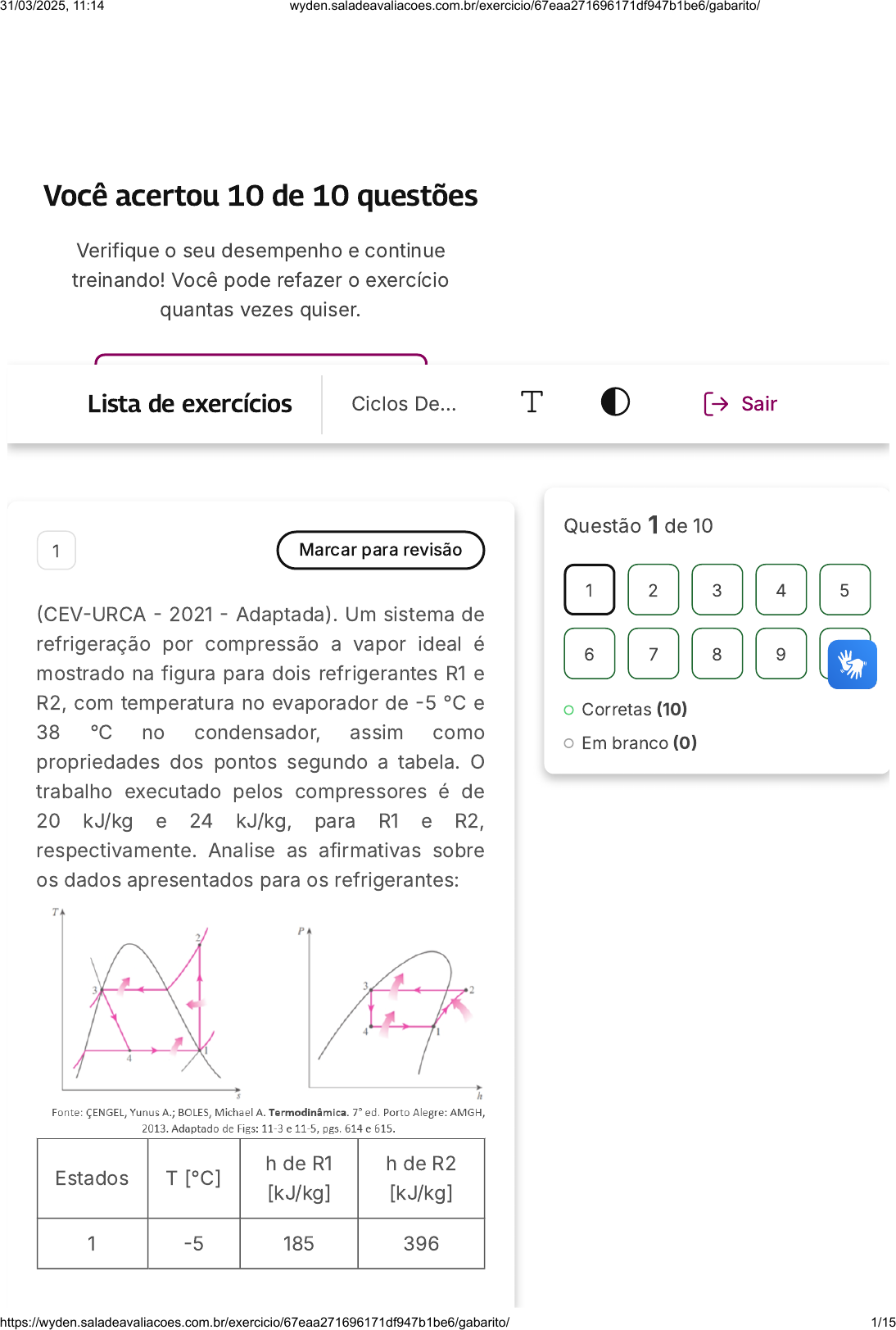Você acertou 10 de 10 questões Verifique o seu desempenho e continue treinando! Você pode refazer o exercício quantas vezes quiser. Verificar Desempenho 1 Marcar para revisão (CEV-URCA - 2021 - Adaptada). Um sistema de refrigeração por compressão a vapor ideal é mostrado na figura para dois refrigerantes R1 e R2, com temperatura no evaporador de -5 °C e 38 °C no condensador, assim como propriedades dos pontos segundo a tabela. O trabalho executado pelos compressores é de 20 kJ/kg e 24 kJ/kg, para R1 e R2, respectivamente. Analise as afirmativas sobre os dados apresentados para os refrigerantes: Estados T [°C] h de R1 [kJ/kg] h de R2 [kJ/kg] 1 -5 185 396 Questão 1 de 10 Corretas (10) Em branco (0) 1 2 3 4 5 6 7 8 9 10 Lista de exercícios Ciclos De… Sair 31/03/2025, 11:14 wyden.saladeavaliacoes.com.br/exercicio/67eaa271696171df947b1be6/gabarito/ https://wyden.saladeavaliacoes.com.br/exercicio/67eaa271696171df947b1be6/gabarito/ 1/15 A B C D E 2 38 205 490 3 38 72 253 4 -5 72 253 I. O refrigerante R1 consome maior energia e possui maior COP que R2; II. O refrigerante R2 consome maior energia e possui menor COP que R1; III. O COP máximo para o sistema analisado é maior que 6. Está correto o que se afirma em: Apenas II. Apenas I. Apenas I e III. Apenas III. Apenas II e III. Resposta correta Parabéns, você selecionou a alternativa correta. Confira o gabarito comentado! Gabarito Comentado 31/03/2025, 11:14 wyden.saladeavaliacoes.com.br/exercicio/67eaa271696171df947b1be6/gabarito/ https://wyden.saladeavaliacoes.com.br/exercicio/67eaa271696171df947b1be6/gabarito/ 2/15 2 Marcar para revisão (FEPESE - 2018 - Adaptada). O ciclo de refrigeração pode ser usado para resfriar placas de ar, líquidos ou ambientes. Analise as afirmativas abaixo a respeito da influência de alguns parâmetros na eficácia de um ciclo de refrigeração: I. Sendo mantida a temperatura de condensação constante, o coeficiente de eficácia diminui quando a temperatura de vaporização diminui. II. Sendo mantida a temperatura de vaporização constante, o coeficiente de eficácia diminui quando a temperatura condensação de diminui. 31/03/2025, 11:14 wyden.saladeavaliacoes.com.br/exercicio/67eaa271696171df947b1be6/gabarito/ https://wyden.saladeavaliacoes.com.br/exercicio/67eaa271696171df947b1be6/gabarito/ 3/15 A B C D E III. O coeficiente de eficácia diminui quando há sub-resfriamento do líquido. IV. O coeficiente de eficácia diminui quando há superaquecimento útil do vapor. Está correto o que se afirma em: Apenas I. Apenas I e III. Apenas II e III. Apenas II, III e IV. Apenas I, II, III e IV. Resposta correta Parabéns, você selecionou a alternativa correta. Confira o gabarito comentado! Gabarito Comentado Analisando o COPR para o ciclo de refrigeração de Carnot observamos que uma menor temperatura do evaporador para a mesma temperatura de condensação elevaria a eficácia do ciclo. 31/03/2025, 11:14 wyden.saladeavaliacoes.com.br/exercicio/67eaa271696171df947b1be6/gabarito/ https://wyden.saladeavaliacoes.com.br/exercicio/67eaa271696171df947b1be6/gabarito/ 4/15 A B C D E 3 Marcar para revisão (NC-UFRP - 2015 - Adaptada). Uma máquina frigorífica é um tipo de máquina térmica geradora que transforma algum tipo de energia, habitualmente mecânica, em energia térmica para obter e manter em um recinto uma temperatura menor que a temperatura exterior. Em uma máquina frigorífica funcionando com um ciclo de refrigeração por compressão de vapor, o componente responsável por retirar calor do meio a ser resfriado é denominado: Evaporador. Compressor. Expansor termostático. Condensador. Centrífuga. Resposta correta Parabéns, você selecionou a alternativa correta. Confira o gabarito comentado! Gabarito Comentado O evaporador é o componente de uma máquina frigorífica que tem a função de retirar o calor do ambiente que se deseja resfriar. Ele recebe o fluido refrigerante que vem da válvula de expansão e realiza a 31/03/2025, 11:14 wyden.saladeavaliacoes.com.br/exercicio/67eaa271696171df947b1be6/gabarito/ https://wyden.saladeavaliacoes.com.br/exercicio/67eaa271696171df947b1be6/gabarito/ 5/15 evaporação deste fluido. Esse processo de evaporação ocorre por meio da absorção de calor do ambiente a ser refrigerado, o que resulta na diminuição da temperatura do mesmo. Portanto, a alternativa correta é a "A", que indica o evaporador como o componente responsável por essa função. 4 Marcar para revisão (FADESP - 2018 - Adaptada). Na figura a seguir o diagrama esquemático é utilizado para representar os ciclos de refrigeração por compressão de vapor ideal e real. A identificação correta dos elementos númerados é a que se afirma em: 31/03/2025, 11:14 wyden.saladeavaliacoes.com.br/exercicio/67eaa271696171df947b1be6/gabarito/ https://wyden.saladeavaliacoes.com.br/exercicio/67eaa271696171df947b1be6/gabarito/ 6/15 A B C D E 1- subresfriamento, 2- processo politrópico, 3- queda de pressão e 4- superaquecimento. 1- processo politrópico, 2- queda de pressão, 3- superaquecimento e 4- subresfriamento. 1- superaquecimento, 2- queda de pressão, 3- processo politrópico e 4- subresfriamento. 1- subresfriamento, 2- superaquecimento, 3- queda de pressão e 4- processo politrópico. 1- queda de pressão, 2- subresfriamento, 3- processo politrópico e 4- superaquecimento. Resposta correta Parabéns, você selecionou a alternativa correta. Confira o gabarito comentado! Gabarito Comentado A numeração apresentada é para um processo real de refrigeração por compressão de vapor com estes processos ocorrendo. Ou seja, politrópico ao invés de isoentrópico etc. 5 Marcar para revisão 31/03/2025, 11:14 wyden.saladeavaliacoes.com.br/exercicio/67eaa271696171df947b1be6/gabarito/ https://wyden.saladeavaliacoes.com.br/exercicio/67eaa271696171df947b1be6/gabarito/ 7/15 A B C D E (FGV - 2022 - Adaptada). Em um ciclo de compressão de vapor ideal, quatro processos são necessários: 1. compre