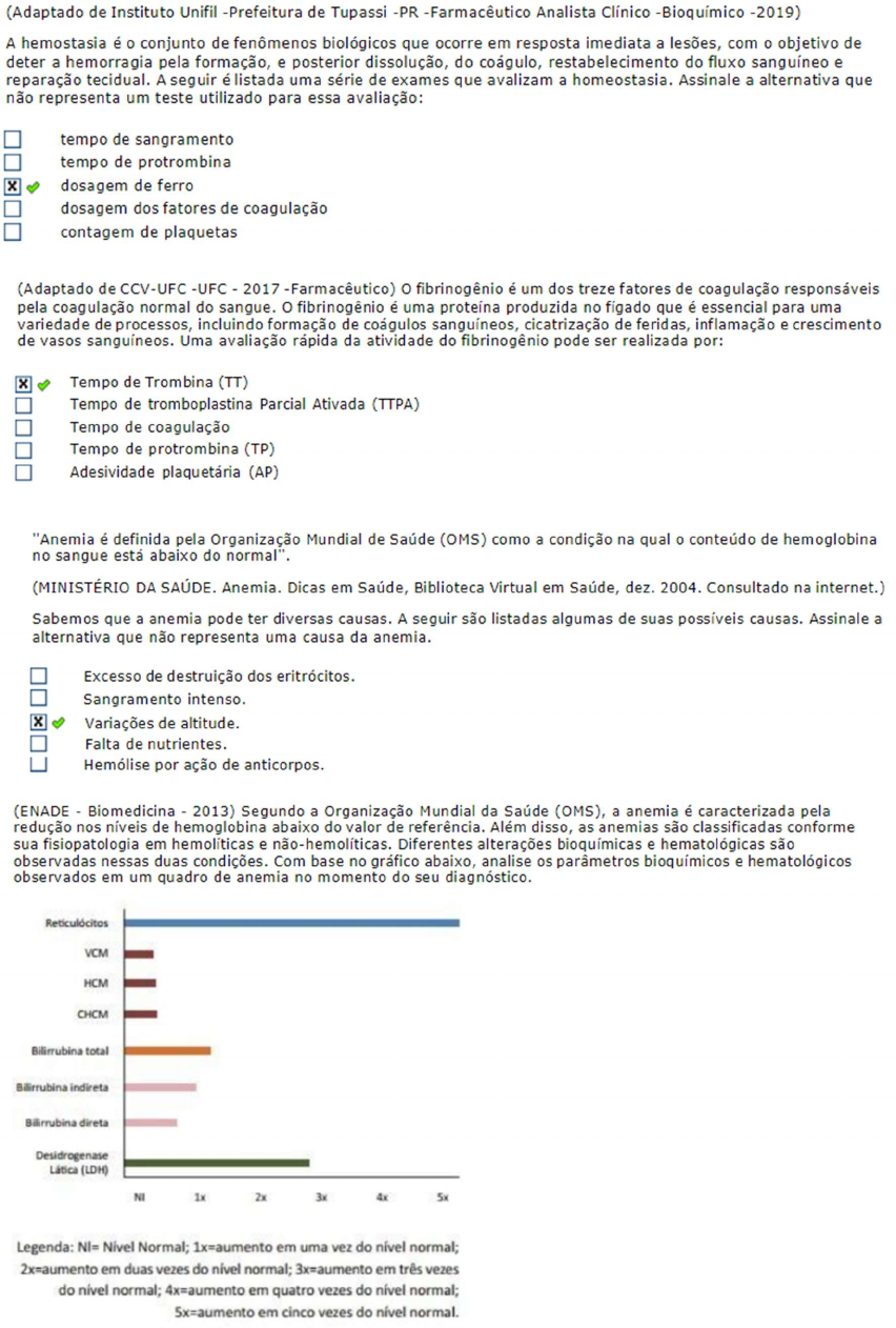 (Adaptado de Instituto Unifil -Prefeitura de Tupassi -PR -Farmacêutico Analista Clínico -2019) A hemostasia é conjunto de fenômenos biológicos que ocorre em resposta imediata a lesões, com objetivo de deter a hemorragia pela formação, e posterior dissolução, do coágulo, restabelecimento do fluxo sanguíneo e reparação tecidual. A seguir é listada uma série de exames que avalizam a homeostasia. Assinale a alternativa que não representa um teste utilizado para essa avaliação: tempo de sangramento tempo de protrombina dosagem de ferro dosagem dos fatores de coagulação contagem de plaquetas (Adaptado de CCV-UFC -UFC 2017 -Farmacêutico) o fibrinogênio é um dos treze fatores de coagulação responsáveis pela coagulação normal do sangue. fibrinogênio é uma proteína produzida no fígado que é essencial para uma variedade de processos, incluindo formação de coágulos sanguíneos, cicatrização de feridas, inflamação e crescimento de vasos sanguíneos. Uma avaliação rápida da atividade do fibrinogênio pode ser realizada por: Tempo de Trombina (TT) Tempo de tromboplastina Parcial Ativada (TTPA) Tempo de coagulação Tempo de protrombina (TP) Adesividade plaquetária (AP) "Anemia é definida pela Organização Mundial de Saúde (OMS) como a condição na qual conteúdo de hemoglobina no sangue está abaixo do normal". (MINISTÉRIO DA SAÚDE. Anemia. Dicas em Saúde, Biblioteca Virtual em Saúde, dez. 2004. Consultado na internet.) Sabemos que a anemia pode ter diversas causas. A seguir são listadas algumas de suas possíveis causas. Assinale a alternativa que não representa uma causa da anemia. Excesso de destruição dos Sangramento intenso. Variações de altitude. Falta de nutrientes. Hemólise por ação de anticorpos. (ENADE Biomedicina 2013) Segundo a Organização Mundial da Saúde (OMS), a anemia é caracterizada pela redução nos níveis de hemoglobina abaixo do valor de referência. Além disso, as anemias são classificadas conforme sua fisiopatologia em hemolíticas e não-hemolíticas. Diferentes alterações bioquímicas e hematológicas são observadas nessas duas condições. Com base no gráfico abaixo, analise os parâmetros bioquímicos e hematológicos observados em um quadro de anemia no momento do seu diagnóstico. Reticulócitos VCM HCM CHCM Bilirrubina total Bilirrubina indireta Bilirrubina direta Desidrogenase Lática (LDH) NI 1x 2x 3x 4x 5x Legenda: NI= Normal; 1x=aumento em uma vez do nível normal; 2x=aumento em duas vezes do nível normal; 3x=aumento em três vezes do nível normal; 4x=aumento em quatro vezes do nível normal; 5x=aumento em cinco vezes do nível normal.Os dados apresentados no gráfico indicam anemia carencial, podendo ser uma anemia ferropriva, pois no momento do diagnóstico foi observado um aumento na contagem de reticulócitos. anemia hemolítica, pois observa-se contagem normal de reticulócitos, além de microcitose e hipocromia no momento do diagnóstico. anemia microcítica e hipocrômica, que indica que se trata de uma anemia carencial. anemia hemolítica, visto que se observa um aumento na concentração de bilirrubina total acompanhado pelo aumento da fração indireta. anemia carencial, na qual se observa aumento na contagem de reticulócitos e de bilirrubina total. Em 1918, um novo tipo de púrpura foi descrito pela primeira vez, a Trombastenia de Glanzmann. Sobre essa patologia, analise a relação entre as afirmativas a seguir: I. É uma doença autossômica recessiva hereditária rara, onde os pacientes apresentam contagem plaquetária alterada com formação de microtrombos. Porque II. Há alteração no grupamento proteico GPIb/IX/V que facilita a agregação plaquetária. A respeito dessas asserções, assinale a opção correta: As asserções I e II são proposições verdadeiras e a II é uma justificativa da I. A asserção I é uma proposição verdadeira, enquanto a II é falsa. As asserções I e II são proposições verdadeiras, mas a II não é uma justificativa da I. A asserção I é uma proposição falsa e a II é uma proposição verdadeira. As asserções I e II são proposições falsas. As plaquetas são fragmentos celulares derivados de grandes células multinucleadas situadas na medula os megacariócitos (a célula mãe). A sobrevida desses fragmentos no sangue periférico varia em torno de 8 dias e estima-se que 3.500 novas plaquetas. Sobre as alterações nas plaquetas a analise as relação entre as afirmativas a seguir: I. Pacientes com ausência ou alterações na ADAMTS13 apresentam a formação de agregados plaquetários intravasculares, resultando em trombos vasculares. Porque II. Os grandes do fvW são liberados da célula endotelial, esses são clivados e removidos da circulação pela enzima ADAMTS13 (Desintegrin and Metalloprotease with eight Thrombo Spondin-1-like), que cliva fator em unidades menores não funcionais. A respeito dessas asserções, assinale a opção correta: As asserções I e II são proposições verdadeiras e a II é uma justificativa da I. As asserções I e II são proposições verdadeiras, mas a II não é uma justificativa da I. A asserção I é uma proposição verdadeira, enquanto a II é falsa. As asserções I e II são proposições falsas. A asserção I é uma proposição falsa e a II é uma proposição verdadeira. Paciente XWZ, 40 anos, chegou ao hospital com anemia moderada, neutropenia grave, trombocitopenia importante e medula óssea muito hipocelular (24% de celularidade). Qual é diagnóstico mais provável? Mielofibrose com metaplasia mieloide. Leucemia mieloide crônica. Mielodisplasia do tipo AREB-2. Anemia aplásica (aplástica) grave. Leucemia linfoblástica aguda. A leucemia linfoide crônica (LLC) é um tipo de transtorno linfoproliferativo de células B. Abaixo estão descritas diferentes características dessa patologia. Assinale a alternativa não contém uma característica da LLC: Normalmente tem curso mais a