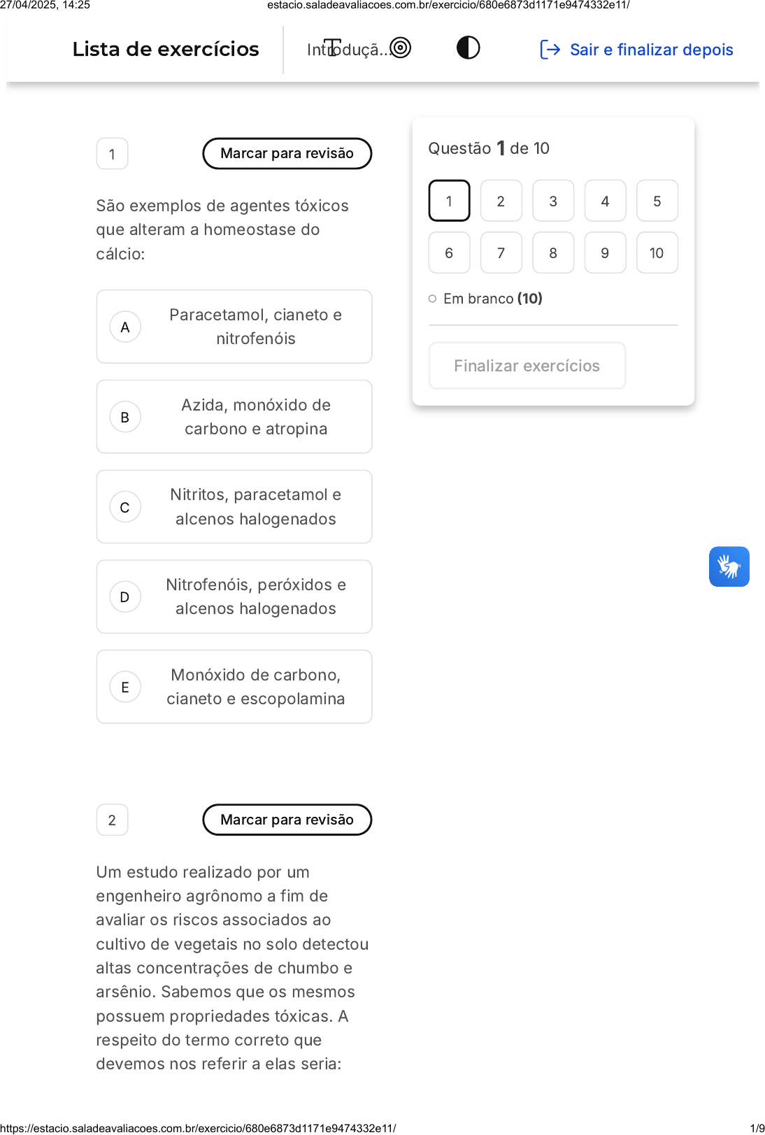A B C D E 1 Marcar para revisão São exemplos de agentes tóxicos que alteram a homeostase do cálcio: Paracetamol, cianeto e nitrofenóis Azida, monóxido de carbono e atropina Nitritos, paracetamol e alcenos halogenados Nitrofenóis, peróxidos e alcenos halogenados Monóxido de carbono, cianeto e escopolamina 2 Marcar para revisão Um estudo realizado por um engenheiro agrônomo a fim de avaliar os riscos associados ao cultivo de vegetais no solo detectou altas concentrações de chumbo e arsênio. Sabemos que os mesmos possuem propriedades tóxicas. A respeito do termo correto que devemos nos referir a elas seria: Questão 1 de 10 Em branco (10) 1 2 3 4 5 6 7 8 9 10 Finalizar exercícios Lista de exercícios Introduçã… Sair e finalizar depois 27/04/2025, 14:25 estacio.saladeavaliacoes.com.br/exercicio/680e6873d1171e9474332e11/ https://estacio.saladeavaliacoes.com.br/exercicio/680e6873d1171e9474332e11/ 1/9 A B C D E A B Toxina Toxicante Veneno Extrato Antídoto 3 Marcar para revisão Com relação ao conceito de toxicologia, assinale a alternativa correta: Toxicologia estuda os efeitos adversos sobre seres humanos e animais. Tem como foco a observação de componentes usados em alimentos. Toxicologia é uma ciência multidisciplinar que avalia as alterações biológicas e as intoxicações produzidas pelas substâncias químicas nos organismos vivos e meio ambiente. 27/04/2025, 14:25 estacio.saladeavaliacoes.com.br/exercicio/680e6873d1171e9474332e11/ https://estacio.saladeavaliacoes.com.br/exercicio/680e6873d1171e9474332e11/ 2/9 C D E A B Toxicologia é uma ciência que estuda os efeitos adversos de produtos químicos e contaminação por microrganismos. Toxicologia é uma ciência multidisciplinar que estuda a tolerância aos produtos químicos nos organismos dos seres humanos. Toxicologia é a ciência que estuda os efeitos adversos provocados apenas por compostos químicos inorgânicos. 4 Marcar para revisão Leia as alternativas abaixo e marque a opção correta: Um dos parâmetros utilizados para expressar o grau de toxicidade crônica das substâncias químicas é a DL50. A natureza dos efeitos tóxicos produzidos por um certo agente químico independe da frequência e duração da exposição. 27/04/2025, 14:25 estacio.saladeavaliacoes.com.br/exercicio/680e6873d1171e9474332e11/ https://estacio.saladeavaliacoes.com.br/exercicio/680e6873d1171e9474332e11/ 3/9 C D E Com base nos valores de DL50, as substâncias que necessitam de altas doses para produzir o efeito tóxico são classificadas como pouco tóxicas. A DL50 é um parâmetro cujo efeito medido é a alergia. Os efeitos tóxicos de uma substância são determinados pela prevalência de pessoas que sofrem intoxicação. 5 Marcar para revisão O Paracetamol é metabolizado no fígado principalmente por três vias. Uma delas origina um metabólito que tem variável grau de toxicidade para vários órgãos, atingindo principalmente o fígado, o que pode causar insuficiência hepática (IH), além de danos ao sistema de coagulação e nefrotoxicidade. O diagnóstico precoce, que é de grande importância para iniciar o tratamento, pode ser realizado após avaliação da história do paciente, bem como dos aspectos clínicos e laboratoriais. Em relação ao mecanismo de ação tóxica do paracetamol pode-se dizer que é do tipo: 27/04/2025, 14:25 estacio.saladeavaliacoes.com.br/exercicio/680e6873d1171e9474332e11/ https://estacio.saladeavaliacoes.com.br/exercicio/680e6873d1171e9474332e11/ 4/9 A B C D E A B C Interferência na estabilidade das membranas. Complexação com biomoléculas. Interferência no influxo de cálcio intracelular. Interação com DNA. Interação com lipídios. 6 Marcar para revisão Os agentes tóxicos tem acesso ao organismo após o processo de absorção. Ao refletirmos sobre possíveis vias para absorção de agrotóxicos manipulados pelos trabalhadores agrícolas, podemos dizer que a intoxicação sistêmica é possível pois esses agentes são absorvidos pelas vias: Respiratória e dérmica. Ocular e nasal. Pele e pulmão. 27/04/2025, 14:25 estacio.saladeavaliacoes.com.br/exercicio/680e6873d1171e9474332e11/ https://estacio.saladeavaliacoes.com.br/exercicio/680e6873d1171e9474332e11/ 5/9 D E A B C D E Respiratória, dérmica, ocular e nasal Oral e nasal 7 Marcar para revisão Considere as seguintes afirmações em relação aos conceitos de toxicologia: I. Toxicidade: é a capacidade que um agente químico tem de causar danos. II. Risco: é definido como a probabilidade esperada de ocorrência de um efeito indesejável decorrente da exposição a um agente tóxico. III. Intoxicação é a manifestação dos efeitos tóxicos. É o processo patológico efetivamente que é evidenciado pelos sinais e sintomas. Está correta a afirmação: I e II. I e III. II e III. I, II e III. I apenas 27/04/2025, 14:25 estacio.saladeavaliacoes.com.br/exercicio/680e6873d1171e9474332e11/ https://estacio.saladeavaliacoes.com.br/exercicio/680e6873d1171e9474332e11/ 6/9 A B C D E 8 Marcar para revisão Sobre as vias de exposição e os diferentes casos de intoxicação, analise as afirmativas abaixo: I. A intoxicação por carbamato (chumbinho) é estabelecida por exposição por via digestiva. II. A intoxicação por clorofórmio é estabelecida por exposição por via respiratória. III. A intoxicação por organofosforados é estabelecida por via intramuscular. É correto o que se afirmar em I, apenas. II, apenas. I e II, apenas. I e III, apenas. I, II e III. 9 Marcar para revisão Um incêndio matou 35 crianças e deixou 41 feridas, algumas em estado grave. As crianças com idades entre 4 meses e 3 anos, morreram por asfixia após início do incêndio em um prédio vizinho. A asfixia foi notadamente provocada pelo monóxido de carbono. A 27/04/2025, 14:25 estacio.saladeavaliacoes.com.br/exercicio/680e6873d1171e9474332e11/ https://estacio.saladeavaliacoes.com.br/exercicio/680e6873d1171e9474332e11/ 7/9 A B C D E respeito d