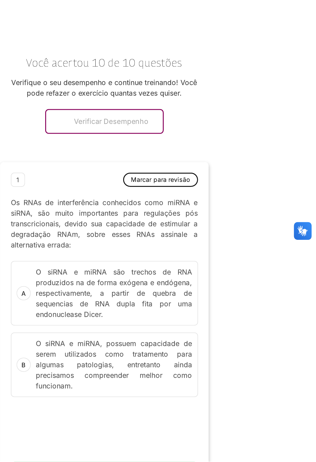 27/04/2025 16:54 https://wyden.saladeavaliacoes.com.br/exercicio/680e8a78d1171e947438d1cf/gabarito/ https://wyden.saladeavaliacoes.com.br/exercicio/680e8a78d1171e947438d1cf/gabarito/ 1/15 Você acertou 10 de 10 questões Verifique o seu desempenho e continue treinando! Você pode refazer o exercício quantas vezes quiser. Verificar Desempenho A B 1 Marcar para revisão Os RNAs de interferência conhecidos como miRNA e siRNA, são muito importantes para regulações pós transcricionais, devido sua capacidade de estimular a degradação RNAm, sobre esses RNAs assinale a alternativa errada: O siRNA e miRNA são trechos de RNA produzidos na de forma exógena e endógena, respectivamente, a partir de quebra de sequencias de RNA dupla fita por uma endonuclease Dicer. O siRNA e miRNA, possuem capacidade de serem utilizados como tratamento para algumas patologias, entretanto ainda precisamos compreender melhor como funcionam. 27/04/2025 16:54 https://wyden.saladeavaliacoes.com.br/exercicio/680e8a78d1171e947438d1cf/gabarito/ https://wyden.saladeavaliacoes.com.br/exercicio/680e8a78d1171e947438d1cf/gabarito/ 2/15 C D E O miRNA e o siRNA são pequenos trechos de RNA com capacidade de degradar o RNAm, logo são responsáveis por alterações pós- traducionais. A descoberta do miRNA e siRNA nos levou a compreensão de mais um mecanismo de regulação gênica dos eucariotos. O miRNA tem origem endógena e siRNA exógena ou endógena. Resposta correta Parabéns, você selecionou a alternativa correta. Confira o gabarito comentado! Gabarito Comentado A resposta correta é: O miRNA e o siRNA são pequenos trechos de RNA com capacidade de degradar o RNAm, logo são responsáveis por alterações pós-traducionais. O miRNA e o siRNA são pequenos trechos de RNA com capacidade de degradar o RNAm, logo são responsáveis por alterações pós-traducionais. 2 Marcar para revisão �Regulação da expressão gênica: como o genes são regulados.Disponivel em:https://planetabiologico.com.br/genetica/regulacao- da-expressao-genica-como-o-genes-sao-regulados/. Acessado em 21/09/2022�. Para uma célula funcionar adequadamente, as proteínas necessárias devem ser sintetizadas no momento Questão 1 de 10 Corretas �10� Em branco �0� 1 2 3 4 5 6 7 8 9 10 Lista de exercícios Introdução À… Sair 27/04/2025 16:54 https://wyden.saladeavaliacoes.com.br/exercicio/680e8a78d1171e947438d1cf/gabarito/ https://wyden.saladeavaliacoes.com.br/exercicio/680e8a78d1171e947438d1cf/gabarito/ 3/15 A B C D E adequado. Todos os organismos e células controlam ou regulam a transcrição e tradução do seu DNA em proteína. Seja em um organismo unicelular simples ou em um organismo multicelular complexo, cada célula controla quando e como seus genes são expressos. Sobre o mecanismo de regulação gênica dos procariotos, avalie as afirmativas a seguir. I. A regulação da expressão em procariotos ocorre com menor custo energético, durante a estabilização da proteína, que é o produto da fase de tradução. II. A transcrição ocorre a partir do acoplamento da RNA polimerase em uma sequência de DNA, chamada de região promotora. III. Os fatores transcricionais, apenas inibem a expressão gênica. Em face do exposto, assinale a opção correta. Somente a afirmativa I está correta. Somente a afirmativa II está correta. Somente a afirmativa III está correta. Somente as afirmativas I e II estão corretas. Somente as afirmativas II e III estão corretas. Resposta correta Parabéns, você selecionou a alternativa correta. Confira o gabarito comentado! Gabarito Comentado 27/04/2025 16:54 https://wyden.saladeavaliacoes.com.br/exercicio/680e8a78d1171e947438d1cf/gabarito/ https://wyden.saladeavaliacoes.com.br/exercicio/680e8a78d1171e947438d1cf/gabarito/ 4/15 A regulação da expressão em procariotos pode acontecer em diferentes pontos, com maior custo energético, durante a estabilização da proteína, que é o produto da fase de tradução, ou durante a transcrição, com menor custo de energia, pois ainda não ocorreu a tradução do RNAm �RNA mensageiro). A transcrição ocorre a partir do acoplamento da RNA polimerase em uma sequência de DNA, chamada de região promotora. Todos os genes (sequências de DNA codificantes) possuem uma região promotora. Essa região pode inclusive favorecer uma maior ou menor expressão gênica, fazendo um controle negativo ou positivo, dependendo da ligação de determinadas proteínas conhecidas como fatores transcricionais, que inibem ou ativam a expressão gênica. 3 Marcar para revisão Embora os organismos eucariotos possam ser multicelulares, com células diferentes atuando em locais diferentes, todas possuem o mesmo DNA. Sobre a regulação do gênica dos eucariotos, avalie as afirmativas abaixo: I. A especialização celular é possível devido a regulação gênica e o processamento do RNAm. II. A compactação e descompactação do DNA em eucariotos são dadas pelas proteínas histonas, sendo um tipo de regulação gênica. III. O padrão de histonas do seu DNA é um dos fatores que faz com que diferentes células tenham funções diferentes. Estão corretas apenas as afirmativas: 27/04/2025 16:54 https://wyden.saladeavaliacoes.com.br/exercicio/680e8a78d1171e947438d1cf/gabarito/ https://wyden.saladeavaliacoes.com.br/exercicio/680e8a78d1171e947438d1cf/gabarito/ 5/15 A B C D E I. I e II. I e III. II e III. I, II e III. Resposta correta Parabéns, você selecionou a alternativa correta. Confira o gabarito comentado! Gabarito Comentado Ao pensarmos em especialização celular, uma célula do seu intestino precisa absorver e transportar nutrientes com muita eficiência. Já uma célula da sua pele tem que se multiplicar mais, conferir resistência e acumular queratina. No entanto, ambos os tipos celulares têm os mesmos genes, praticamente todo o DNA é igual! Mas como isso é possível? O segredo desse paradoxo é a regulação gênica e o processamento do RNAm. A compactaçã