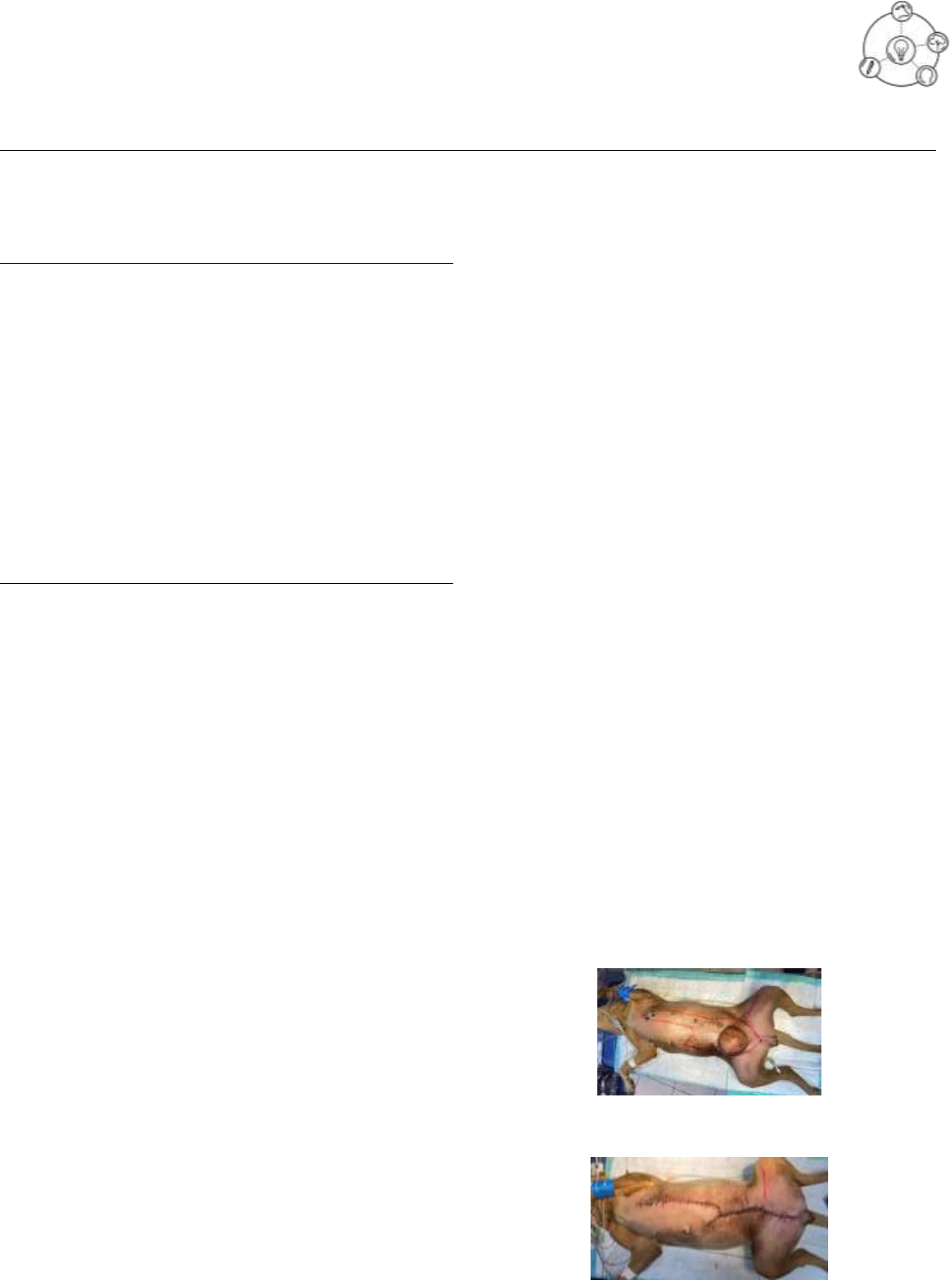 XIV Colóquio Técnico Científico de Saúde Única, Ciências Agrárias e Meio Ambiente MASTECTOMIA UNILATERAL ESQUERDA, REGIONAL CAUDAL DIREITA E OVARIOHISTERECTOMIA: RELATO DE CASO CIRÚRGICO Anna Caroline Castelan da Mata1*, Rhilaria Gabriela da Silveira2, Rayssa Secundino da Silva Augusto3 e Ashiley Martins de Souza Miranda4. 1Discente no Curso de Medicina Veterinária – Centro Universitário de Belo Horizonte - UniBH – Belo Horizonte/MG – Brasil – *Contato: anna.c.damata@gmail.com 2Discente no Curso de Medicina Veterinária – Universidade Salgado de Oliveira - Universo– Belo Horizonte/MG – Brasil 3Discente no Curso de Medicina Veterinária – Pontifícia Universidade Católica de Minas Gerais – PUC Minas – Belo Horizonte/MG – Brasil 4Discente no Curso de Medicina Veterinária – Centro Universitário UMA – Belo Horizonte/MG – Brasil INTRODUÇÃO O tumor mamário é um dos mais frequentes em cadelas que foram submetidas à castração tardia, na fase sênior ou de meia idade que realizaram a ovariohisterectomia, é uma neoplasia decorrente da perda do controle da divisão celular e crescimento anômalo das células presentes na cadeia mamária1. O tratamento é cirúrgico e o nódulo retirado deve ser encaminhado para análise histopatológica para avaliar uso de terapias antineoplásicas complementares. O acompanhamento clínico em pacientes oncológicos é de extrema importância e deve ser realizado por toda a vida do paciente. No seguinte trabalho é relatada uma cadela sem raça definida, 27,1 kg, 12 anos diagnosticada com nódulo na quinta mama esquerda (M5E), inguinal, na terceira mama esquerda (M3E), abdominal 1, e na quarta mama direita (M4D), abdominal 2, como tratamento foi realizado o procedimento cirúrgico de mastectomia unilateral esquerda, regional caudal direita e ovariohisterectomia. O nódulo foi encaminhado para análise histopatológica tendo como resultado adenoma tubular e adenoma de lactação. RELATO DE CASO E DISCUSSÃO Um cão, sem raça definida, aproximadamente 12 anos de idade, não castrada, deu entrada em uma Clínica Veterinária, com histórico de nódulo com crescimento gradual a mais de um ano e, aumento acentuado no período de dois meses anteriores. A paciente foi submetida a exame clínico, e, no momento da palpação, foi possível notar um nódulo de 12,6 centímetros de diâmetro em sua M5E, um aumento de volume na M3E e em sua M4D. A fisiopatologia de tumores mamários advém do uso de medicamentos contraceptivos, pseudocieses recorrentes e hormônios sexuais como o estrógeno, a prolactina, progesterona, os andrógenos e os hormônios tireoidianos estão envolvidos na carcinogênese mamária como descrito na literatura2. Após a avaliação optou-se pela terapêutica cirúrgica. Anterior ao procedimento, foi coletada amostra de sangue para realização de hemograma e bioquímico sérico, além da realização de Ecocardiograma, ultrassom abdominal e radiografia torácica em três incidências: ventro dorsal, lateral-direita e lateral-esquerda. Em nenhum exame complementar foi observado alterações. A paciente foi submetida à intervenção cirúrgica, onde foi utilizada a técnica de mastectomia unilateral esquerda, regional caudal direita e ovariohisterectomia. O animal foi submetido a jejum alimentar e restrição hídrica por 12 horas antes do procedimento cirúrgico. Dado início a sedação da paciente, a mesma foi colocada em decúbito dorsal na mesa cirúrgica. No manejo anestésico, a paciente foi entubada e induzida com propofol (6 mg/kg). A tricotomia da região abdominal abrangeu ambas cadeias mamárias, sendo realizada também, tricotomia do membro torácico direito para acesso venoso. A assepsia foi realizada com uso de Clorexidina 2% em toda a região tricotomizada com demarcação do bloco mamário proposto (Fig. 1). Iniciou-se a paramentação da equipe cirúrgica, foi colocado o pano de campo, prendendo o com as pinças backhaus. Com o bisturi iniciou-se uma incisão no abdômen em linha média ventral retro umbilical, feita exposição do corpo uterino com auxílio do gancho de Snoock, realizada ligadura dupla do corpo e dos vasos uterinos com fio de sutura absorvível Poliglicólico 0 na região do cérvix uterino. Após a ligadura foi realizado corte do corpo uterino com bisturi ultrassônico, e posteriormente celiorrafia em padrão simples contínuo com fio de sutura absorvível Poliglicólico 0. Em seguida, foi realizada incisão na linha proposta e dissecação do bloco mamário com a tesoura de Metzembaum, ligaduras duplas dos vasos epigástricos utilizando fio de sutura Ácido Poliglicólico 2-0 para hemostasia. Iniciada a retirada da cadeia e do linfonodo axilar com o bisturi ultrassônico e aproximação dos tecidos com walking suture com fio sutura Ácido Poliglicólico 2-0. Por fim, foi executado o fechamento da camada subcuticular com sutura contínua com Fio Ácido Poliglicólico 2-0, logo após, a dermorrafia em padrão simples contínuo na porção cranial e em X modificado na porção caudal com fio nylon 3-0 (Fig. 2). Após a retirada da cadeia mamária, foi realizado curativo filme transparente e a paciente foi enfaixada por toda região abdominal. O nódulo foi encaminhado para o histopatológico e como resultado foi constatado adenoma de lactação e adenoma tubular. Após 12 dias da realização do procedimento, foi feita avaliação da ferida cirúrgica, que apresentou boa cicatrização, sem presença de edema ou seroma e realizado a retirada dos pontos. No relato de caso apresentado foi constatado uma neoplasia mamária em cadela de 12 anos. O adenoma tubular segundo a literatura é um tumor benigno epitelial raro na mama3, contudo os estudos são baseados em pacientes humanos, carecendo no âmbito da medicina veterinária. O risco de desenvolvimento de neoplasias mamárias é reduzido em 0,5% em cadelas castradas antes do primeiro estro, quando realizado após o primeiro