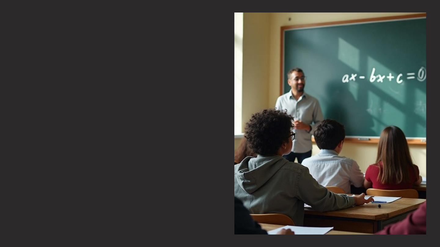 Equações e Inequações Abordagem abrangente sobre equações e inequações do 2º grau. Introdução Nesta apresentação, discutiremos as equações e inequações do 2º grau, explorando suas definições, métodos de resolução e aplicações gráficas. Equações do 2º grau 01 Definição e Forma Geral As equações do 2º grau são expressões matemáticas da forma ax² + bx + c = 0, onde a, b e c são constantes e a ≠ 0. Essa forma é conhecida como forma padrão. As soluções podem ser encontradas utilizando a fórmula de Bhaskara, que determina as raízes da equação. Solução por Fórmulas Para resolver uma equação do 2º grau, podemos usar a fórmula de Bhaskara: x = (-b ± √(b² - 4ac)) / (2a). O discriminante (b² - 4ac) indica a natureza das raízes: se positivo, existem duas raízes reais e distintas; se zero, uma raiz real; e se negativo, raízes complexas. Gráficos e Propriedades Os gráficos de equações do 2º grau são parábolas, que podem ter aberturas para cima ou para baixo, dependendo do coeficiente 'a'. As características principais incluem o vértice, que é o ponto máximo ou mínimo da parábola, e as interseções com o eixo x, que correspondem às raízes da equação. O eixo de simetria passa pelo vértice e divide a parábola em duas partes iguais. Inequações do 2º grau 02 Definição e Tipos As inequações do 2º grau são expressões que envolvem desigualdades, como ax² + bx + c > 0 ou ax² + bx + c Métodos de Resolução Para resolver inequações do 2º grau, é comum primeiro resolver a equação associada (ax² + bx + c = 0) para encontrar as raízes. Em seguida, determina-se o sinal da expressão em intervalos definidos pelas raízes usando testes de sinal ou gráfico. É crucial analisar em quais intervalos a inequação é verdadeira, completando assim a solução. Interpretação Gráfica Gráficamente, as soluções das inequações correspondem às regiões da parábola que estão acima ou abaixo do eixo x, dependendo do sinal da inequação. A análise do gráfico facilita a compreensão das soluções, onde as raízes são os pontos críticos que delimitam os intervalos de solução. Cada caso deve ser examinado considerando as desigualdades estabelecidas. Conclusões Em suma, o estudo das equações e inequações do 2º grau é fundamental na matemática, apresentando métodos de resolução eficazes e aplicações gráficas que facilitam a compreensão. Com uma abordagem sistemática, podemos resolver essas equações e inequações, usando gráficos para visualizar e interpretar as soluções. Thank you! Do you have any questions? +91 620 421 838 CREDITS: This presentation template was created by Slidesgo, and includes icons, and infographics & images by Freepik image1.jpeg image2.png image3.jpeg image4.png image5.png image6.png image7.png