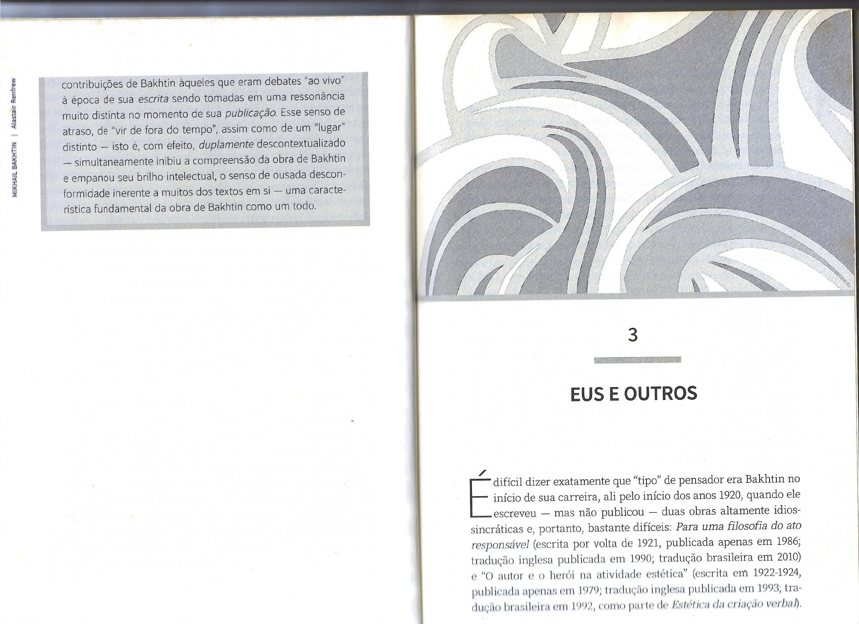 contribuições de Bakhtin que eram debates "ao vivo" à época de sua escrita sendo tomadas em uma ressonância muito distinta no momento de sua publicação. Esse senso de atraso, de "vir de fora do tempo", assim como de um "lugar" distinto - isto é, com efeito, duplamente descontextualizado - simultaneamente inibiu a compreensão da obra de Bakhtin e empanou seu brilho intelectual, senso de ousada descon- formidade inerente a muitos dos textos em si - uma caracte- rística fundamental da obra de Bakhtin como um todo. 3 EUS E OUTROS difícil dizer exatamente que "tipo" de pensador era Bakhtin no início de sua carreira, ali pelo início dos anos 1920, quando ele escreveu - mas não publicou - duas obras altamente idios- sincráticas e, portanto, bastante difíceis: Para uma filosofia do ato responsável (escrita por volta de 1921, publicada apenas em 1986; tradução inglesa publicada em 1990; tradução brasileira em 2010) e "O autor e O herói na atividade estética" (escrita em 1922-1924, publicada apenas em 1979; tradução inglesa publicada em 1993; tra- dução brasileira em 1992, como parte de Estética da criaçãoA máxima aproximação poderia ser "filósofo", embora estas obras tifica teoreticismo como uma das doenças-chave do pensamento EUS estejam muito longe de alguma conformidade com as normas da moderno (particularmente do pensamento científico). Teoreticis- filosofia acadêmica; elas estão, além disso, visivelmente preocupa- mo é nome dado por Bakhtin a todas as formas de pensamento das com a literatura, trazida para a órbita da filosofia como uma que imaginam que a cognição ou a descrição daquilo que ele categoria específica a bem dizer, única em estética. E, mais chama de "conteúdo/sentido" de todo ato esgota seu pleno valor importante, no âmago dessas obras, há um modelo de relações eu- ou significação, e "ato" é explicitamente entendido como englo- -outro claramente não limitado ao mundo "ficcional" e que é impli- bando tanto pensamentos e afirmações quanto ações. O que dife- citamente oferecido na descrição de como, para dizer de maneira rentes pessoas podem dizer ou fazer em situações distintas não simples, os seres humanos se entendem e interagem uns com os pode necessariamente ser equacionado em termos de conteúdo ou outros. No decorrer deste livro, nosso foco se concentrará cada vez sentido aparentemente similares. Por exemplo, uma declaração mais nas implicações do fato de que modelo bakhtiniano para de princípio legal ou científico, mesmo válida dentro das frontei- as relações eu-outro, embora não restrito à literatura, depende ao ras de seu domínio particular, não esgota os modos e contextos mesmo tempo dela para sua exposição. nos quais ela pode ter significação. É por isso que a "transcrição Os termos nos quais esse modelo de relações eu-outro é teórica" do sentido aparentemente direto que se pode abstrair do expresso são os tijolos do pensamento maduro de Bakhtin, ali- ato (ou do pensamento, ou da afirmação) jamais é adequado ao mentando futuro conceito central do dialogismo. Eventicidade, que Bakhtin chama de mundo real único" (PFA 12) no qual os responsabilidade, corporificação, exterioridade, acabamento, ina- atos são desempenhados por sujeitos reais e situados. O pensa- cabamento e arquitetônica são todos conceitos indispensáveis à mento puramente "teorético" quer dizer, abstrato não pode visão bakhtiniana do mundo e do texto; são também, como acessar que poderia ser considerado como âmago absoluto do se depreende imediatamente, muito pouco familiares tanto para pensamento de Bakhtin: o "evento único de Ser" (PFA 12, destaque quem se interessa por filosofia quanto para aqueles primariamen- meu). O pensamento teorético (abstrato) sempre produzirá um re- te interessados em literatura. Este capítulo delineará, sem dúvida, lato parcial, limitado de seu objeto, seja esse objeto ação, fala ou a "arquitetônica" básica do modelo bakhtiniano das relações eu- escrita humanas. O teoreticismo sempre carecerá da eventicida- -outro, uma discussão que necessariamente acarretará exame de (sobytiinost') de todo ato ou fenômeno, sua qualidade de ser de conceitos mais familiares e possivelmente não menos difíceis unicamente situado, carnal e temporalmente, em um sujeito que ser e eu. Somos forçados a começar, contudo, por aquilo que aceita conscientemente a responsabilidade por seu ato. Nada pode pode parecer um lugar especialmente esquisito para alguém tão ser percebido na plenitude de seu sentido se entendido sem que profundamente impactado pela "teoria". seja levada em conta sua eventicidade. Mas isso não representa a destituição do conteúdo do pensa- TEORETICISMO E EVENTICIDADE mento científico, cujas proposições são válidas dentro de seu do- mínio próprio, particular: a gravidade, por exemplo, atua sobre A fragmentária abertura da mais extensa obra inicial de Bakhtin, seu objeto de maneira descritível e generalizável, mas tal descri- Para uma filosofia do ato quase imediatamente iden- ção não pode nem tenta acessar a totalidade da minha ou da sua experiência da gravidade. Para usar um exemplo extraído de Bakhtin publicou breve artigo programático, "Arte e responsabilidade" em 1919, seu único trabalho publicado até a publicação de "Problemas da arte de em uma obra ligeiramente posterior "O problema do conteúdo, do 43material e da forma na arte verbal" -, conhecimento da com- tornar a base da lei, ela necessariamente faz sem levar em con- posição química da pintura não é a mesma coisa que entender (a ta a eventicidade do ato individual (ou do ato potencial) desem- experiência) da impressão que a cor produz no espectador; mais penhado por um sujeito real, encarnado. Ela inscreve, portanto, OUTROS profundamente, proposições técnicas e científicas podem ter va- teoreticismo em fenômenos que não apenas terão um impacto lidade intríns