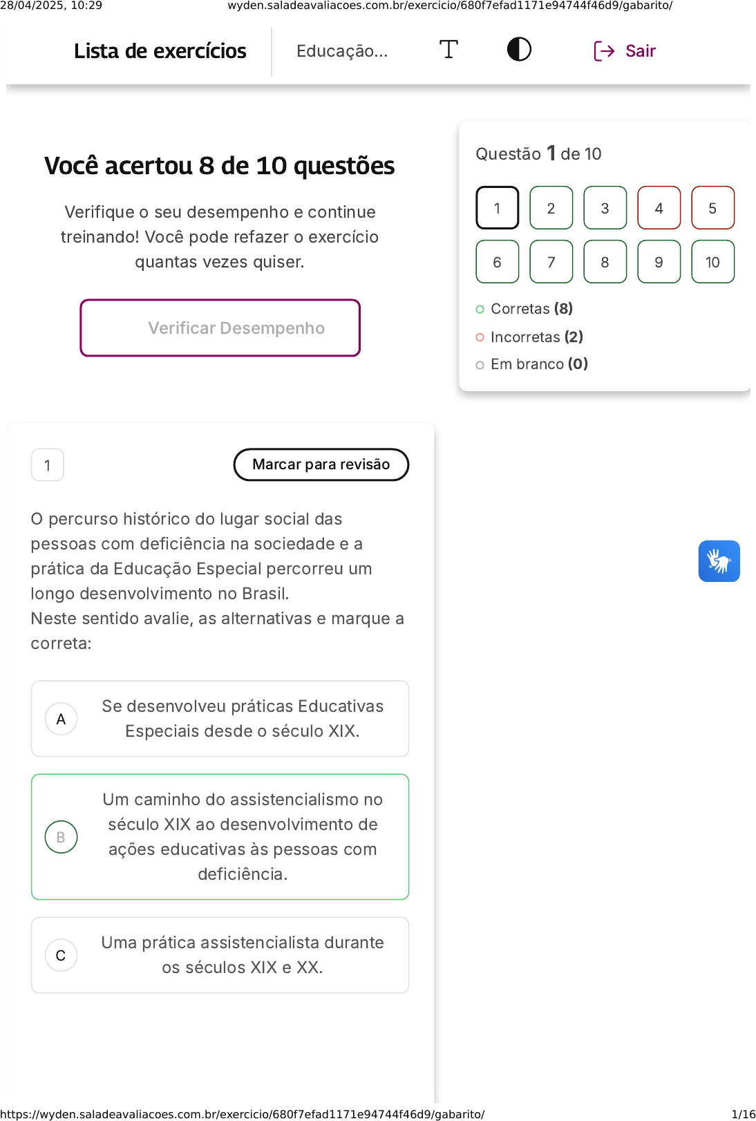 Você acertou 8 de 10 questões Verifique o seu desempenho e continue treinando! Você pode refazer o exercício quantas vezes quiser. Verificar Desempenho A B C 1 Marcar para revisão O percurso histórico do lugar social das pessoas com deficiência na sociedade e a prática da Educação Especial percorreu um longo desenvolvimento no Brasil. Neste sentido avalie, as alternativas e marque a correta: Se desenvolveu práticas Educativas Especiais desde o século XIX. Um caminho do assistencialismo no século XIX ao desenvolvimento de ações educativas às pessoas com deficiência. Uma prática assistencialista durante os séculos XIX e XX. Questão 1 de 10 Corretas (8) Incorretas (2) Em branco (0) 1 2 3 4 5 6 7 8 9 10 Lista de exercícios Educação… Sair 28/04/2025, 10:29 wyden.saladeavaliacoes.com.br/exercicio/680f7efad1171e94744f46d9/gabarito/ https://wyden.saladeavaliacoes.com.br/exercicio/680f7efad1171e94744f46d9/gabarito/ 1/16 D E Somente no século XXI passa a se desenvolver ações educativas voltadas para as pessoas com deficiência. Desde o início da sistematização da Educação no Brasil, aconteciam práticas sistêmicas de Educação Especial. Resposta correta Parabéns, você selecionou a alternativa correta. Confira o gabarito comentado! Gabarito Comentado A resposta certa é: Um caminho do assistencialismo no século XIX ao desenvolvimento de ações educativas às pessoas com deficiência. A Educação Especial no Brasil teve início no século XIX, com o surgimento de instituições assistencialistas para pessoas com deficiência. No início do século XX, essas instituições passaram a oferecer também educação formal, mas ainda de forma assistencialista. Somente a partir da década de 1970 é que a Educação Especial passou a ser pensada como uma modalidade de ensino que atende às necessidades educacionais específicas de pessoas com deficiência. 2 Marcar para revisão 28/04/2025, 10:29 wyden.saladeavaliacoes.com.br/exercicio/680f7efad1171e94744f46d9/gabarito/ https://wyden.saladeavaliacoes.com.br/exercicio/680f7efad1171e94744f46d9/gabarito/ 2/16 A B C D E A Comunicação Alternativa e Ampliada (CAA) está para além de uma subárea da Tecnologia Assistiva. Isso porque: Envolve o não uso de sistemas e recursos alternativos que oferecem aos indivíduos sem fala funcional possibilidades para se comunicar. Envolve o uso de sistemas e recursos alternativos que oferecem aos indivíduos sem fala funcional possibilidades para se comunicar. Envolve o uso de sistemas e recursos alternativos, mas não favorece a interação. Envolve o uso de sistemas e recursos alternativos que oferecem aos indivíduos com fala funcional possibilidades para se comunicar. Envolve a criação de debates teóricos a serem feitos pelos professores sobre como lidar com alunos com necessidades especiais. Resposta correta Parabéns, você selecionou a alternativa correta. Confira o gabarito comentado! Gabarito Comentado A CAA é uma área que envolve o uso de sistemas e recursos alternativos que oferecem aos indivíduos sem fala funcional 28/04/2025, 10:29 wyden.saladeavaliacoes.com.br/exercicio/680f7efad1171e94744f46d9/gabarito/ https://wyden.saladeavaliacoes.com.br/exercicio/680f7efad1171e94744f46d9/gabarito/ 3/16 A B C D E possibilidades para se comunicar. Ela está para além de uma subárea da Tecnologia Assistiva, pois não se limita ao uso de tecnologias, mas também envolve o uso de estratégias e recursos não tecnológicos. 3 Marcar para revisão A Declaração de Salamanca, estabelecida em 1994 na Espanha, representa um compromisso global com a educação inclusiva. Qual o principal objetivo das políticas de Educação Especial propostas pela Declaração de Salamanca? Priorizar o ensino de línguas estrangeiras para crianças com deficiência. Garantir o acesso à escola e a participação de todas as crianças, independente de suas condições. Focar exclusivamente na educação de crianças bem-dotadas. Reduzir o financiamento para escolas que não seguem o currículo padrão. Encorajar escolas a se especializarem em um único tipo de deficiência. Resposta correta Parabéns, você selecionou a alternativa correta. Confira o 28/04/2025, 10:29 wyden.saladeavaliacoes.com.br/exercicio/680f7efad1171e94744f46d9/gabarito/ https://wyden.saladeavaliacoes.com.br/exercicio/680f7efad1171e94744f46d9/gabarito/ 4/16 gabarito comentado! Gabarito Comentado A Declaração de Salamanca visa garantir que todas as crianças, independentemente de suas condições físicas, intelectuais, sociais, emocionais, linguísticas, ou de qualquer outra natureza, tenham acesso à educação em um ambiente inclusivo. O documento enfatiza a importância de adaptar o sistema educativo para acolher essa diversidade, assegurando que nenhuma criança seja deixada para trás. 4 Marcar para revisão (FUNDATEC / 2015 - Adaptada) O Atendimento Educacional Especializado (AEE) é uma componente fundamental da Educação Especial, proporcionando suporte e recursos especializados para alunos com necessidades educacionais especiais, garantindo-lhes igualdade de oportunidades e acesso pleno à educação. O público-alvo do Atendimento Especial Especializado (AEE),é composto por alunos que apresentam: I. Repetidos atos de violência verbal e psicológica, que se manifestam no desejo de dominar e mostrar superioridade em relação aos diferentes. II. Impedimentos de longo prazo de natureza física, intelectual, mental ou sensorial. III. Alterações no desenvolvimento neuropsicomotor, comprometimento nas relações sociais, na comunicação ou nas estereotipias motoras. 28/04/2025, 10:29 wyden.saladeavaliacoes.com.br/exercicio/680f7efad1171e94744f46d9/gabarito/ https://wyden.saladeavaliacoes.com.br/exercicio/680f7efad1171e94744f46d9/gabarito/ 5/16 A B C D E IV. Potencial elevado e grande envolvimento em áreas do conhecimento humano como a intelectual, a psicomotora, a liderança, as artes e a criatividade. Estão correto
