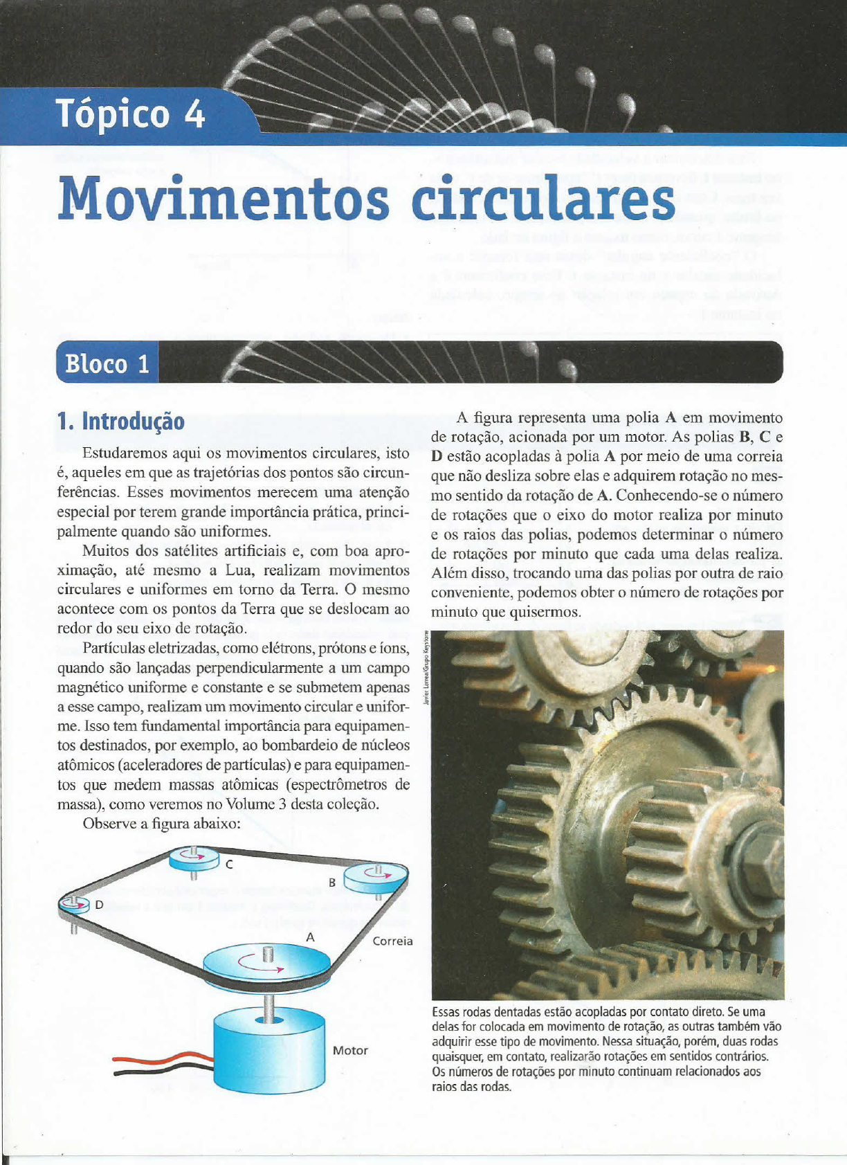 Tópico 4 Movimentos circulares Bloco 1 1. Introdução A figura representa uma polia A em movimento de rotação, acionada por um motor. As polias B, C e Estudaremos aqui os movimentos circulares, isto D estão acopladas à polia A por meio de uma correia é, aqueles em que as trajetórias dos pontos são circun- que não desliza sobre elas e adquirem rotação no mes- ferências. Esses movimentos merecem uma atenção mo sentido da rotação de A. Conhecendo-se o número especial por terem grande importância prática, princi- de rotações que o eixo do motor realiza por minuto palmente quando são uniformes. e os raios das polias, podemos determinar o número Muitos dos satélites artificiais e, com boa apro- de rotações por minuto que cada uma delas realiza. ximação, até mesmo a Lua, realizam movimentos Além disso, trocando uma das polias por outra de raio circulares e uniformes em torno da Terra. mesmo conveniente, podemos obter o número de rotações por acontece com os pontos da Terra que se deslocam ao minuto que quisermos. redor do seu eixo de rotação. Partículas eletrizadas, como elétrons, prótons e quando são lançadas perpendicularmente a um campo magnético uniforme e constante e se submetem apenas a esse campo, realizam um movimento circular e unifor- me. Isso tem fundamental importância para equipamen- tos destinados, por exemplo, ao bombardeio de núcleos atômicos (aceleradores de partículas) e para equipamen- tos que medem massas atômicas (espectrômetros de massa), como veremos no Volume 3 desta coleção. Observe a figura abaixo: B D A Correia Essas rodas dentadas estão acopladas por contato direto. Se uma delas for colocada em movimento de rotação, as outras também vão adquirir esse tipo de movimento. Nessa situação, porém, duas rodas Motor quaisquer, em contato, realizarão rotações em sentidos contrários. Os números de rotações por minuto continuam relacionados aos raios das rodas.Tópico 4 Movimentos circulares 79 2. 0 enfoque angular 3. Espaço angular ou fase estudo descritivo dos movimentos foi feito, Considere uma partícula em movimento numa cir- até aqui, por meio das grandezas escalares espaço cunferência de raio R ocupando a posição indicada na (s), velocidade escalar média (vm) e instantânea (v) figura no instante t. Seja um ponto de referência e aceleração escalar média (am) e instantânea adotado sobre a circunferência. Podemos chamar todas essas grandezas de lineares, A posição dessa partícula no instante t pode ser pois suas definições provêm, direta ou indiretamen- dada, como sabemos, pelo espaço linear S. No en- te, de medidas de comprimento. Assim, podemos di- tanto, essa posição também fica determinada pelo zer espaço linear, velocidade escalar linear (média ângulo Q fi), de vértice no centro da circunfe- ou instantânea) e aceleração escalar linear (média ou rência, marcado a partir da reta r até o raio que pas- instantânea). sa pela partícula. Vamos medir esse ângulo no sen- Quando, porém, estudamos movimentos circula- tido do movimento da partícula e convencionar que, res, torna-se útil acrescentar as definições das gran- desse modo, sua medida seja dada por um número dezas escalares angulares, isto é, grandezas escalares positivo. definidas, direta ou indiretamente, a partir de medidas de ângulos. É o que faremos a seguir, mas, para tanto, t será necessário entender medidas de ângulos. S + Interessa-nos expressar a medida de um ângulo em graus e, principalmente, em radianos. Um grau é o ângulo correspondente a 1 do R 360 A seta à direita (com sinal +) ângulo de uma volta completa de uma circunferência. indica sentido que vamos usar Um radiano (rad) é a medida do ângulo central para determinar o ângulo Q. que determina na circunferência um arco cujo com- primento (l) é igual ao raio Um radiano corres- Esse ângulo Q é o espaço angular ou fase da par- ponde a aproximadamente tícula no instante t. Decorre, da definição do radiano, que um ângulo central qualquer (0: lê-se teta) fica determinado, em Espaço angular ou fase de uma partícula em radianos, pelo quociente do comprimento do arco que certo instante é o ângulo marcado no sentido do mo- ele "enxerga" pelo raio da circunferência (R). vimento, a partir do raio de referência até o raio que Assim, por exemplo, se o raio R da circunferên- passa pela partícula. cia for igual a 10 cm e o comprimento for igual a 30 cm, teremos: l rad R Relação entre espaço angular e Observe que a unidade radiano não tem nenhuma espaço linear dimensão física, uma vez que corresponde ao quo- Lembrando da determinação de um ângulo em ra- ciente de um comprimento por outro comprimento. dianos, temos: Poderíamos até escrever 3 em vez de 0 3 rad. No t entanto, esse procedimento não é conveniente, pois é mais importante que fique evidenciado o critério ado- S tado para determinar o ângulo. R 1 rad A Assim: R R espaço angular é igual ao espaço linear (s) di- vidido pelo raio (R) da circunferência: em rad) em radianos)80 PARTE I - CINEMÁTICA 4. Velocidade escalar angular Assim: Velocidade escalar média angular A velocidade escalar média angular é igual à velocidade escalar média linear (vm) dividida pelo raio Considere agora as posições que uma partícu- (R) da circunferência: la móvel ocupa numa circunferência nos instantes R As Q Velocidade escalar instantânea R o angular A relação que acabamos de obter para as veloci- dades médias também vale para as instantâneas. Entre os instantes a partícula sofre um des- Assim, temos: locamento escalar que pode ser dado linearmente por As ou angularmente por A velocidade escalar instantânea angular (w) é igual à velocidade escalar instantânea linear (v) dividi- da pelo raio (R) da circunferência: Oquociente desse deslocamento angular pelo intervalo de tempo (At) em que ele ocorre é a velocida- de escalar média angular ómega m) nesse int